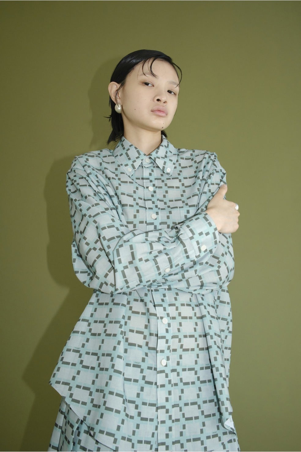 ルーズシルエットで仕上げたシャツ。前立てにはCLANE定番のサングラスやメガネを掛けられるタブを施しました。