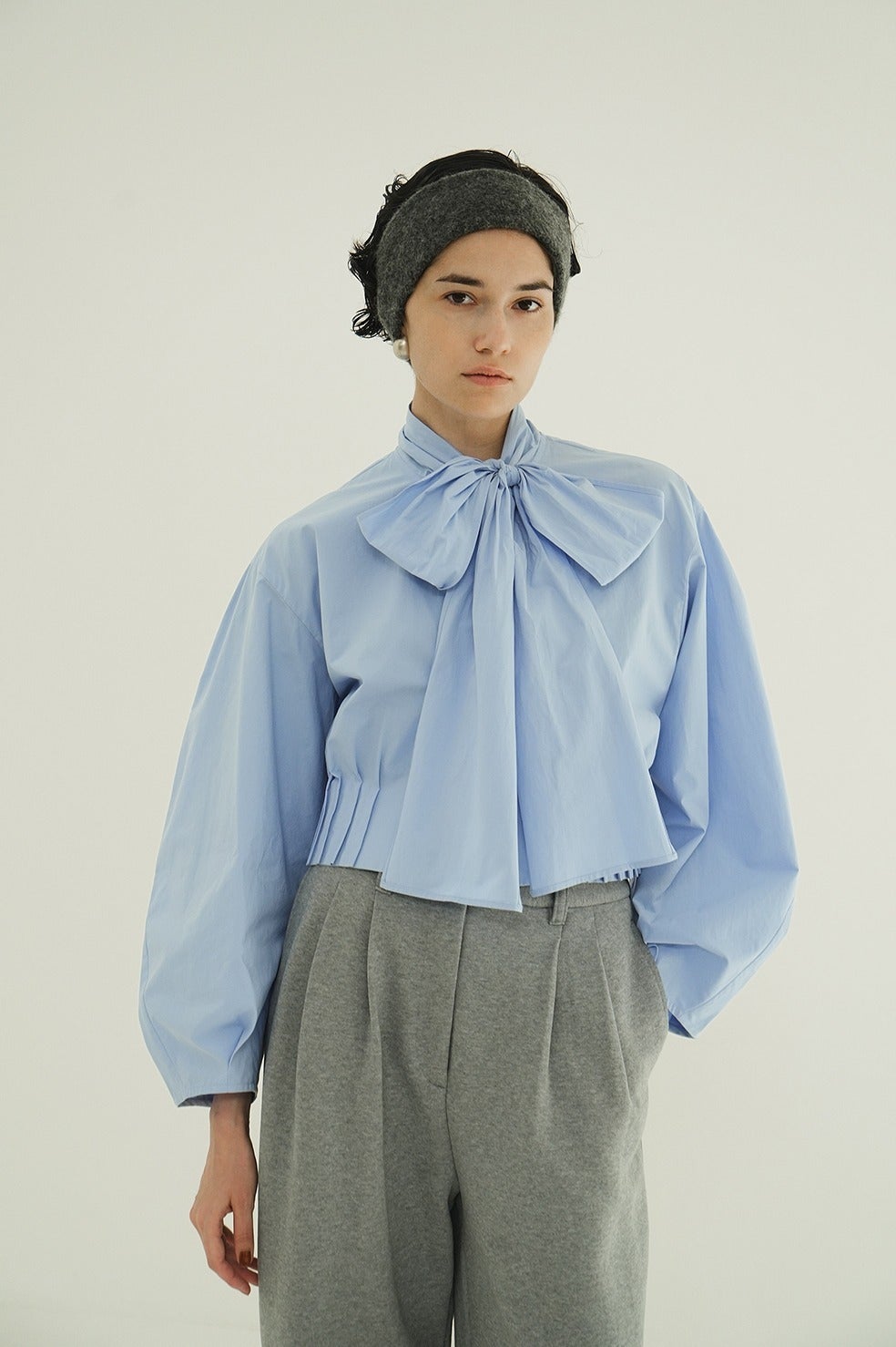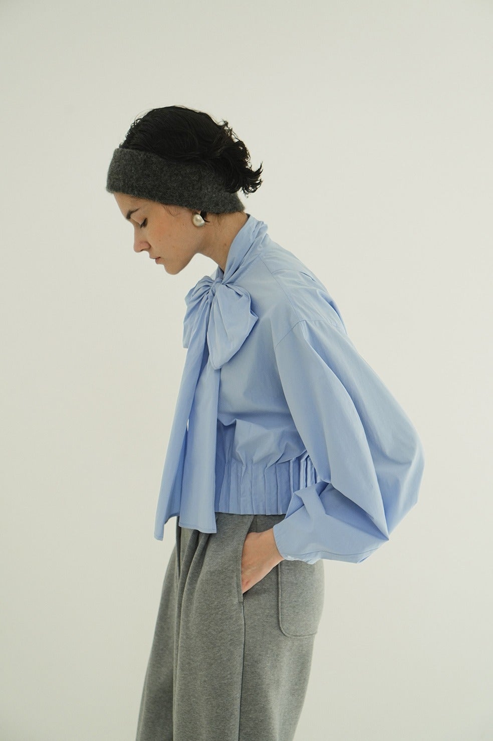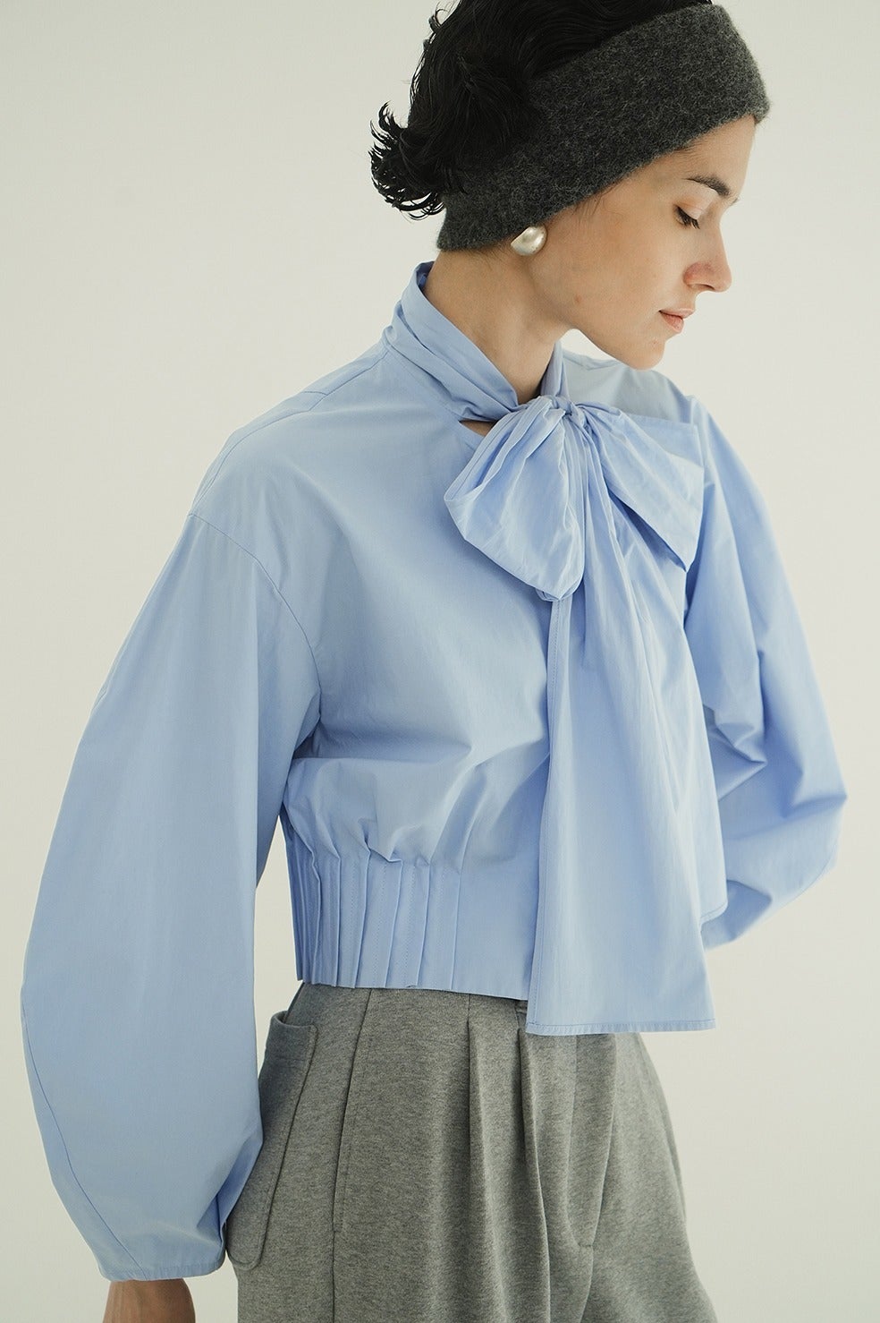 首元の大きなリボンがポイントで、高密度のしなやかなシャツ地で仕立てたブルゾン風シャツ。