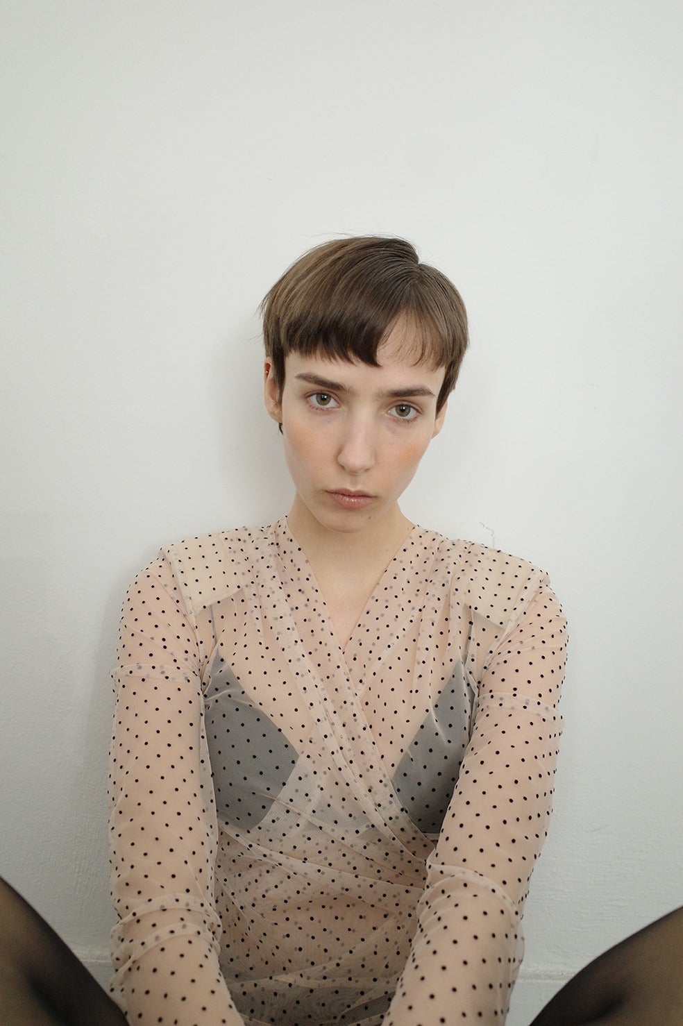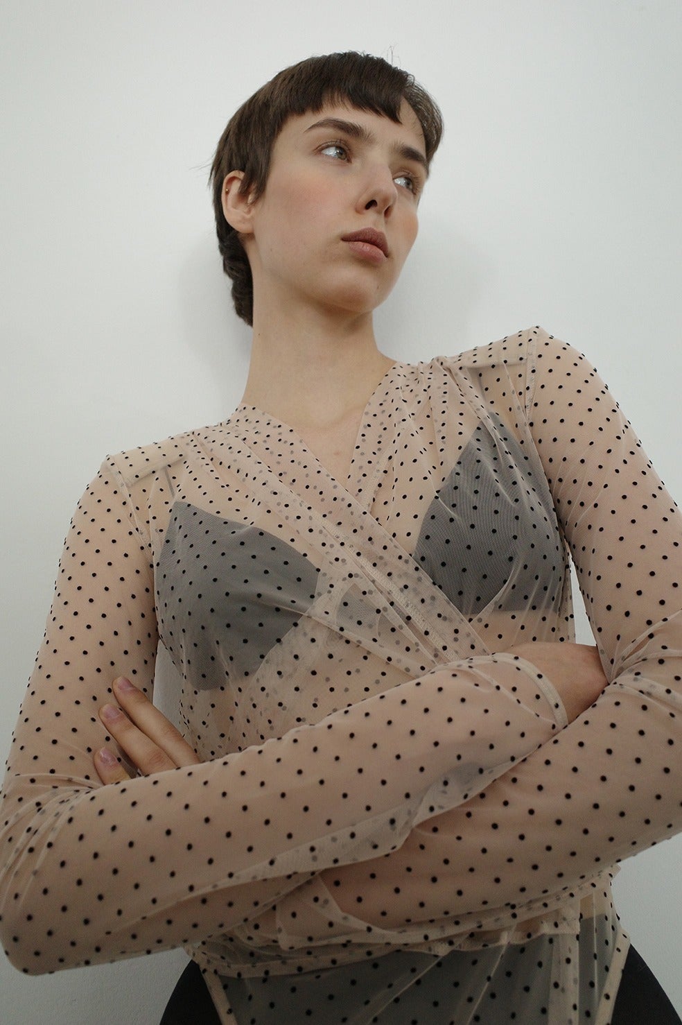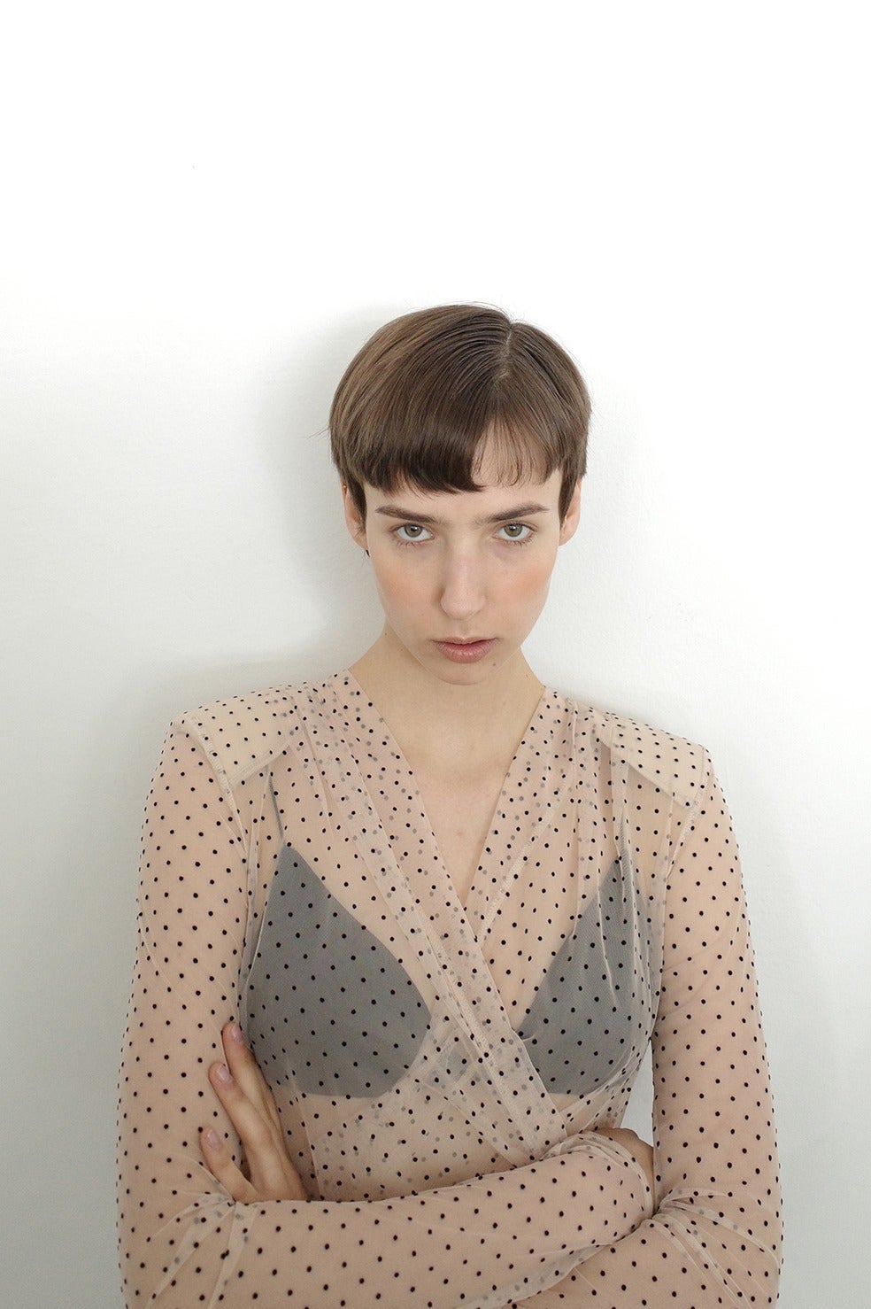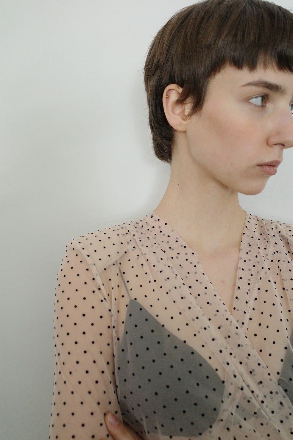 ドット柄はあまり主張しすぎないよう、小ぶりのフロッキー加工でモードな印象に仕上げました。シワが付きにくく、一枚ではもちろん、インナーとしても着用可能なのでロングシーズンお使いいただけます。