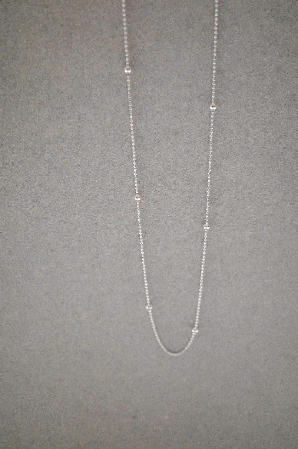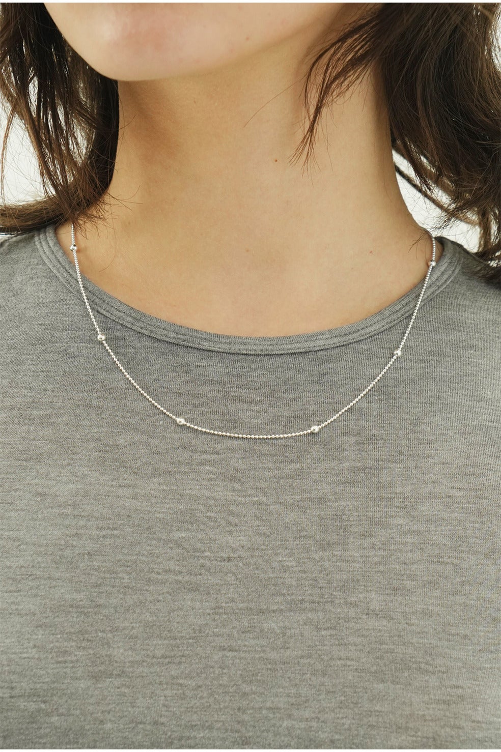 細かなシルバーボールが等間隔に並んだ、軽やかで華奢なチェーンネックレス。