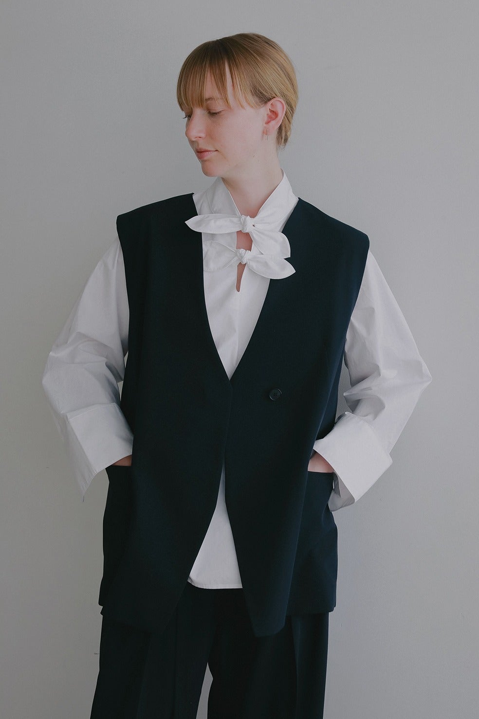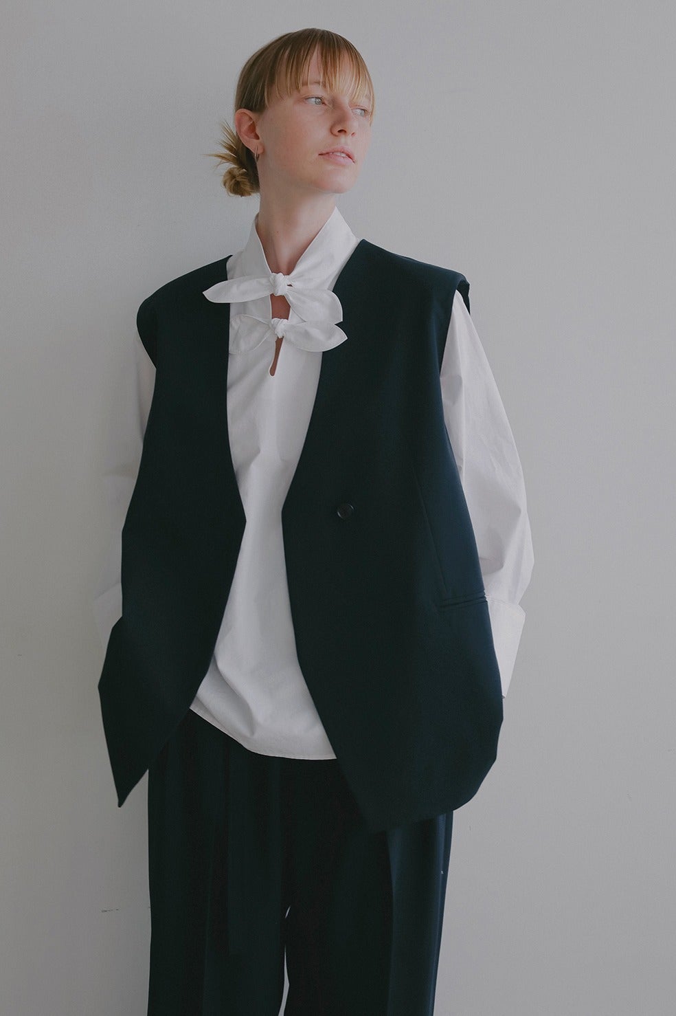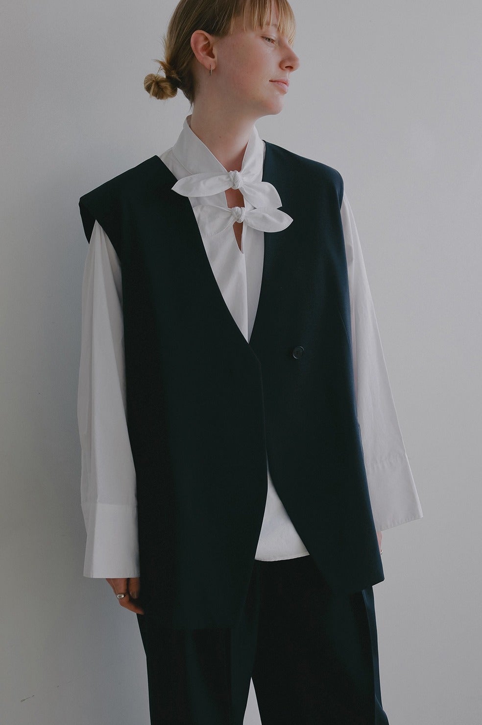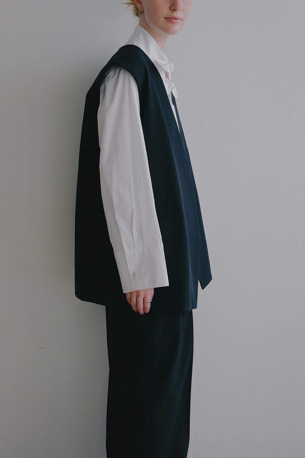 襟ぐりの曲線的なラインが特徴の、ほど良くゆとりのあるノーカラージレ。