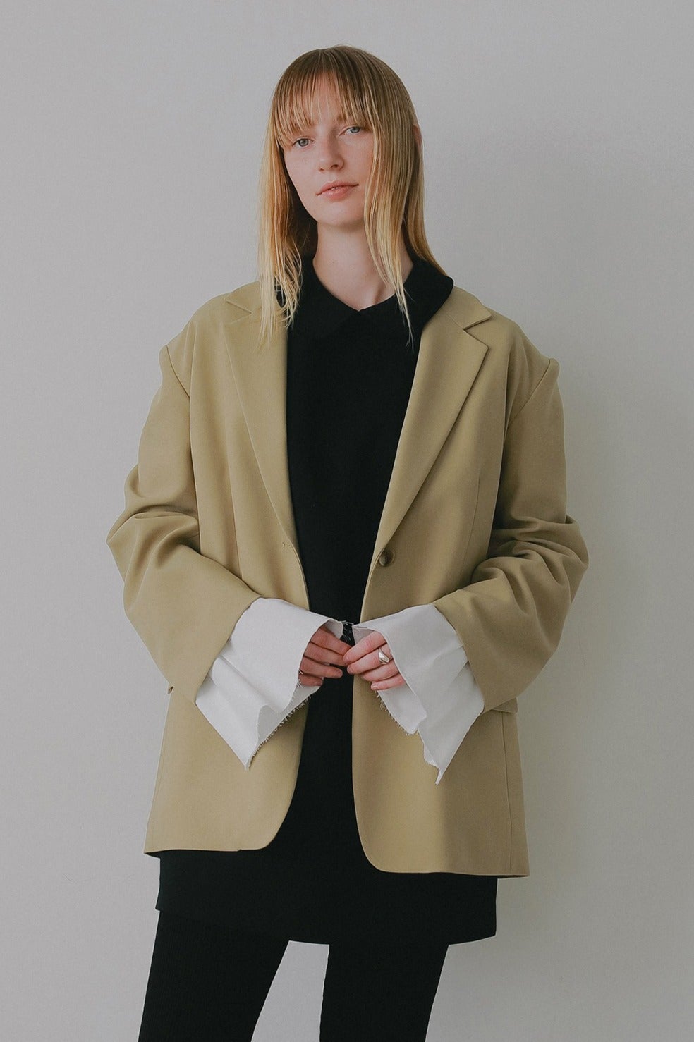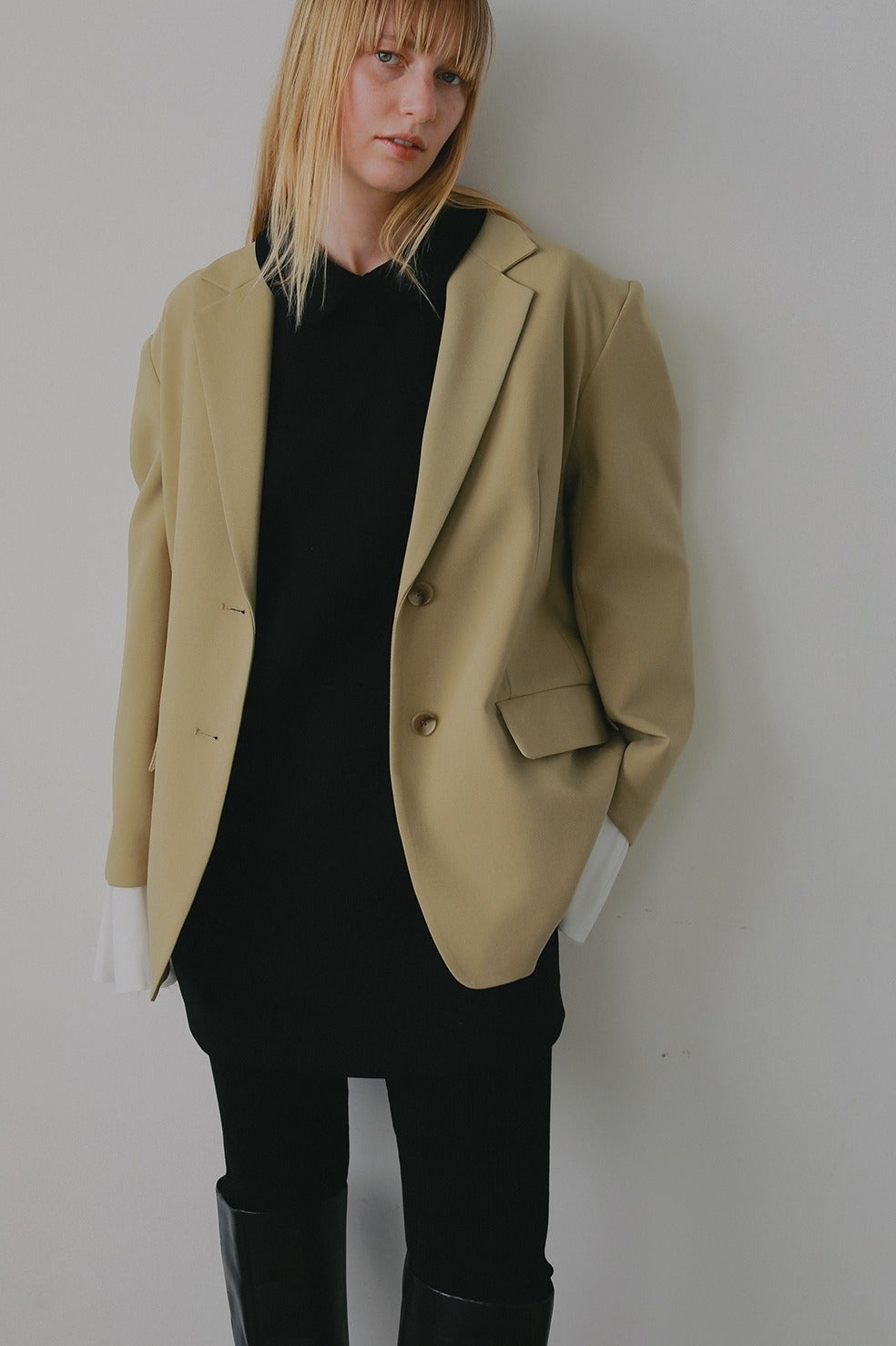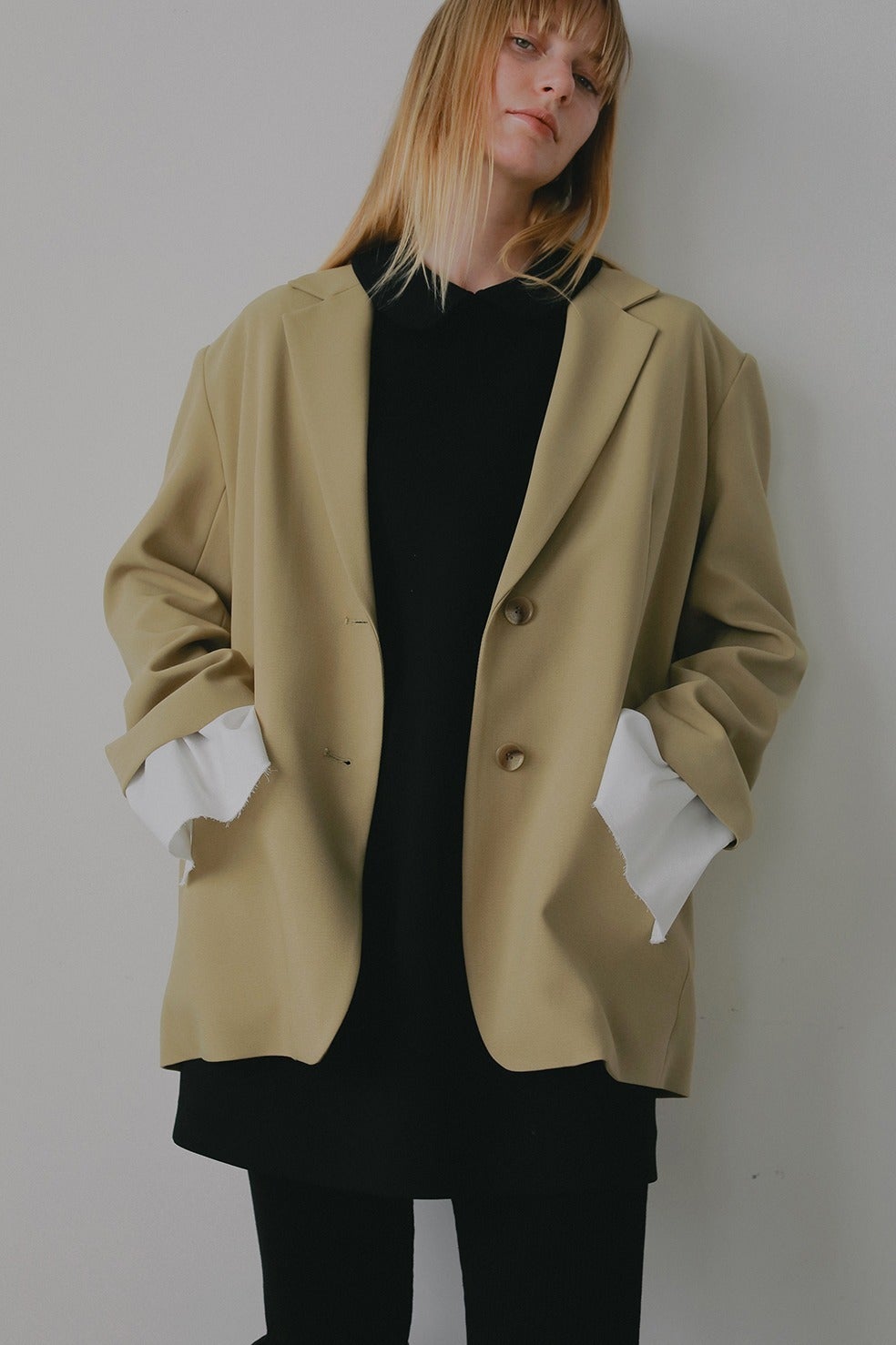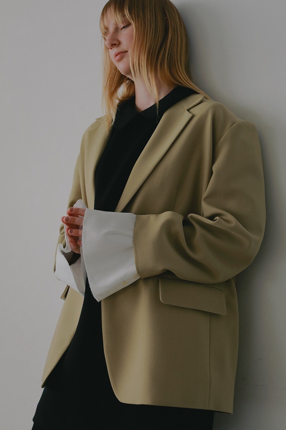 袖口に別布をあしらい、レイヤード風のニュアンスをプラスしたオーバーサイズジャケット。