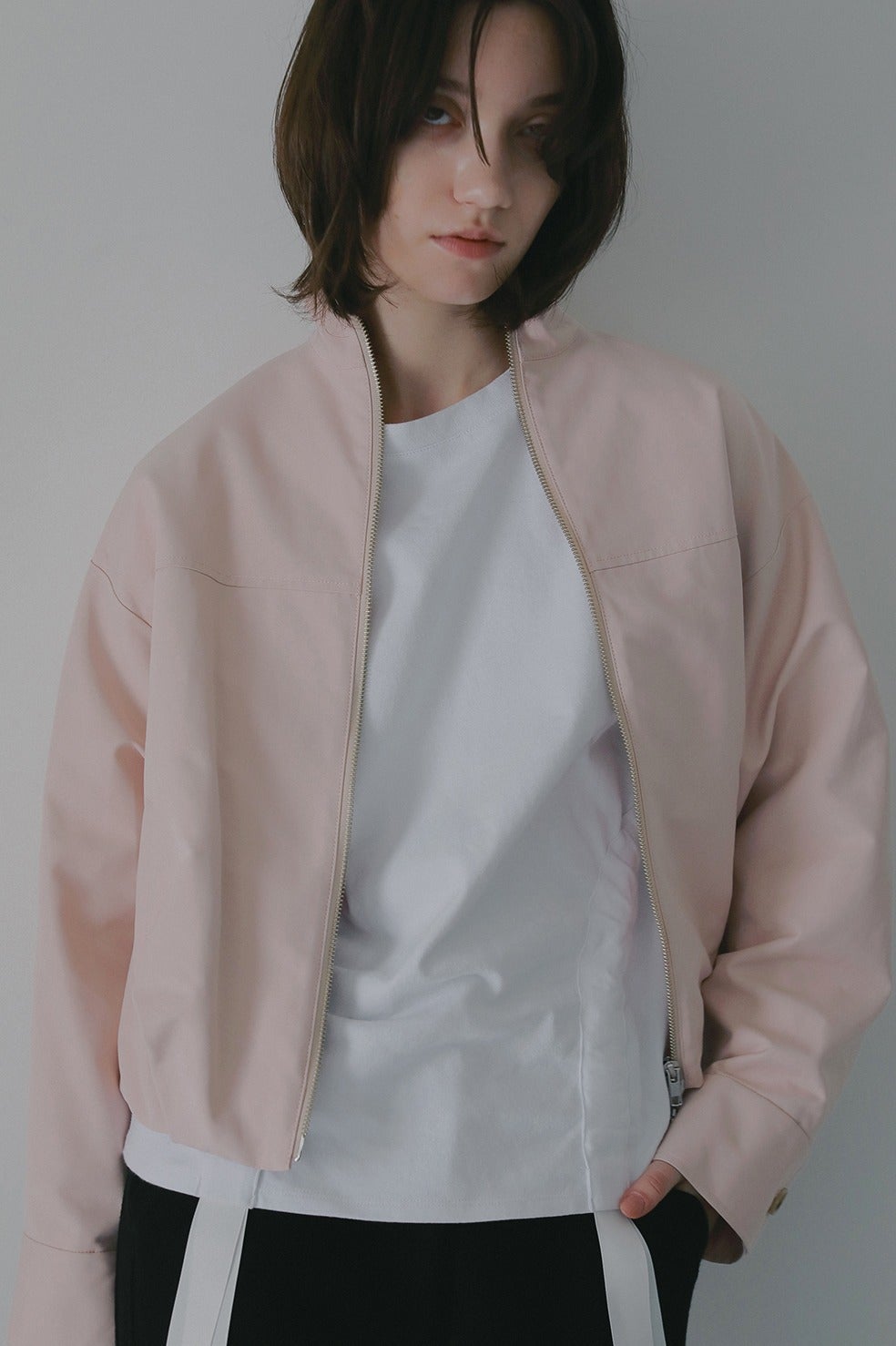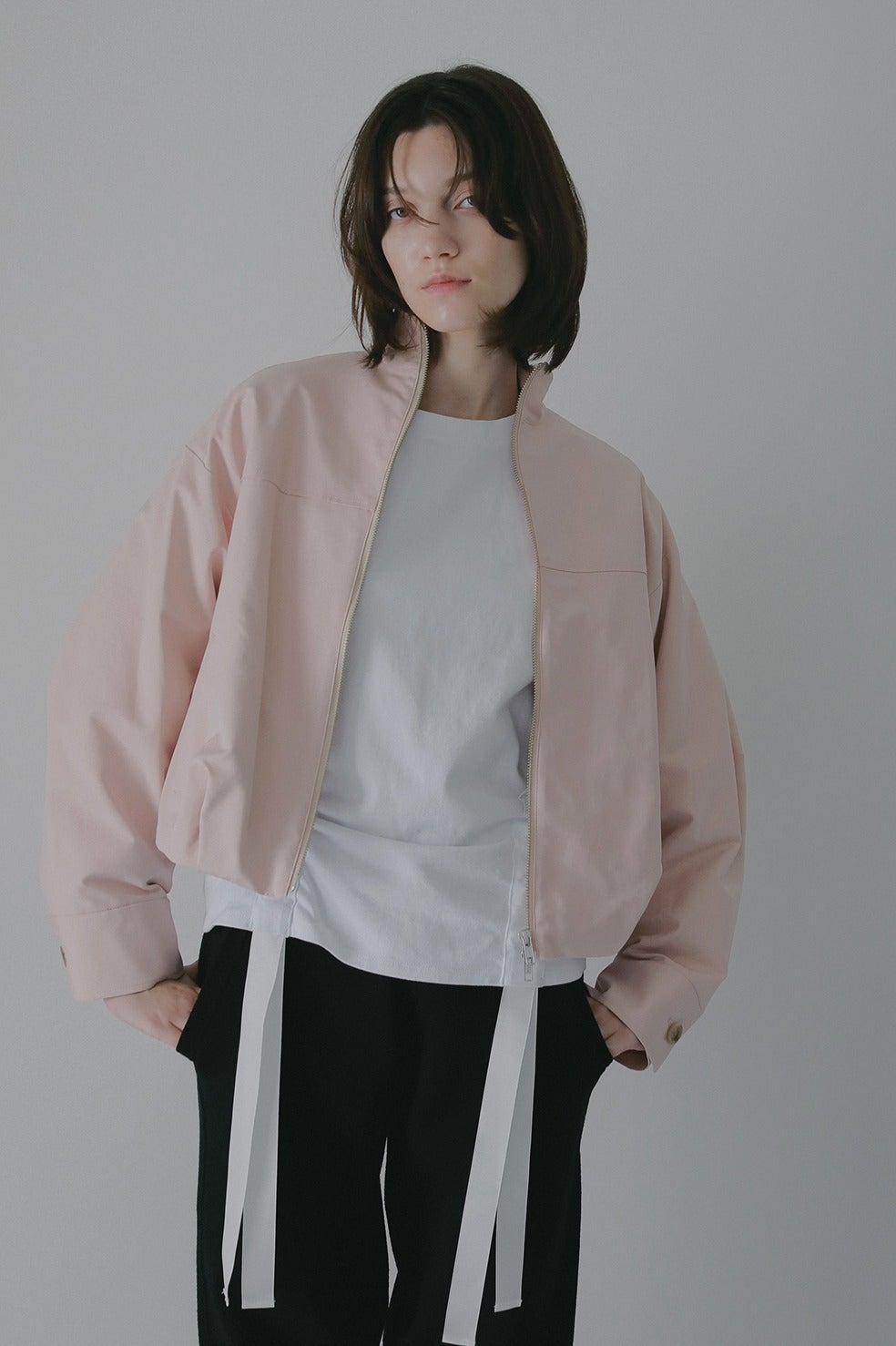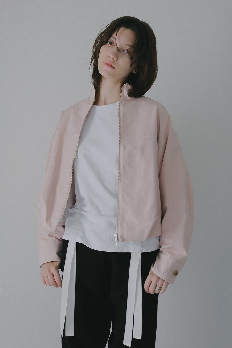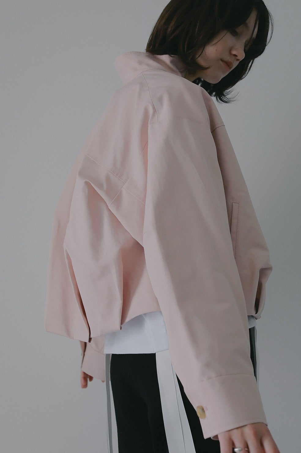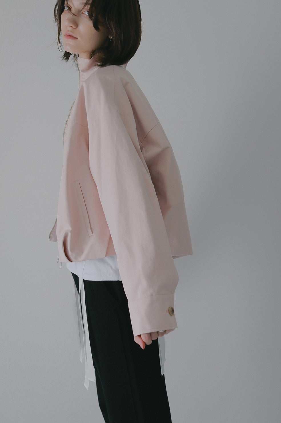 ショート丈にバルーンシルエットを掛け合わせ、太めの袖幅にスタンドカラーでモードなニュアンスをプラス。