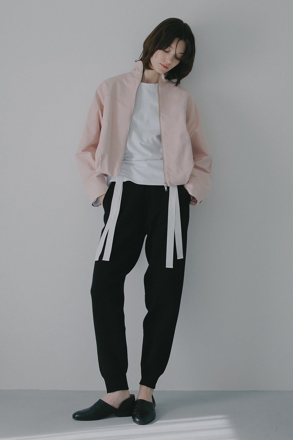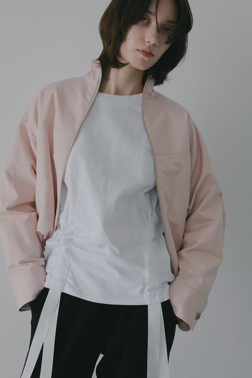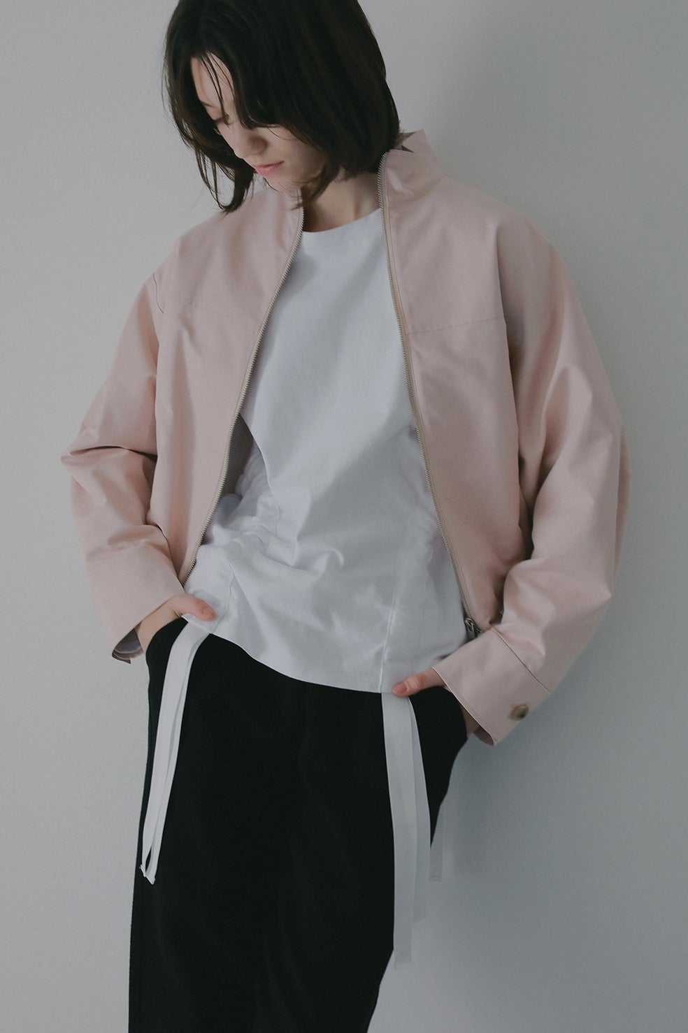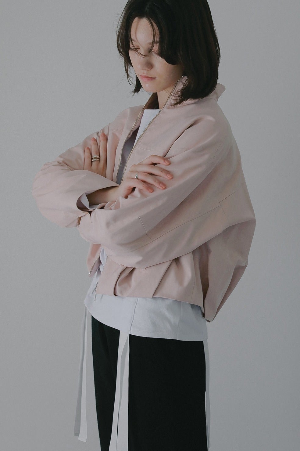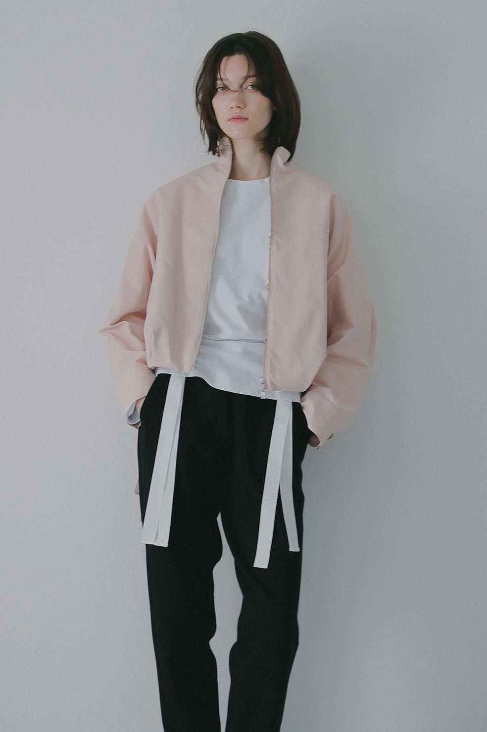 ショート丈にバルーンシルエットを掛け合わせ、太めの袖幅にスタンドカラーでモードなニュアンスをプラス。