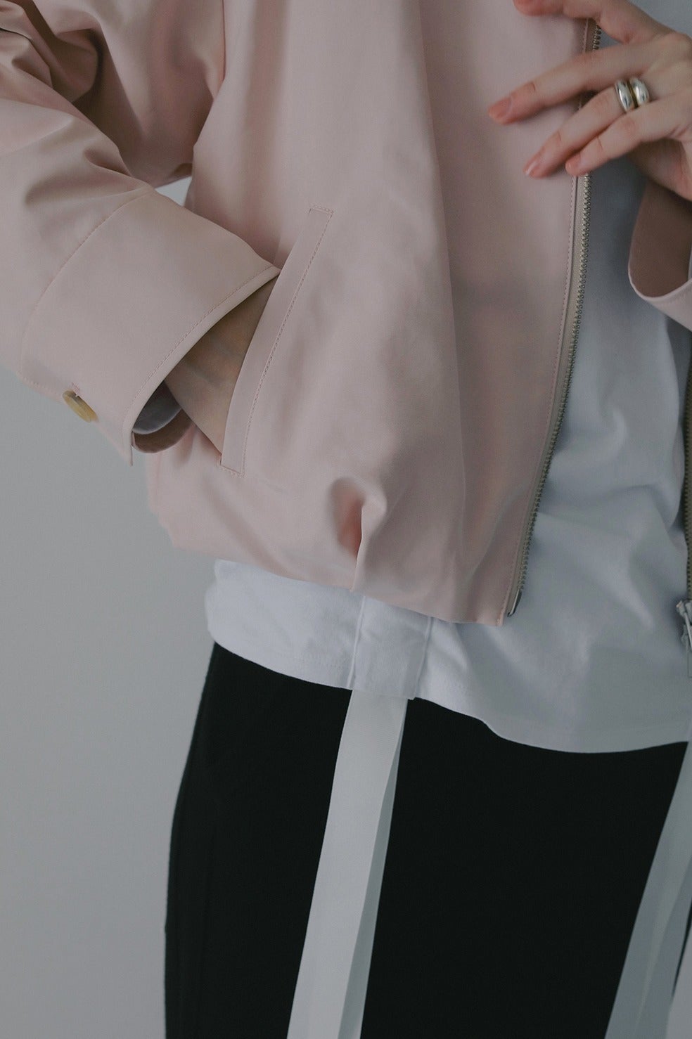 ダブルジップ仕様でレイヤードしやすく、シルバーのファスナーがシャープなアクセントに。