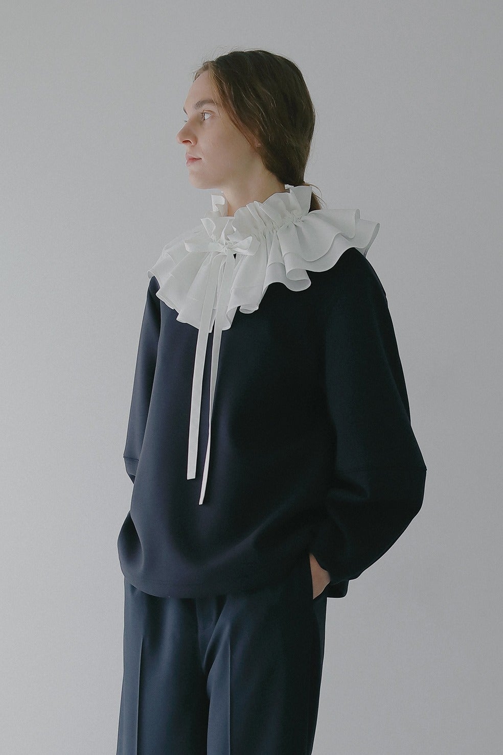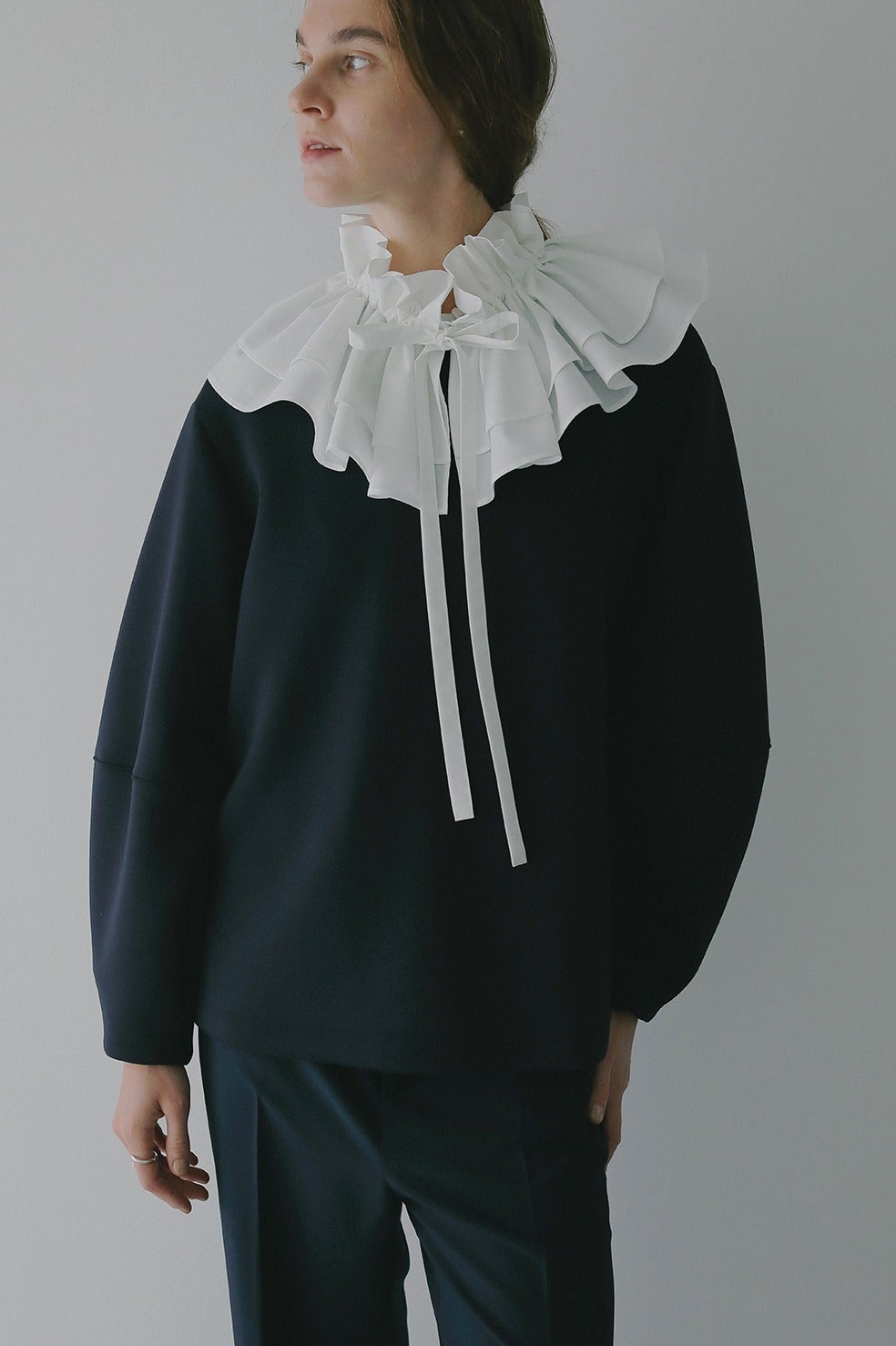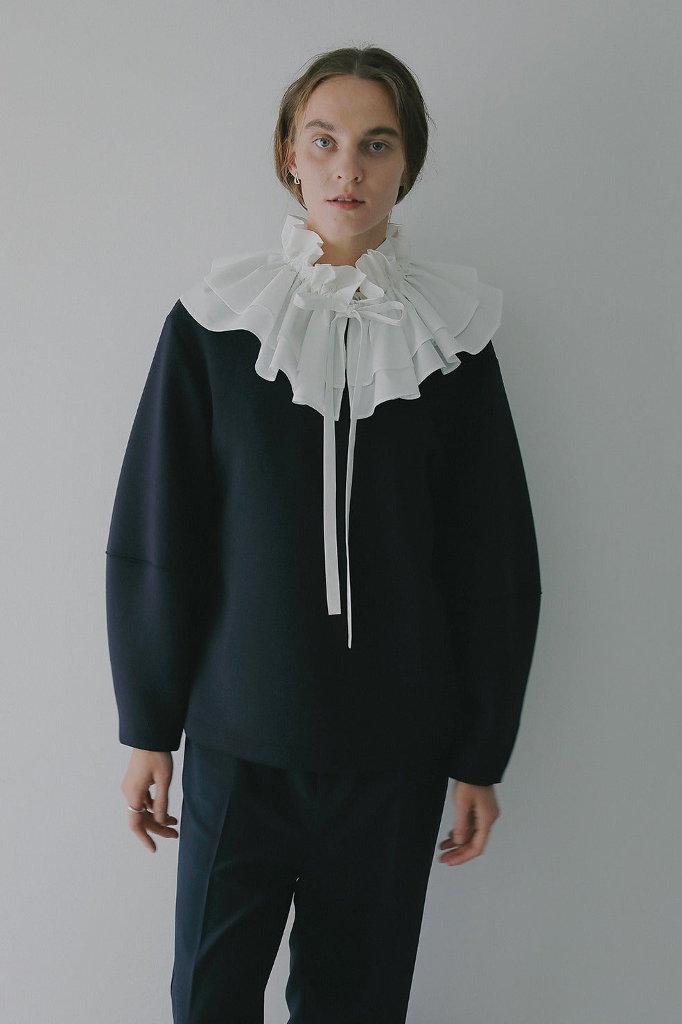 スッキリとしたクルーネックに構築的なボリュームスリーブがモードなニュアンス。