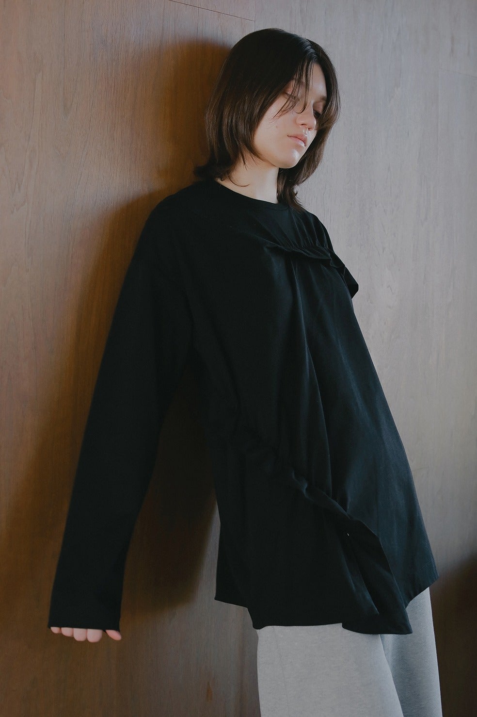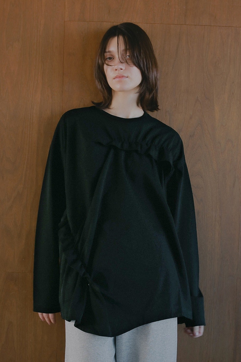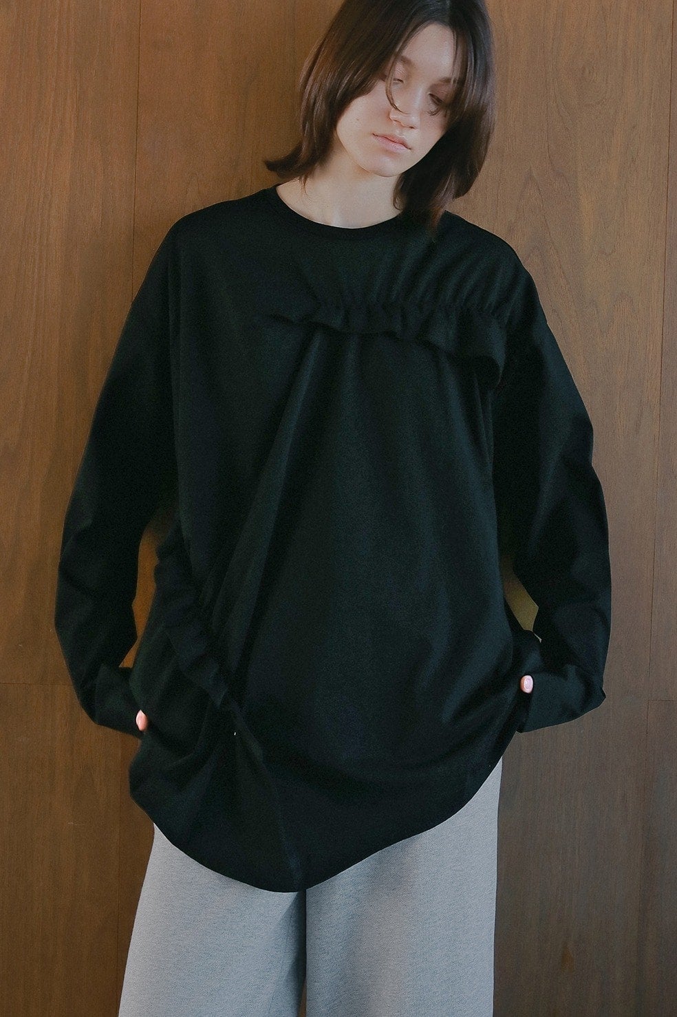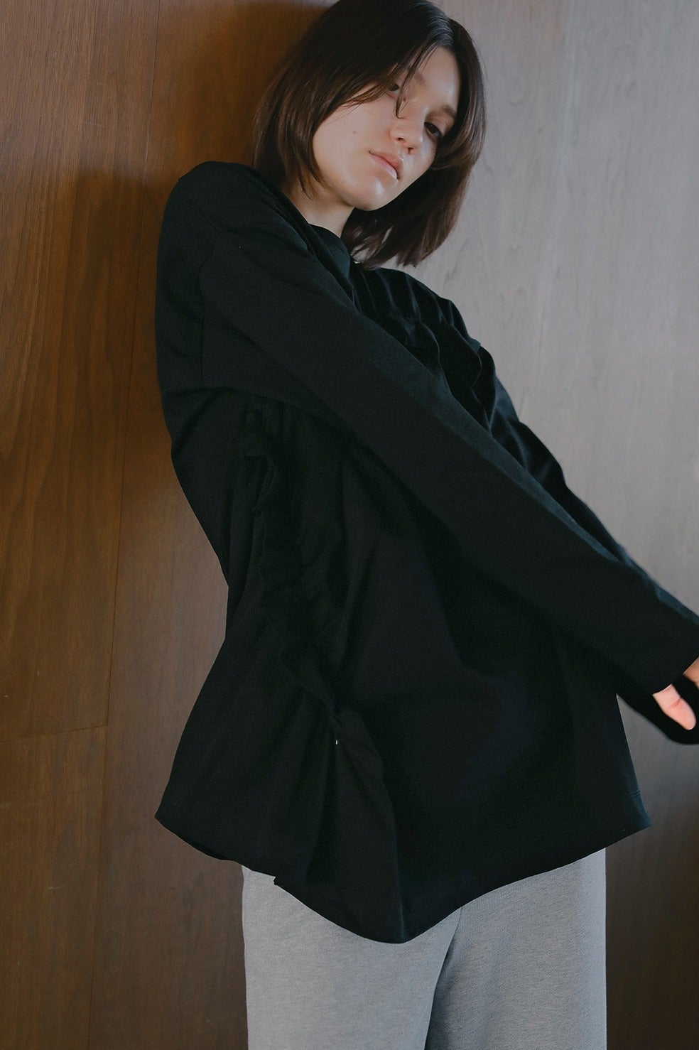 胸元とサイドにアシンメトリーなフリルを配したレディライクなディテールにあえてゆったりとしたシルエットと長めの袖丈で、甘すぎない大人なデザイントップスに。