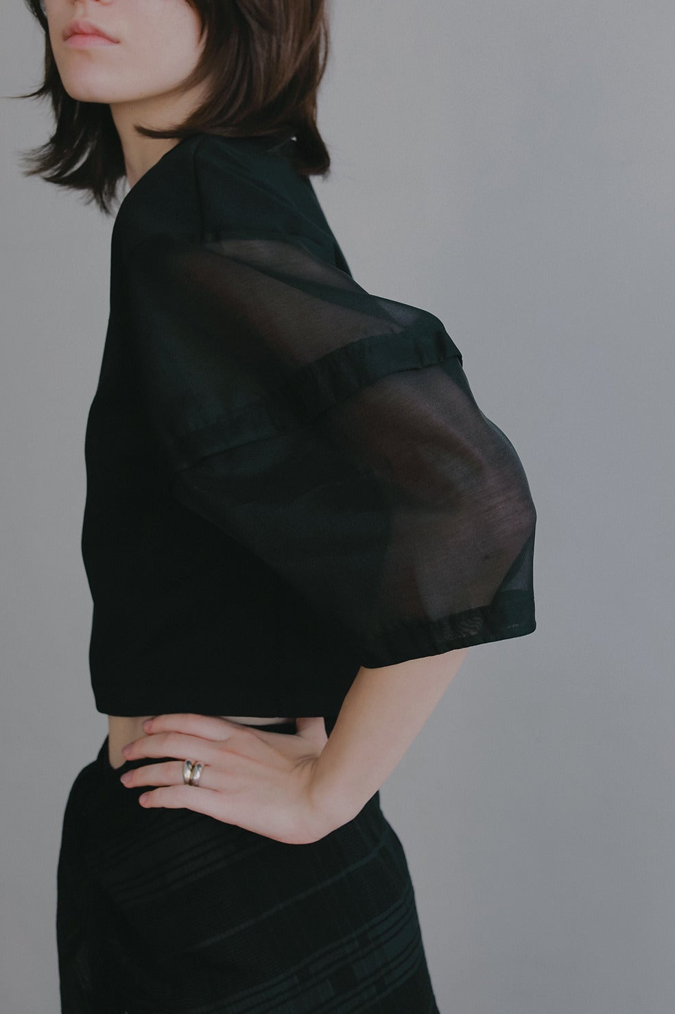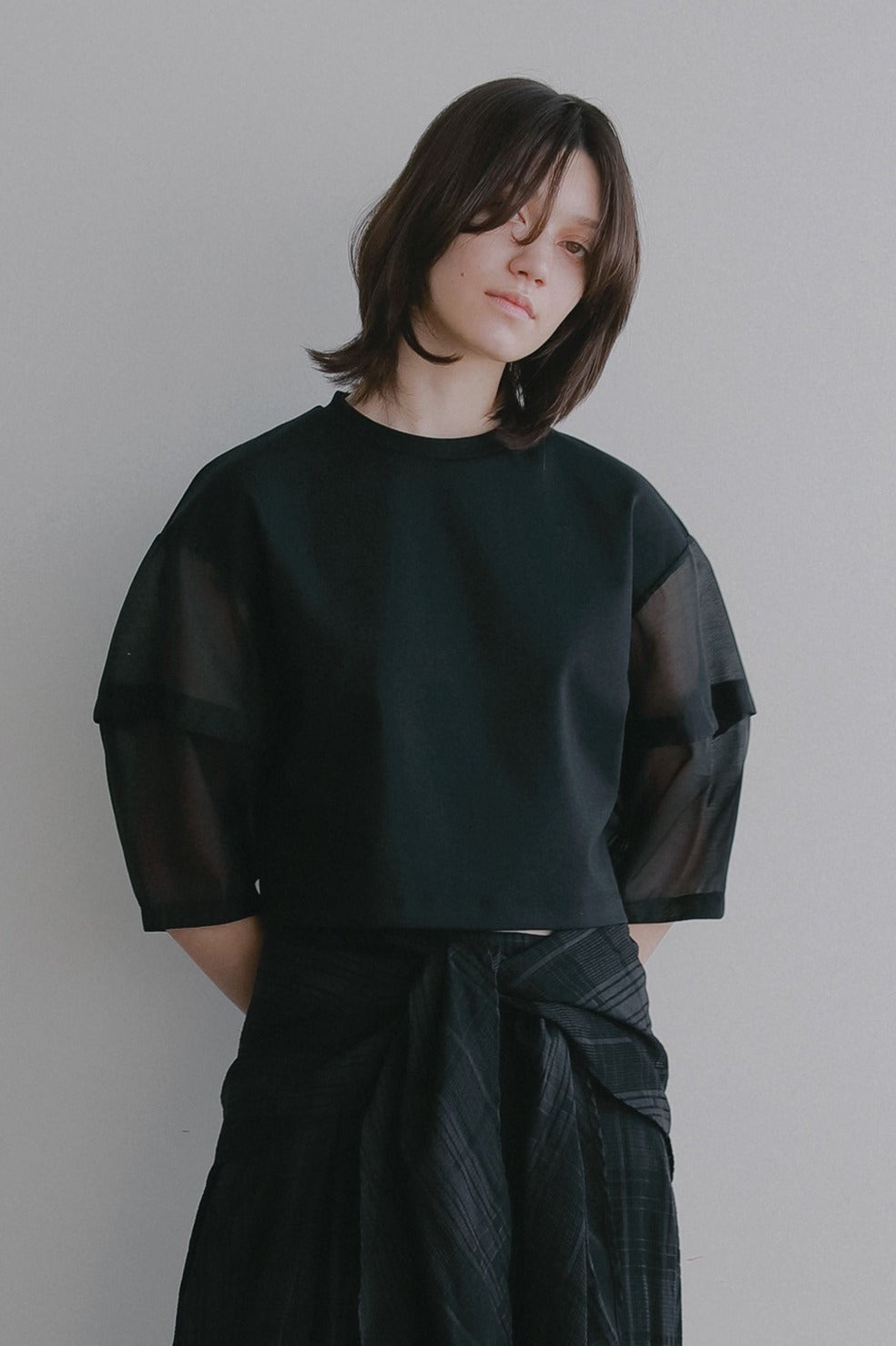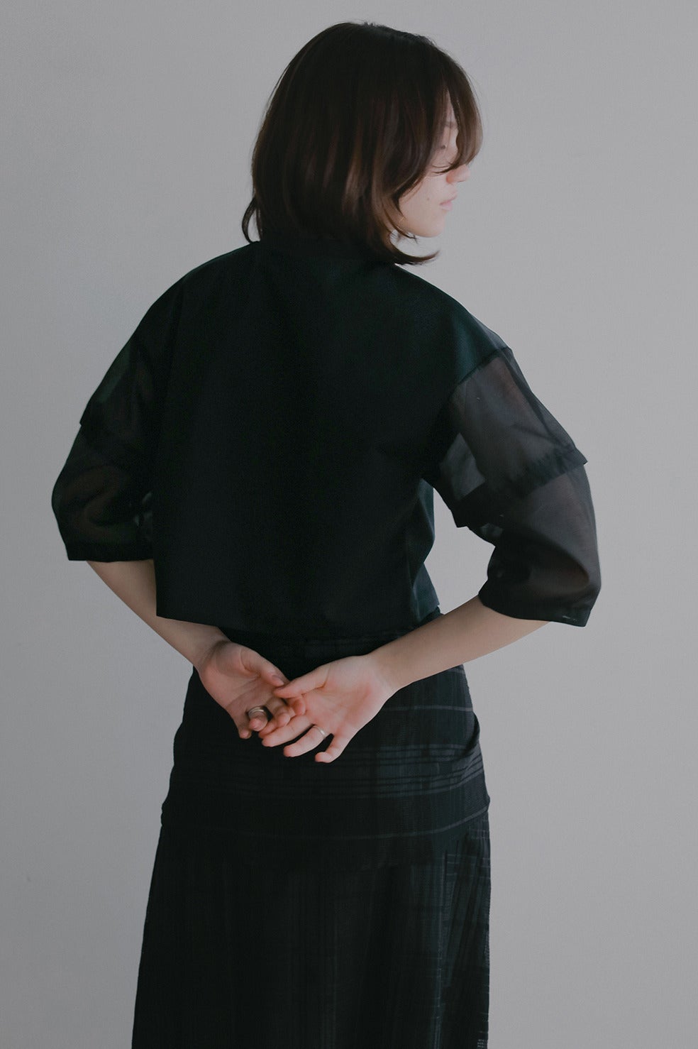 袖部分はほど良い光沢と繊細な透け感を持つシアー素材をドッキングし、軽やかでフェミニンな印象をプラスしました。
