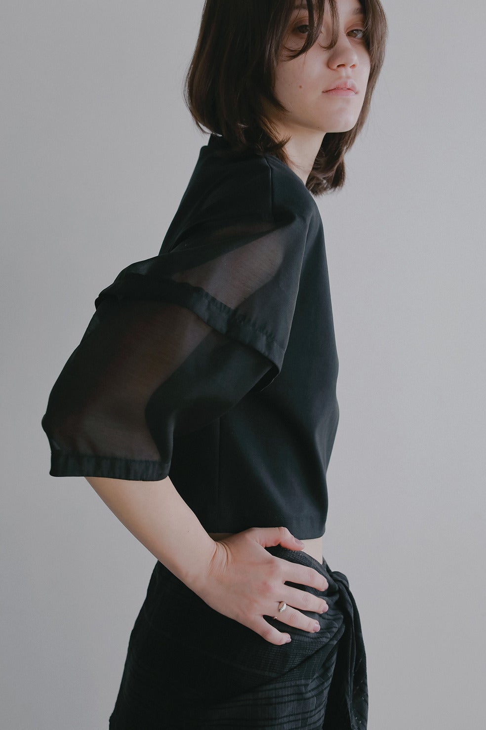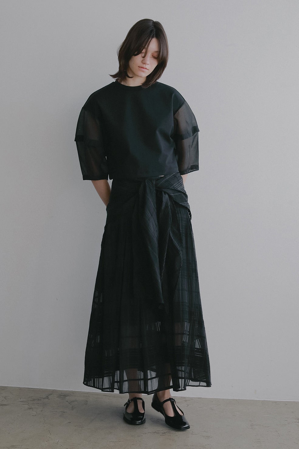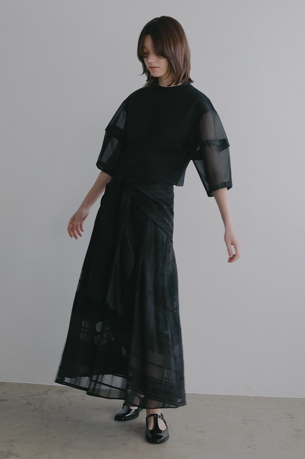袖部分はほど良い光沢と繊細な透け感を持つシアー素材をドッキングし、軽やかでフェミニンな印象をプラスしました。