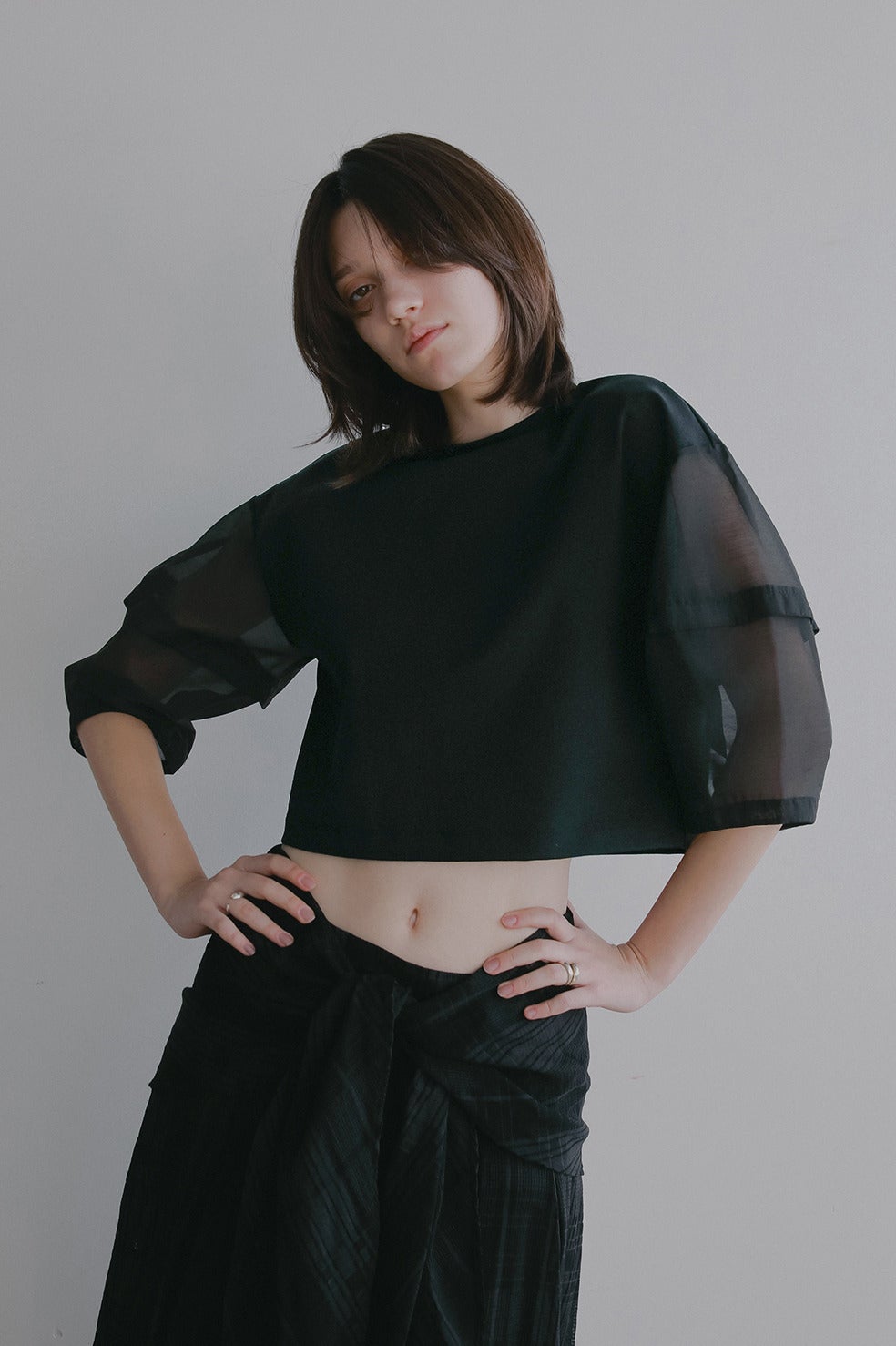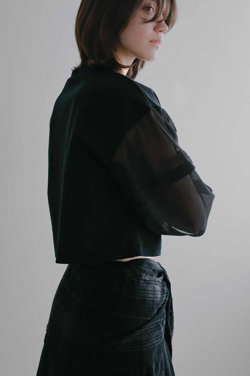 肩から袖にかけてランタンスリーブでボリュームを持たせ、身頃は裾に向かってコンパクトに仕上げたショート丈。
