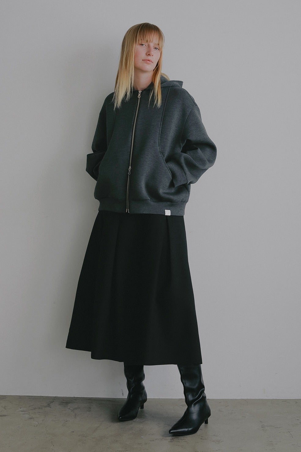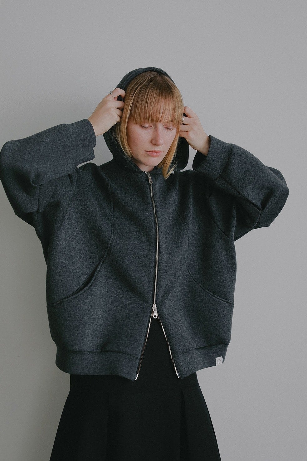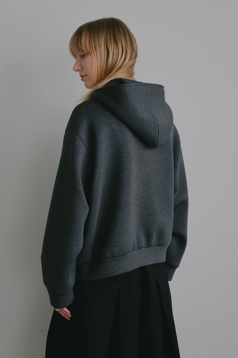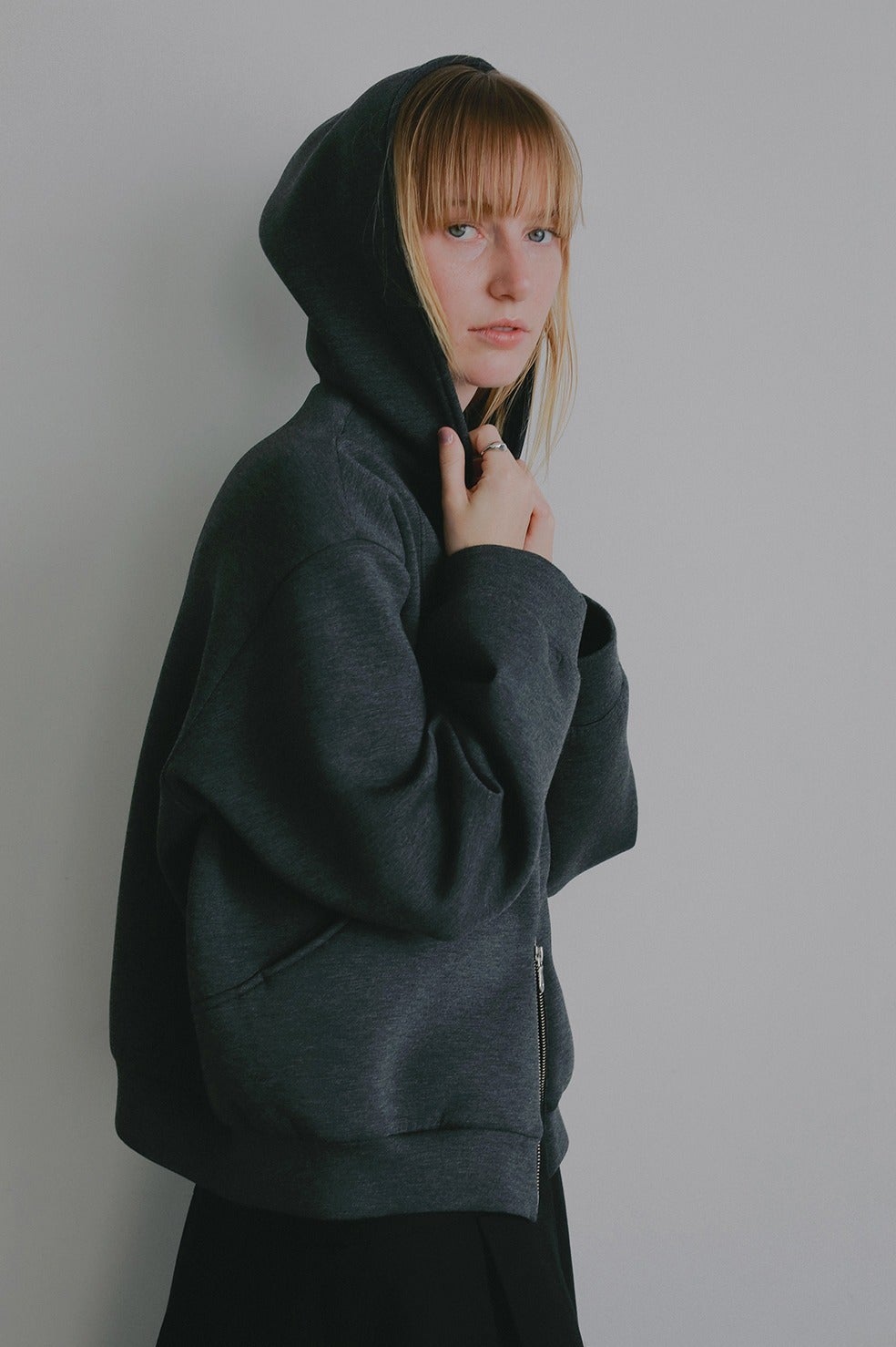 ふくらみのあるダンボール素材がきれいめな表面感の、ラフにならずモードな印象のフーディー。