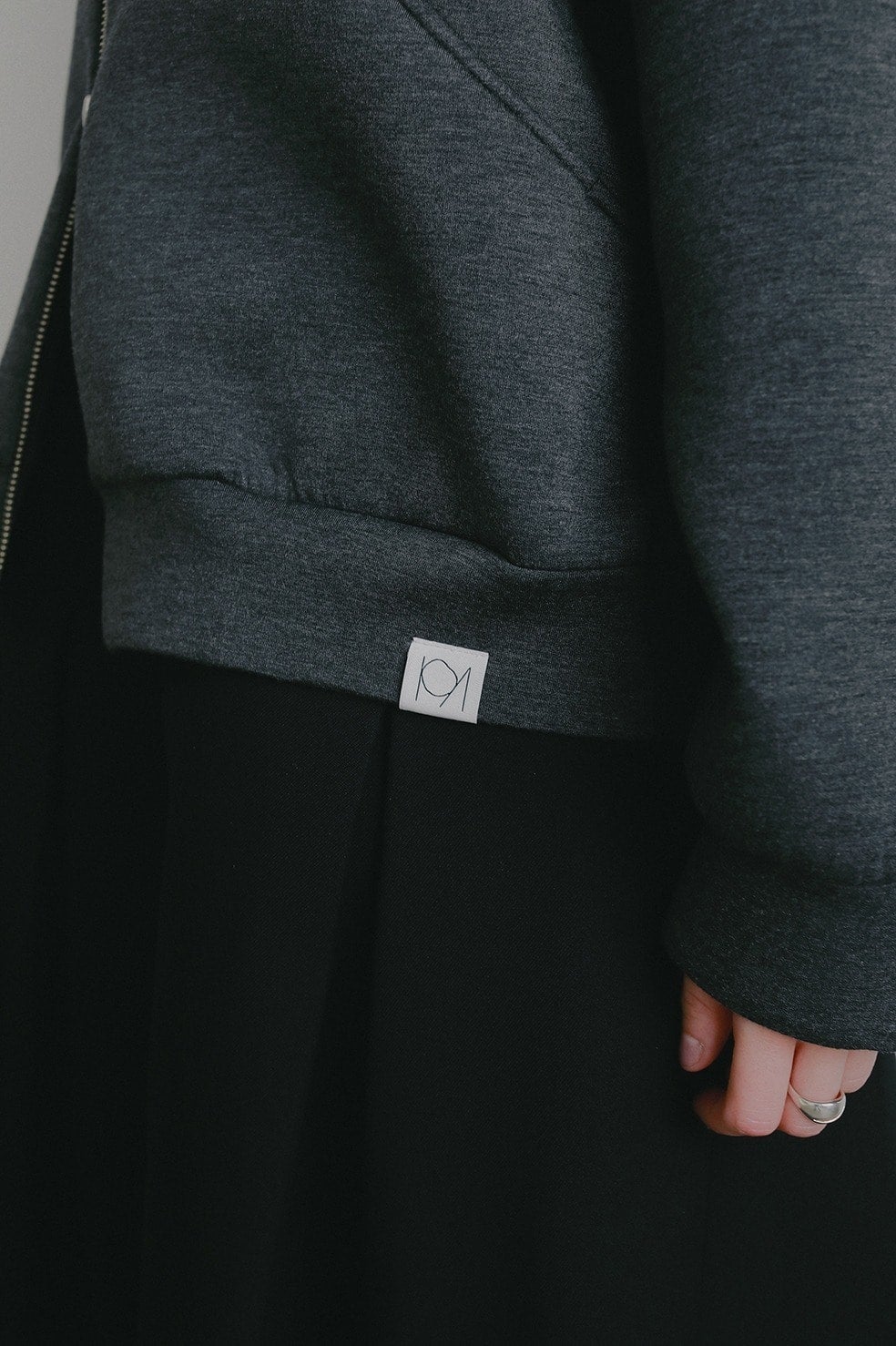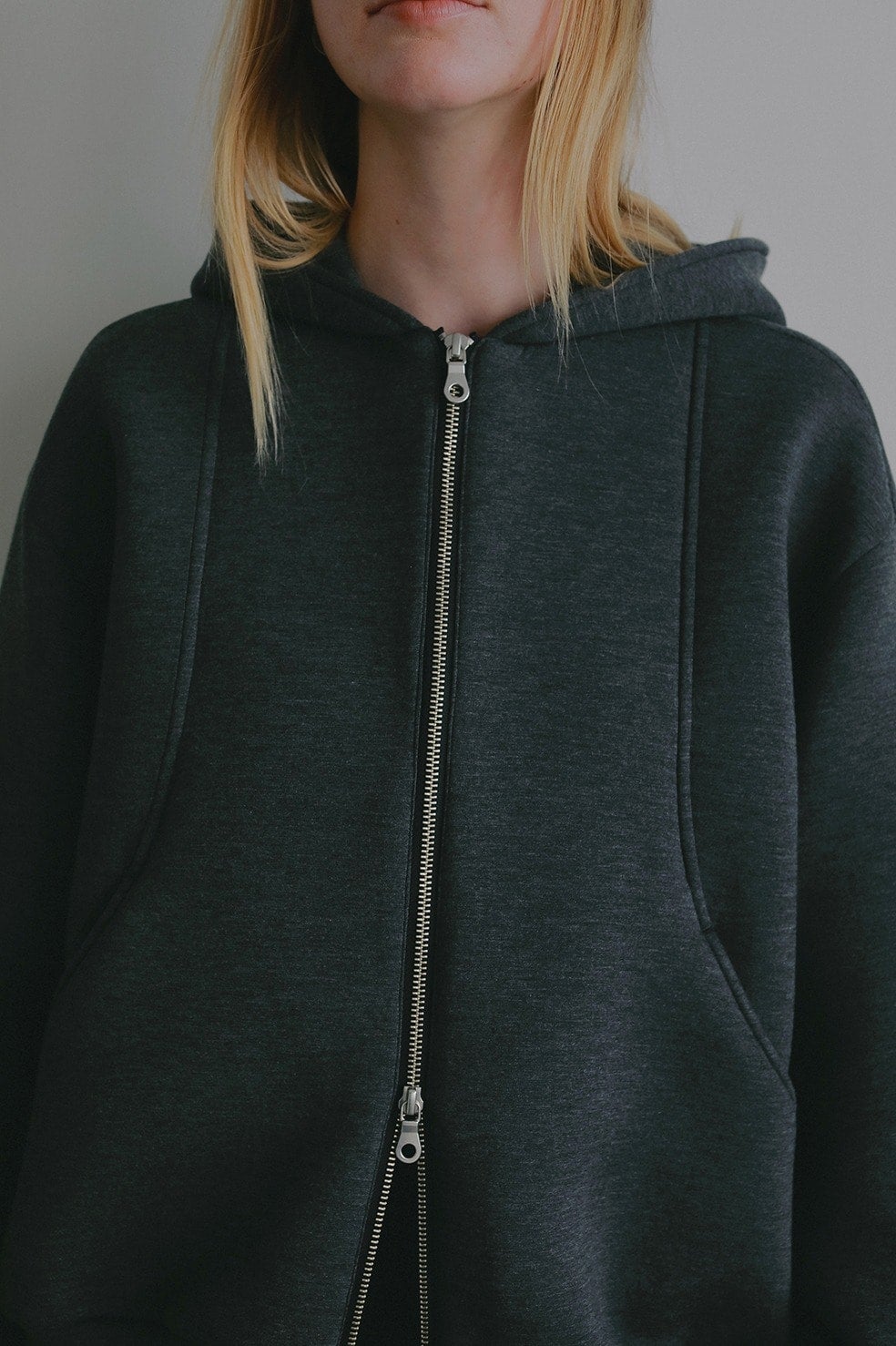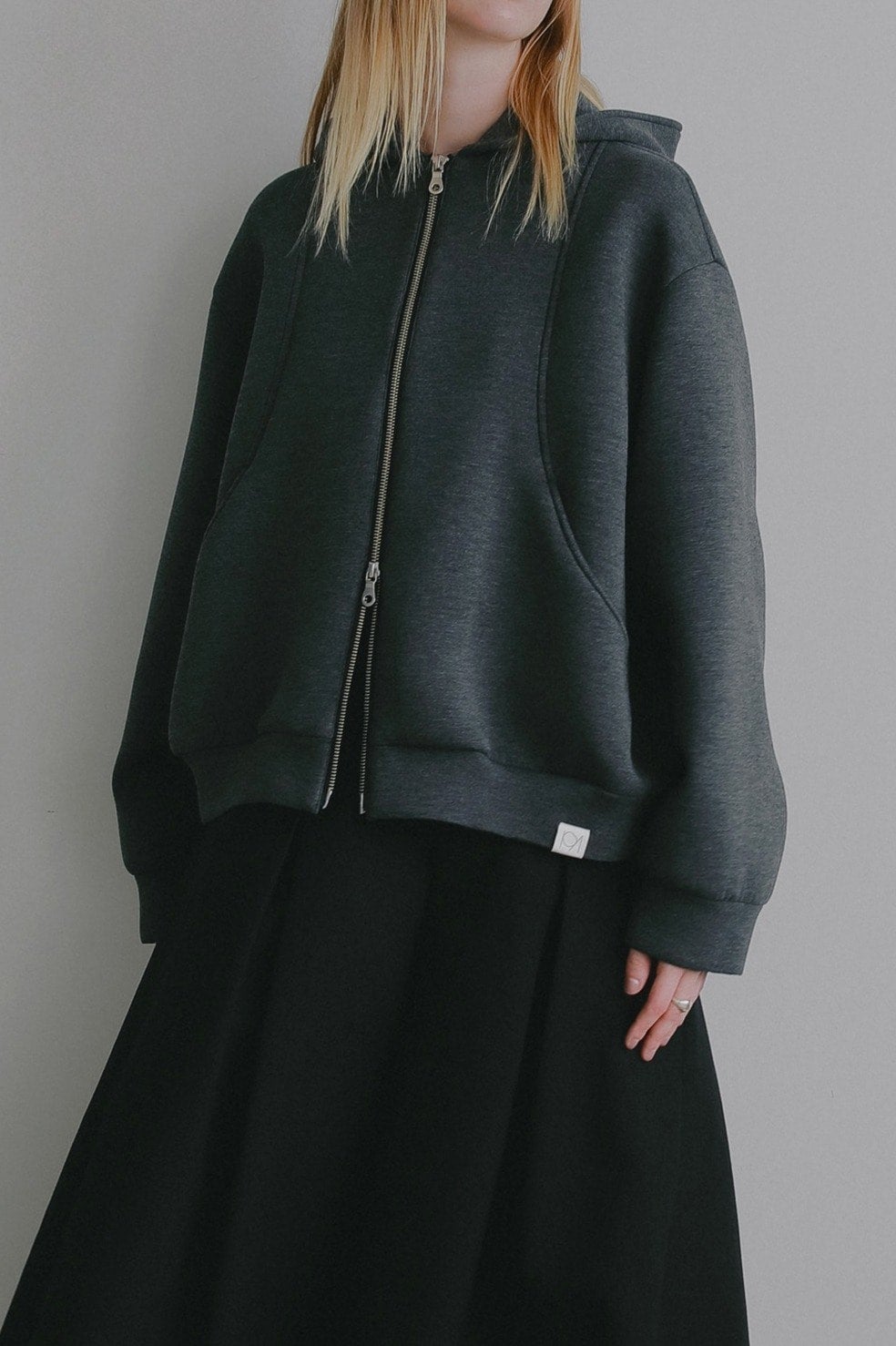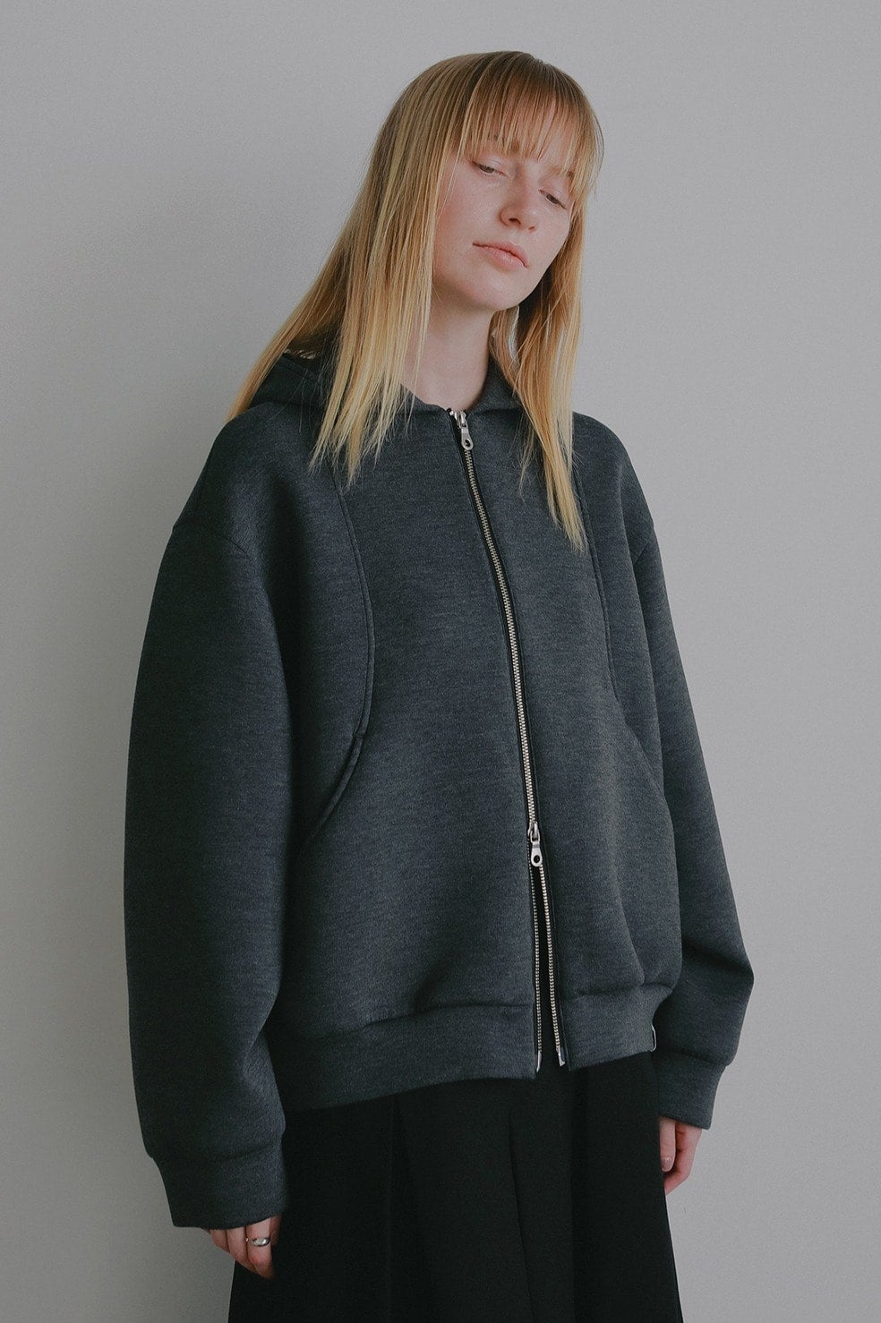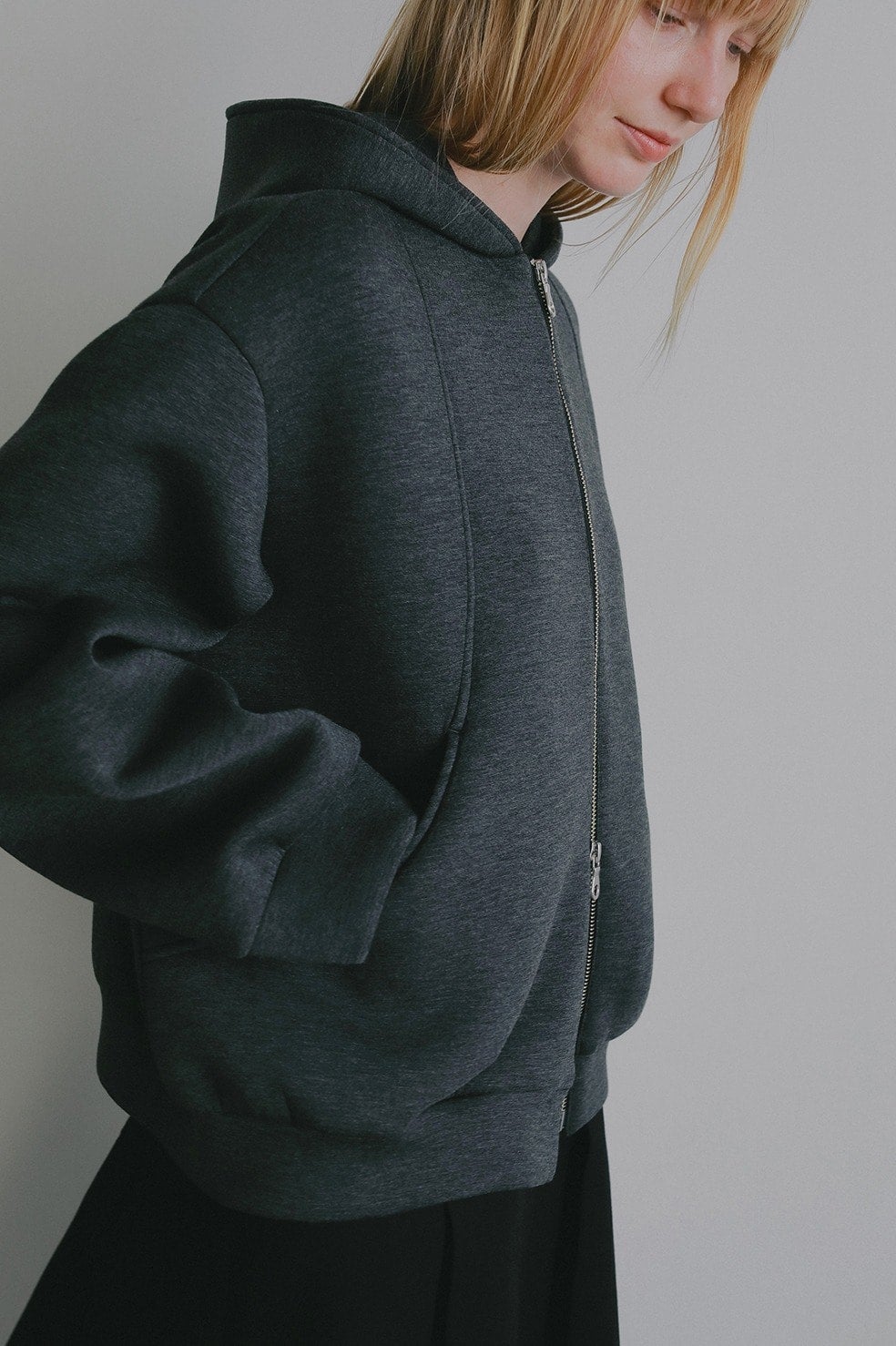 ふくらみのあるダンボール素材がきれいめな表面感の、ラフにならずモードな印象のフーディー。
