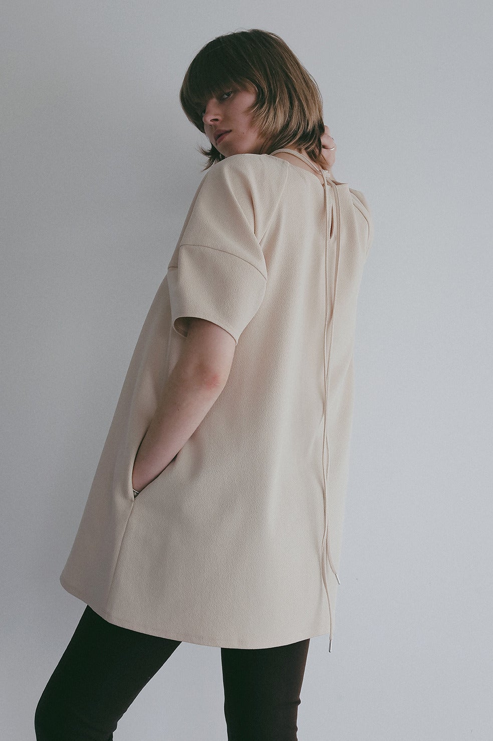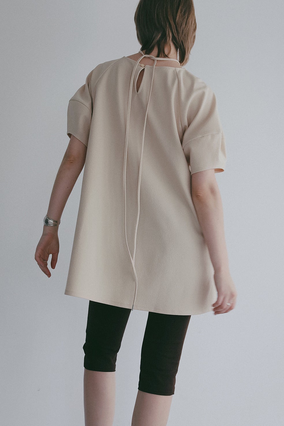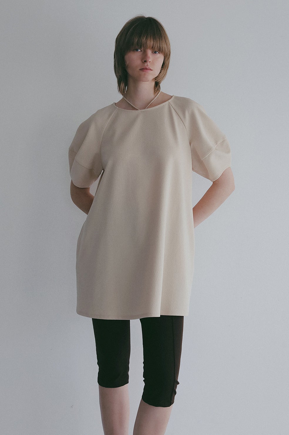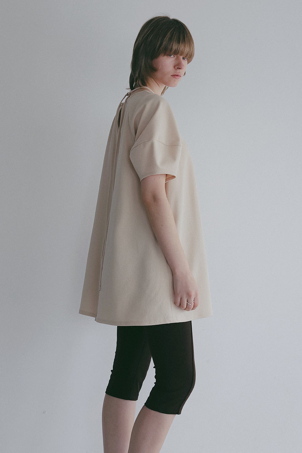 カプリパンツやレギンスを合わせてミニワンピのようなシルエットで着ていただいたり、ワイドパンツやフレアパンツ、ナロースカートでもバランス良い着こなしに。
