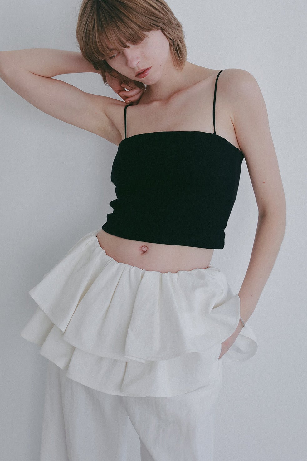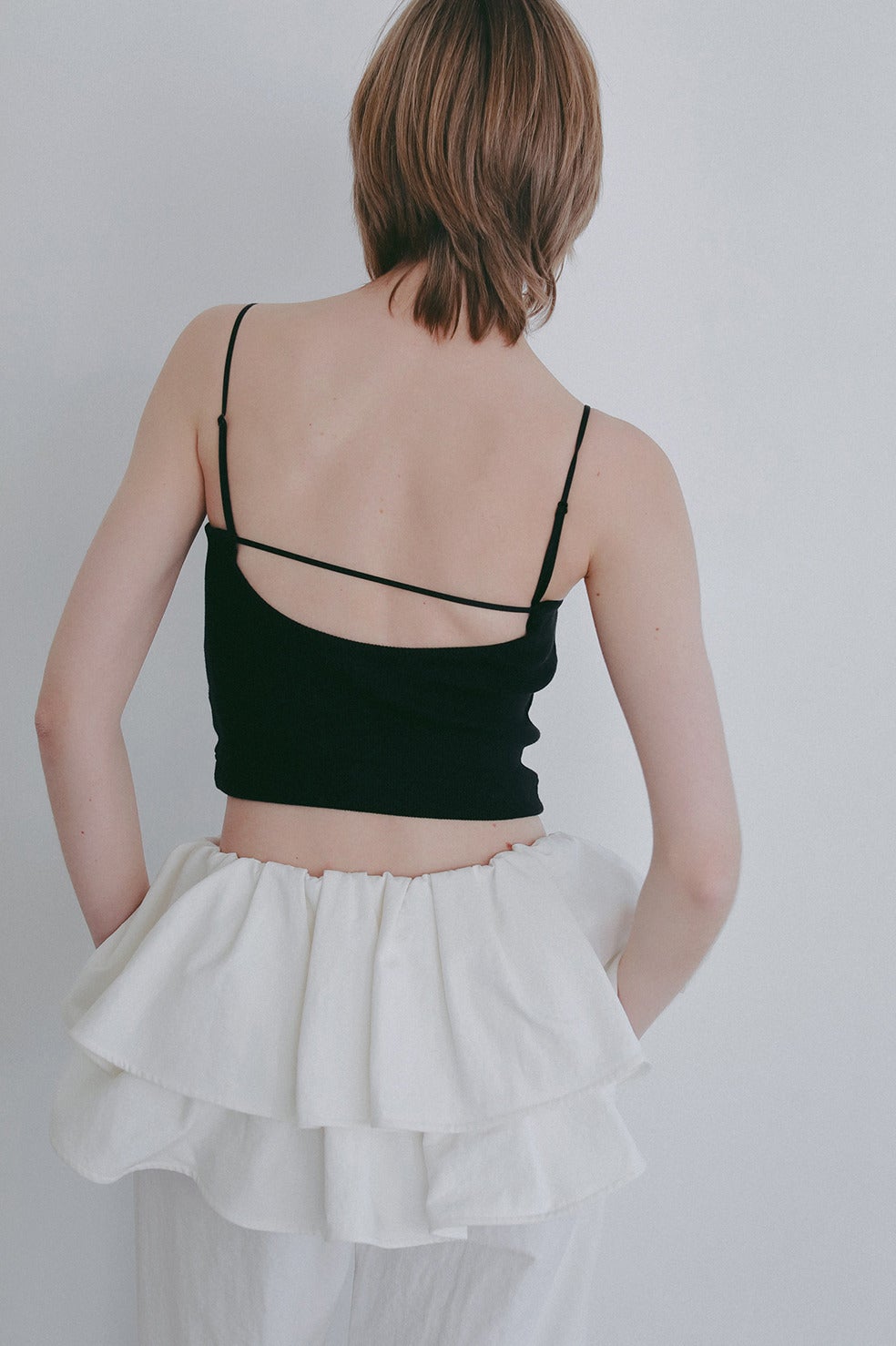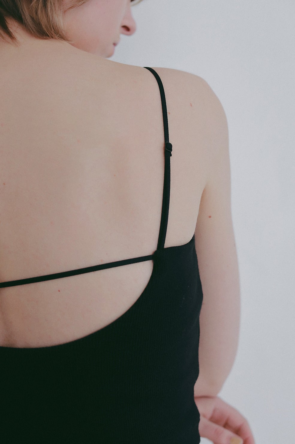 背中の開いたトップスやオフショルダーやシアートップスなどはもちろん、丈も短めにしているのでショート丈トップスとのレイヤードにも最適。