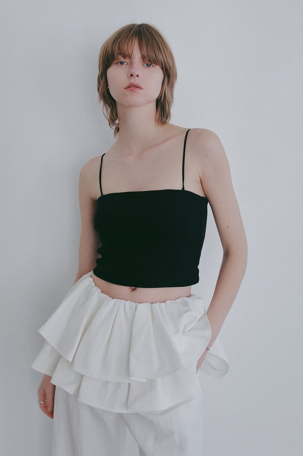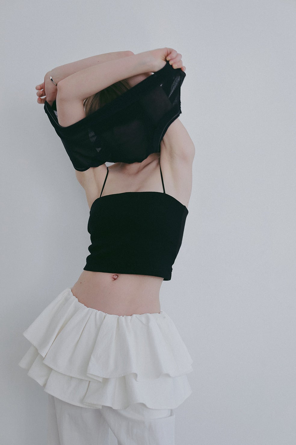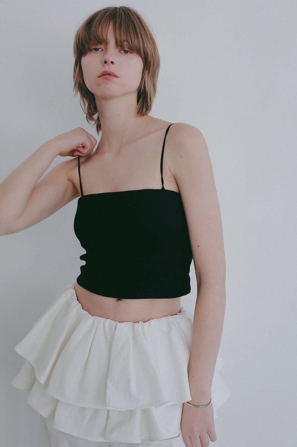 背中の開いたトップスやオフショルダーやシアートップスなどはもちろん、丈も短めにしているのでショート丈トップスとのレイヤードにも最適。