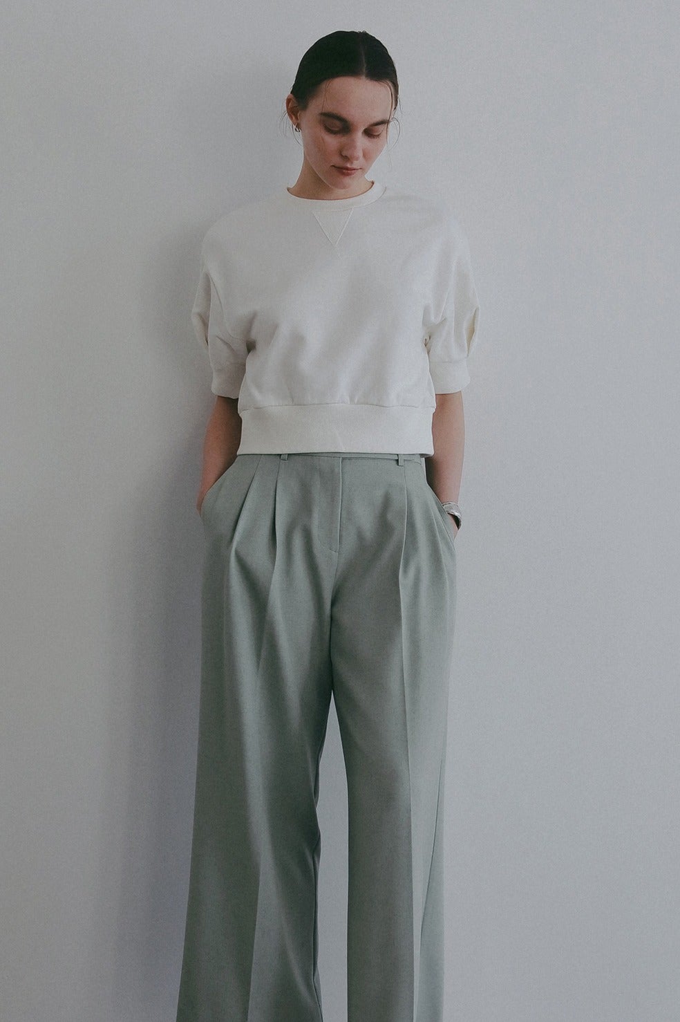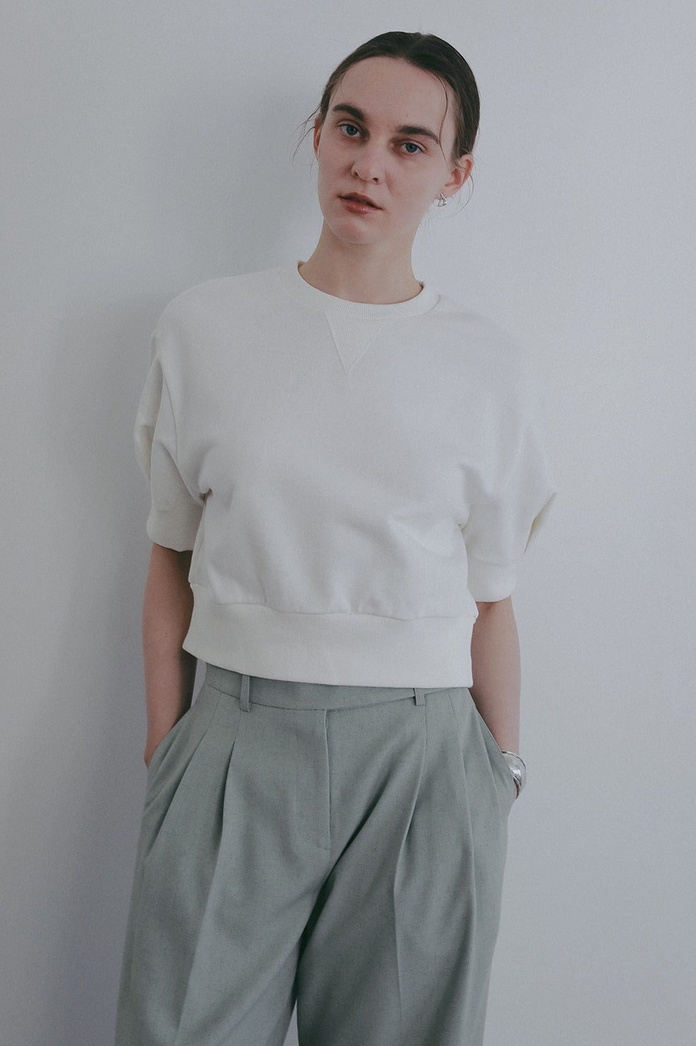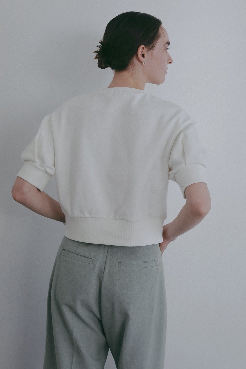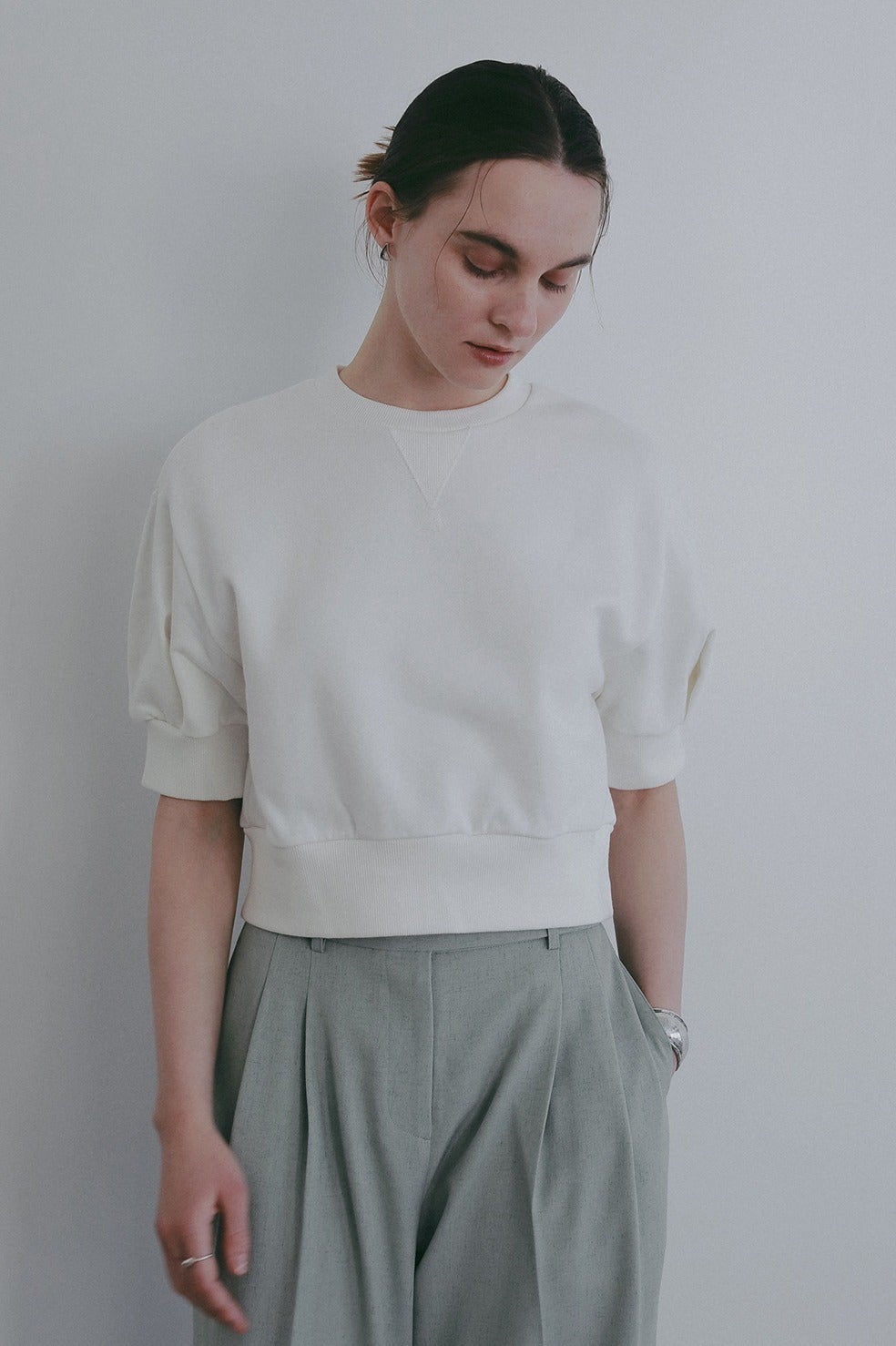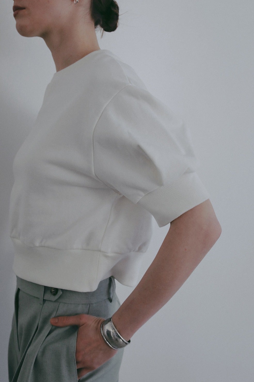 ヴィンテージのスウェットを基調に、ショート丈のパフスリーブで女性らしいディテールをプラスした一着。