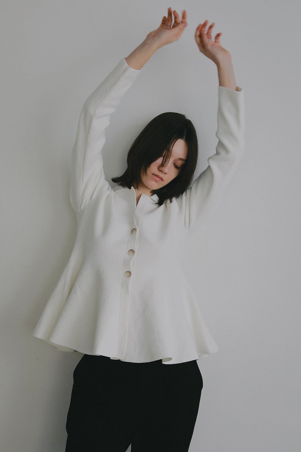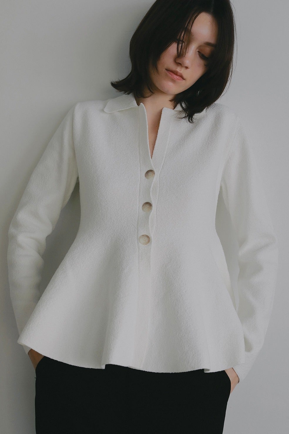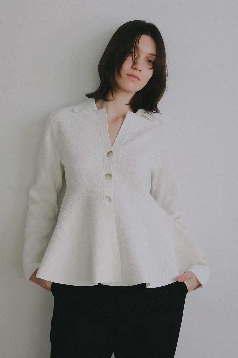 ウエストからたっぷりとボリューム感あるペプラムシルエットのカーディガン。