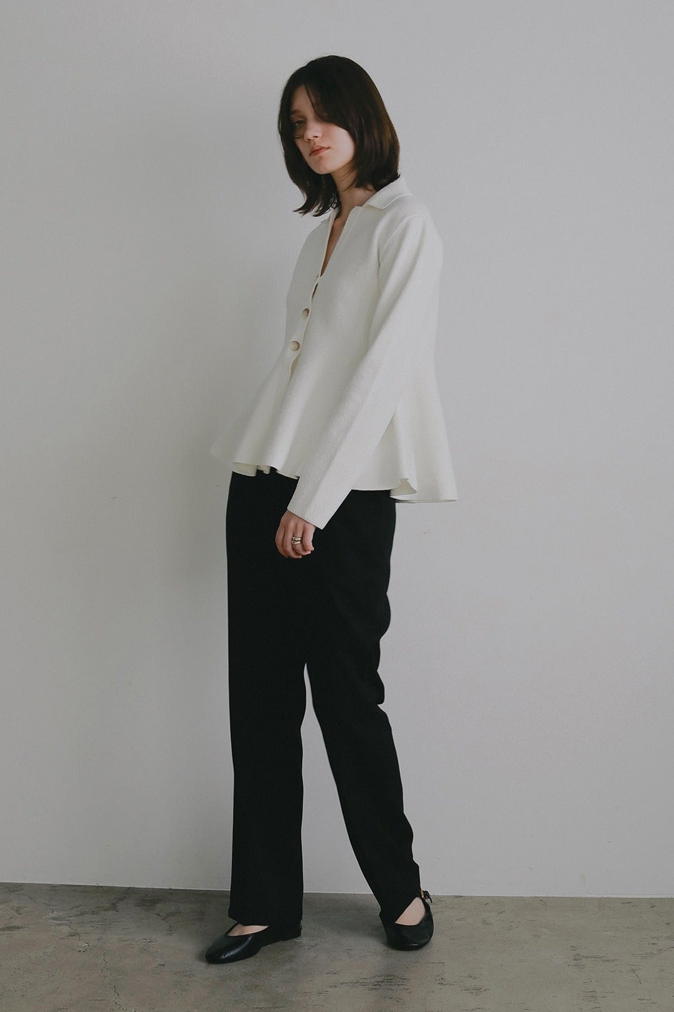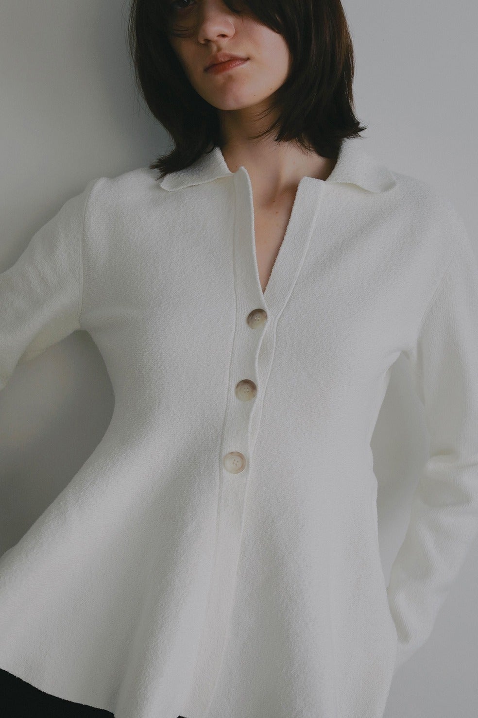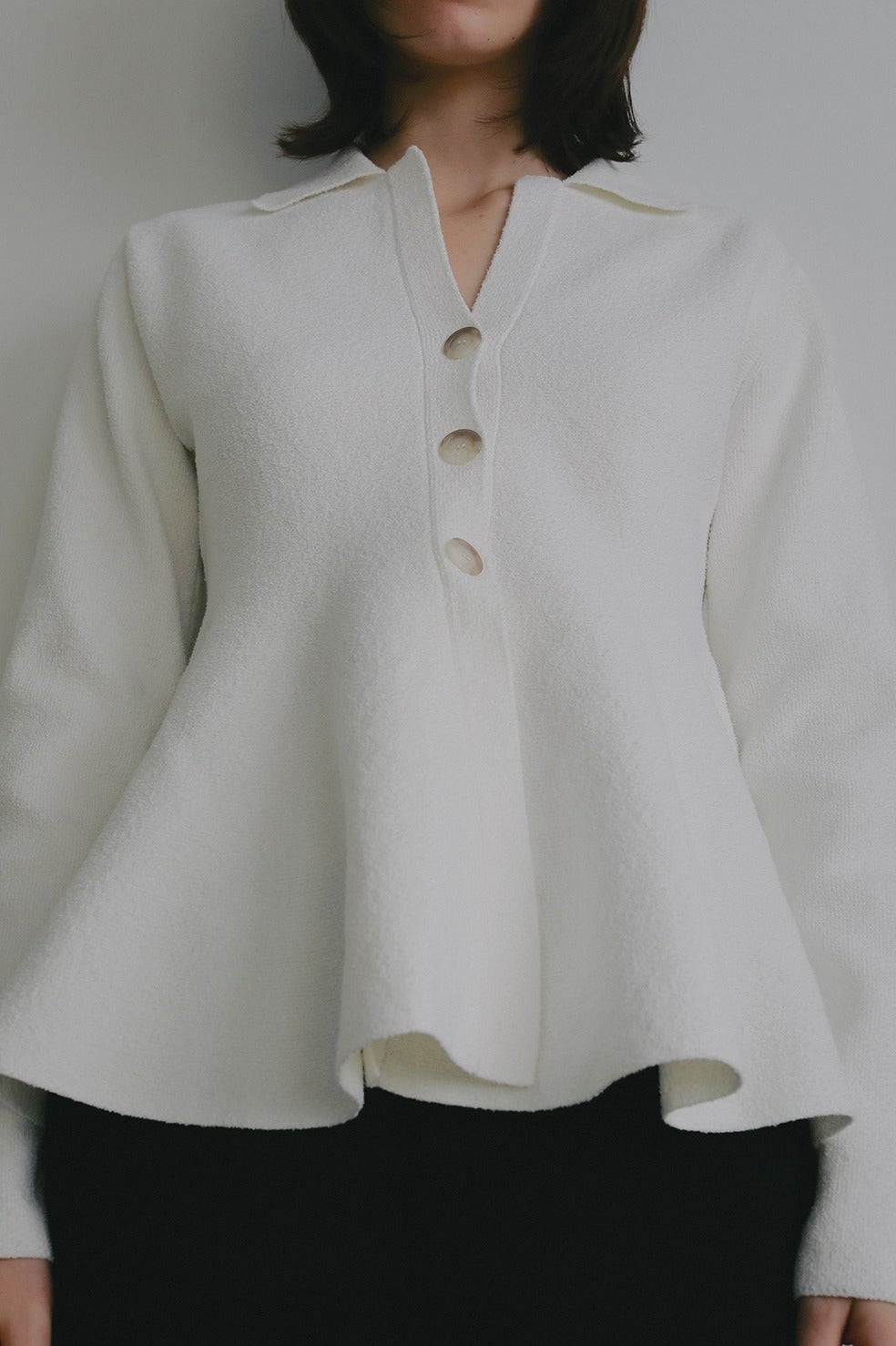 ウエストからたっぷりとボリューム感あるペプラムシルエットのカーディガン。