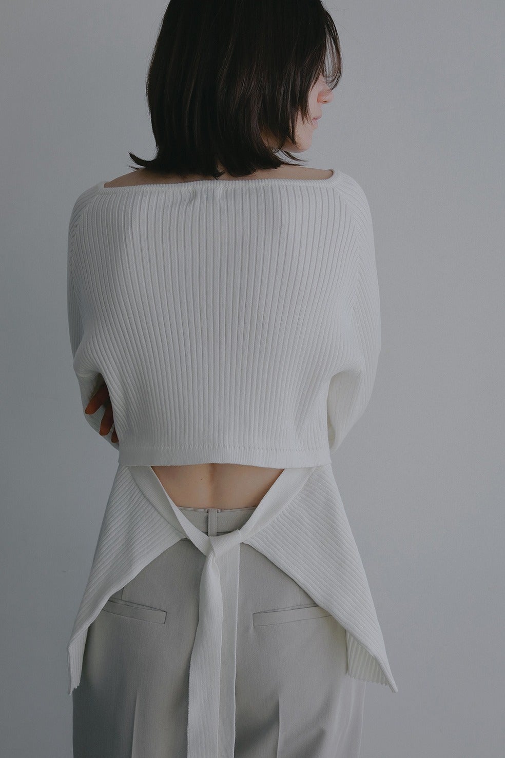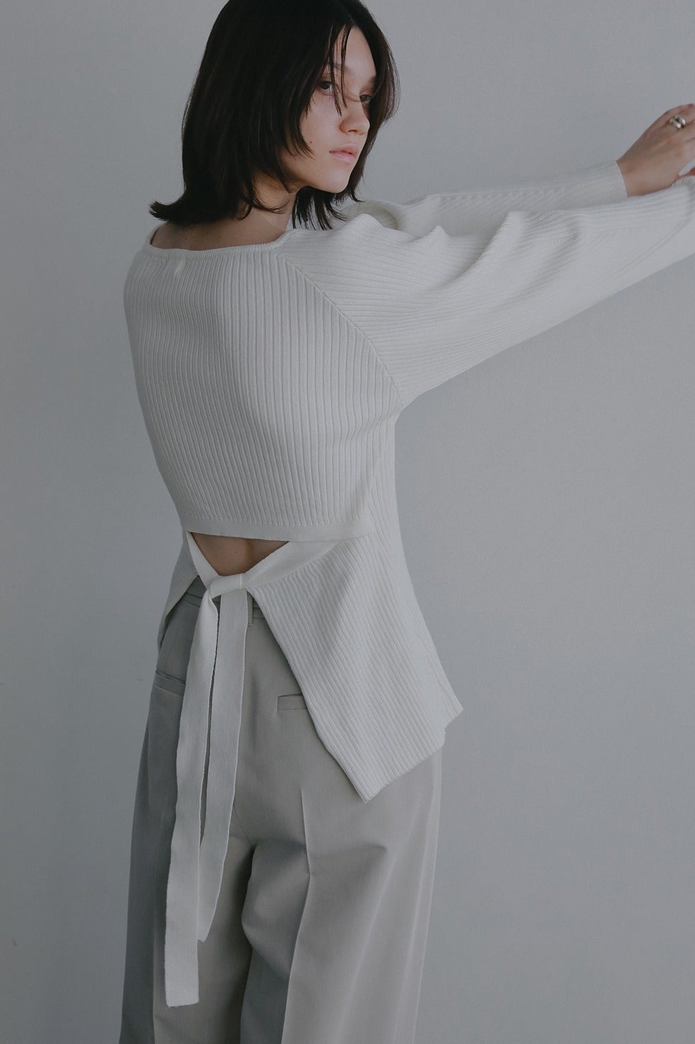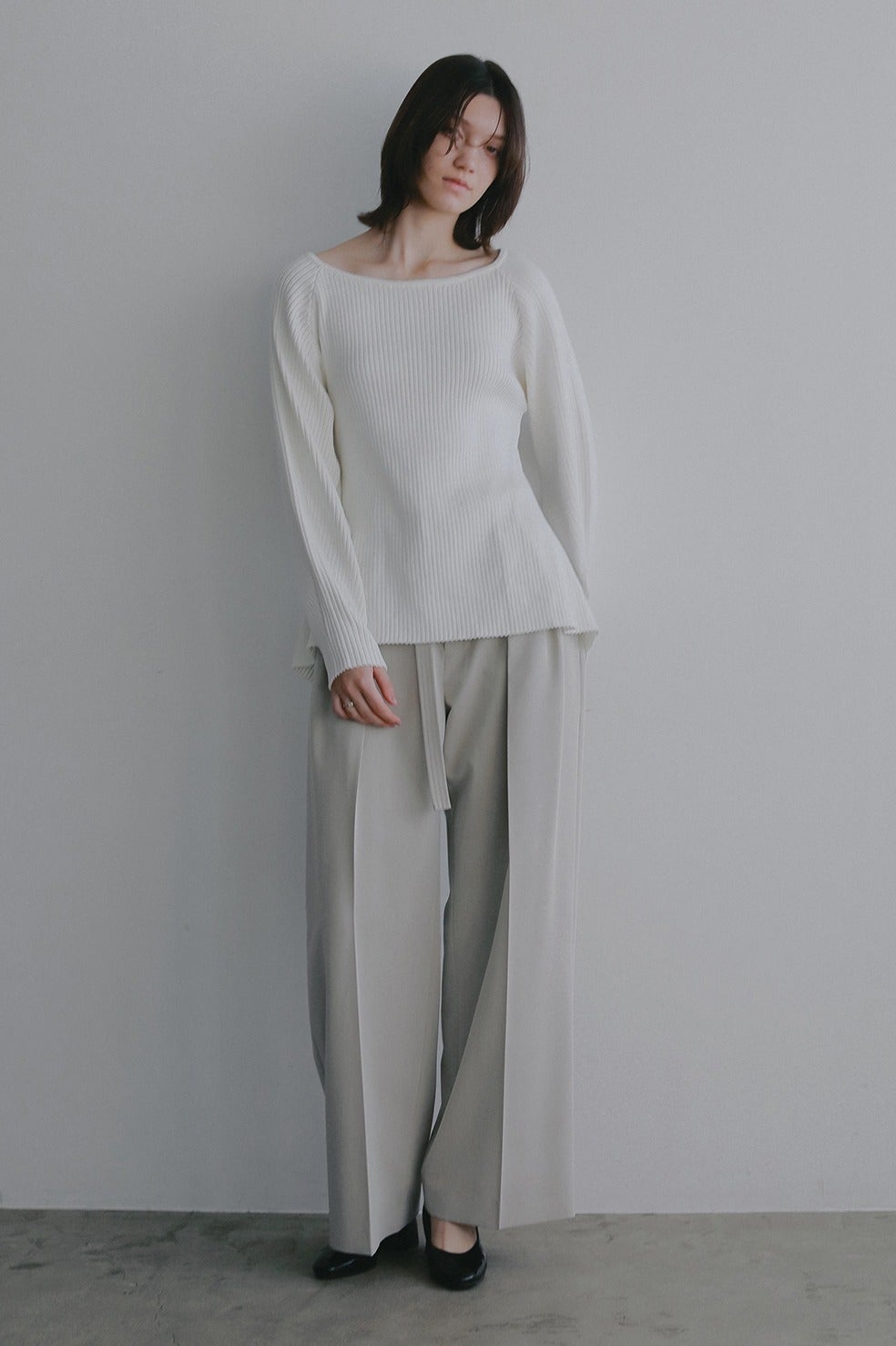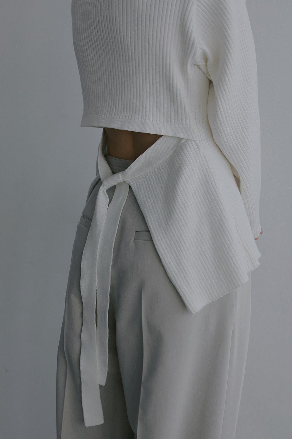 ウエスト部分にはスリットとリボンを施し、結び方次第でシルエットをアレンジ可能。ゆるく結んでラフに、しっかり結んでメリハリのあるウエストラインに。