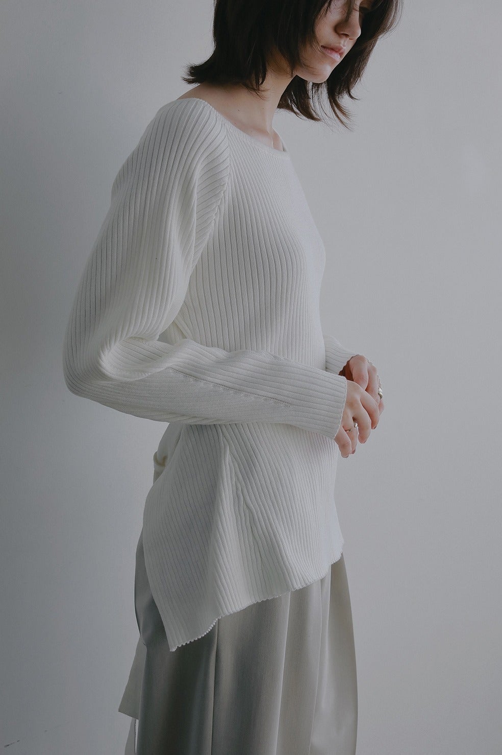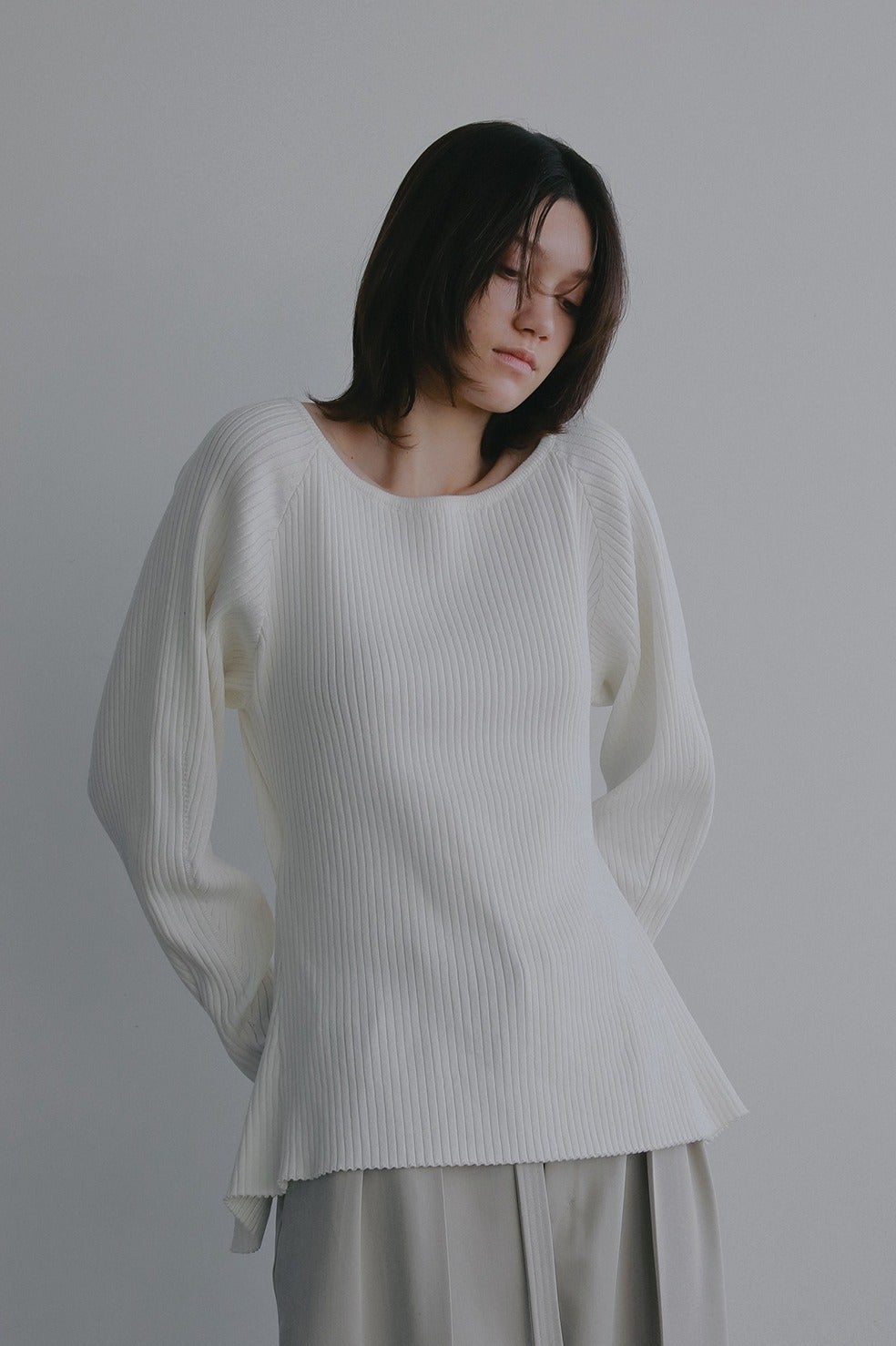 ボートネックとラグランスリーブで肩の丸みと袖のふくらみがポイント。