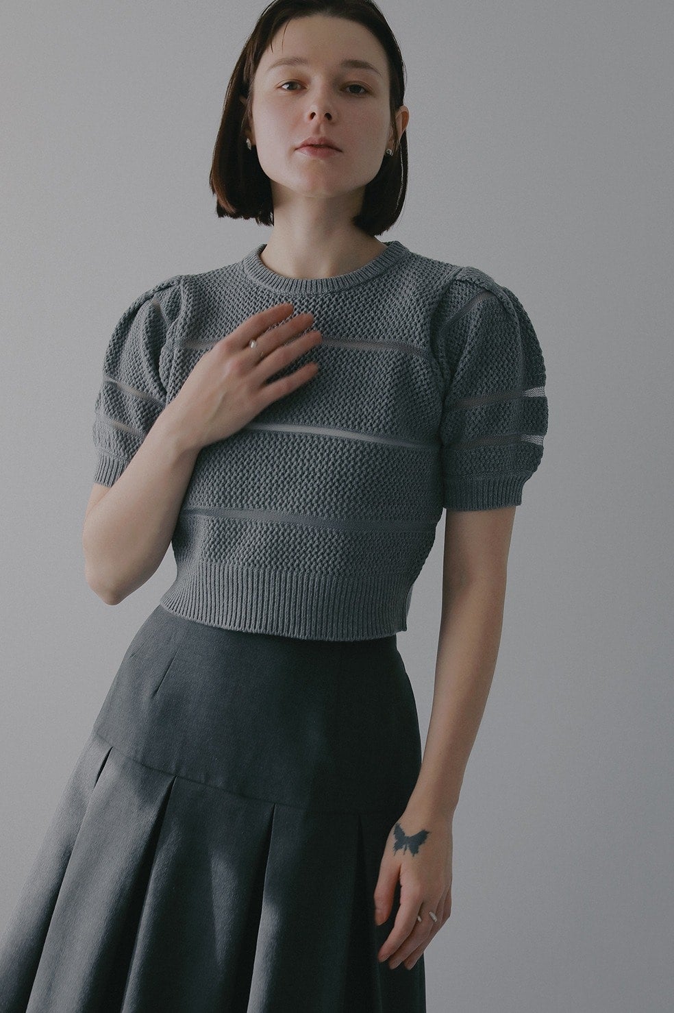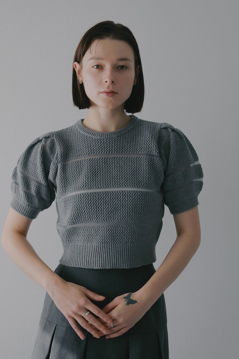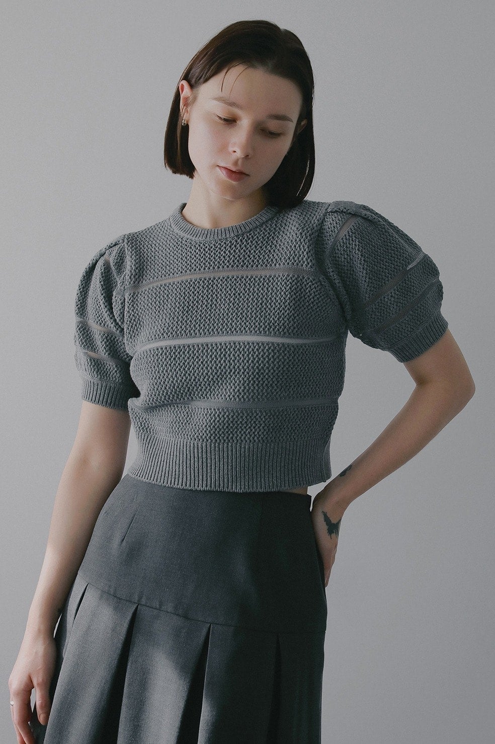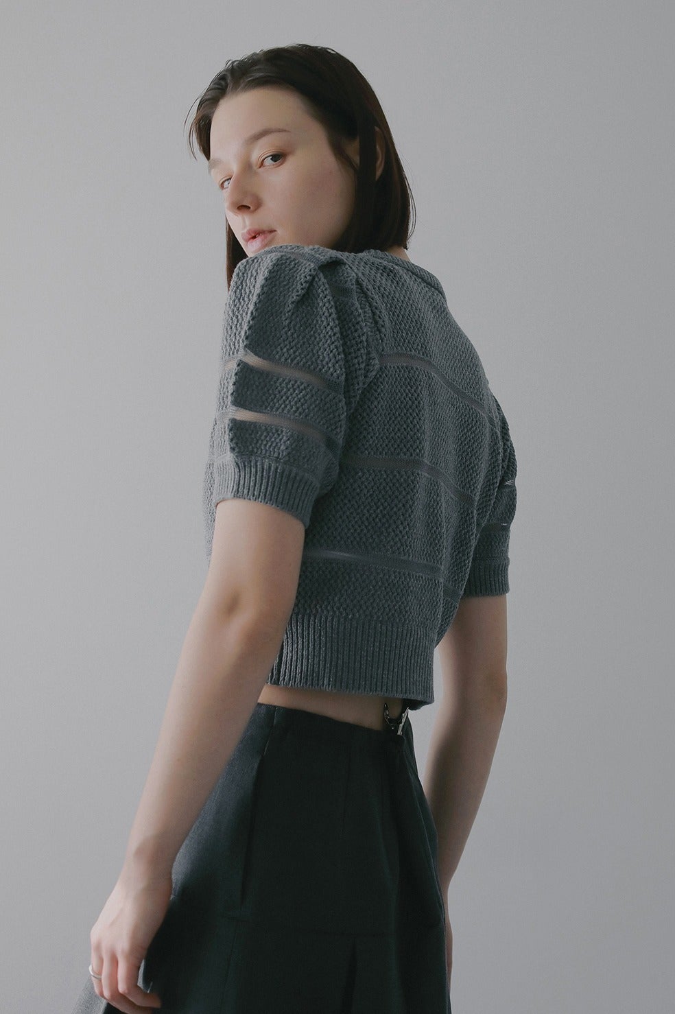 透かし編みにシアー切り替えのボーダーを加えた、軽やかなショート丈ニットトップス。