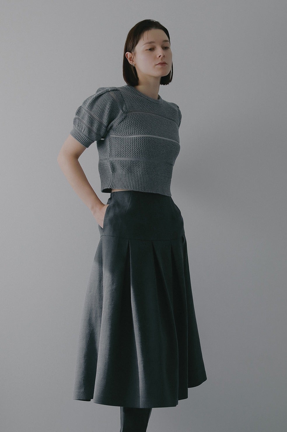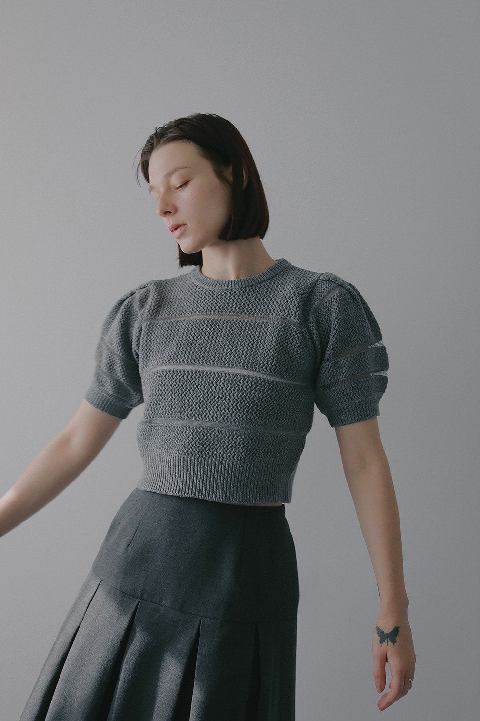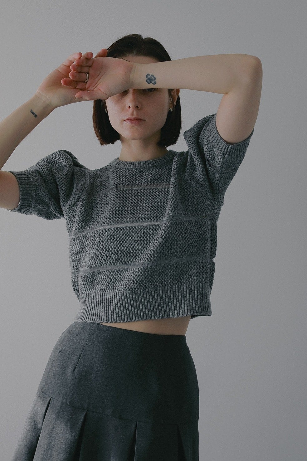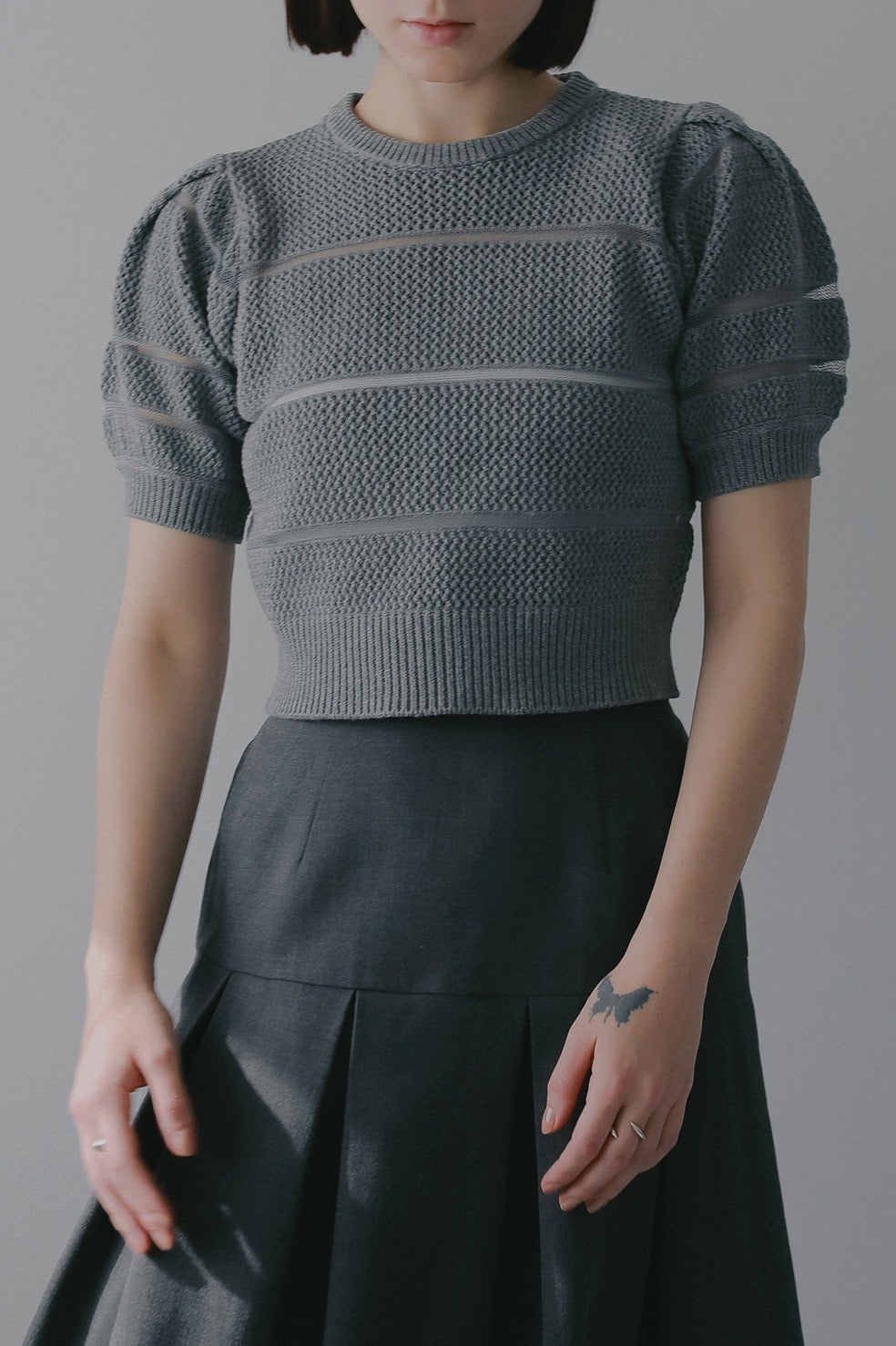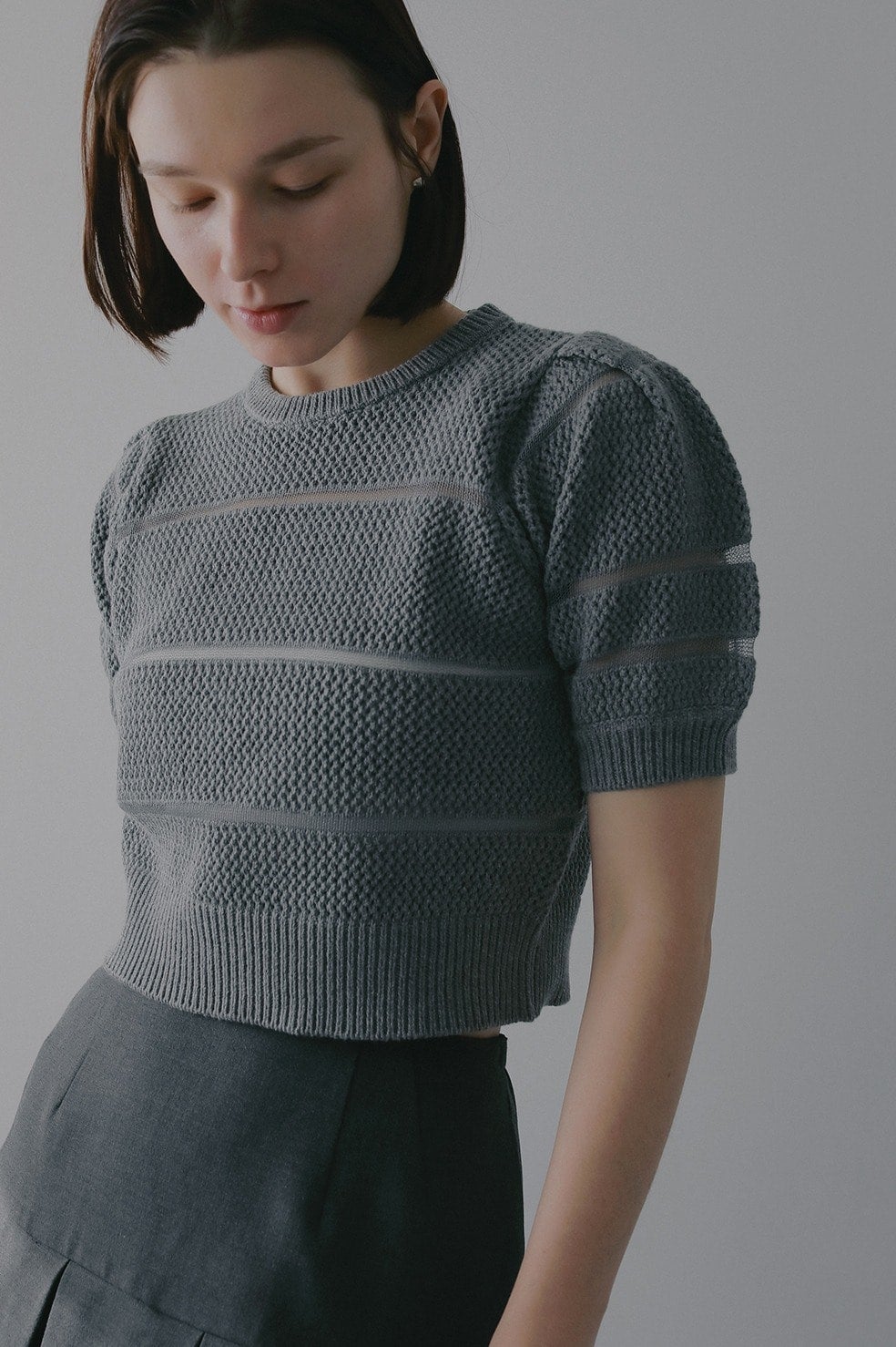 透かし編みにシアー切り替えのボーダーを加えた、軽やかなショート丈ニットトップス。