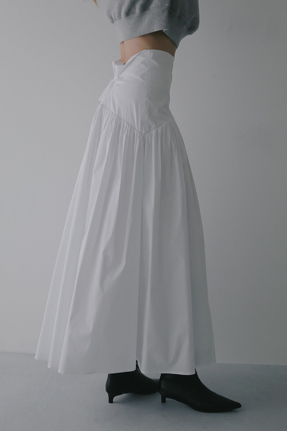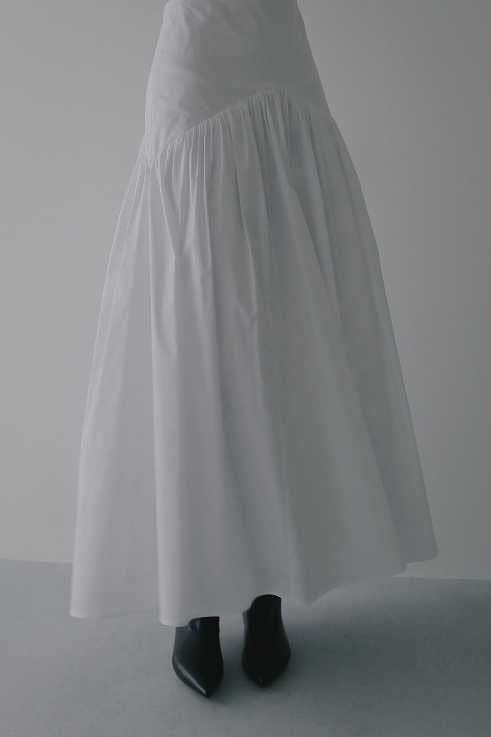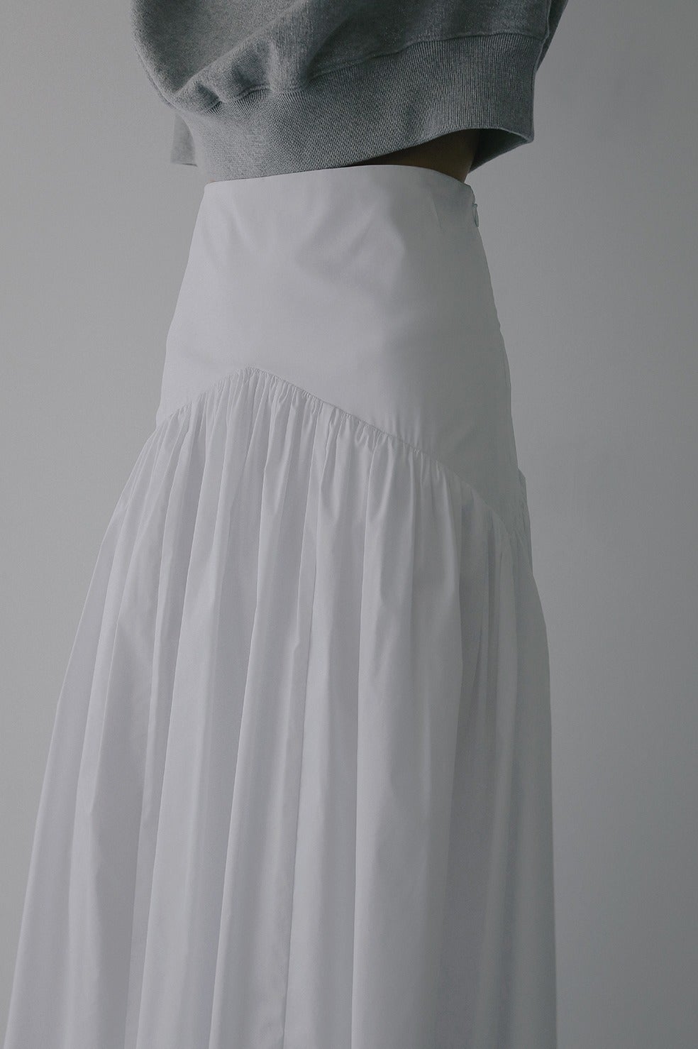シェイプしたウエスト部分とボリューム感ある裾がメリハリあるシルエットのギャザー切り替えスカート。