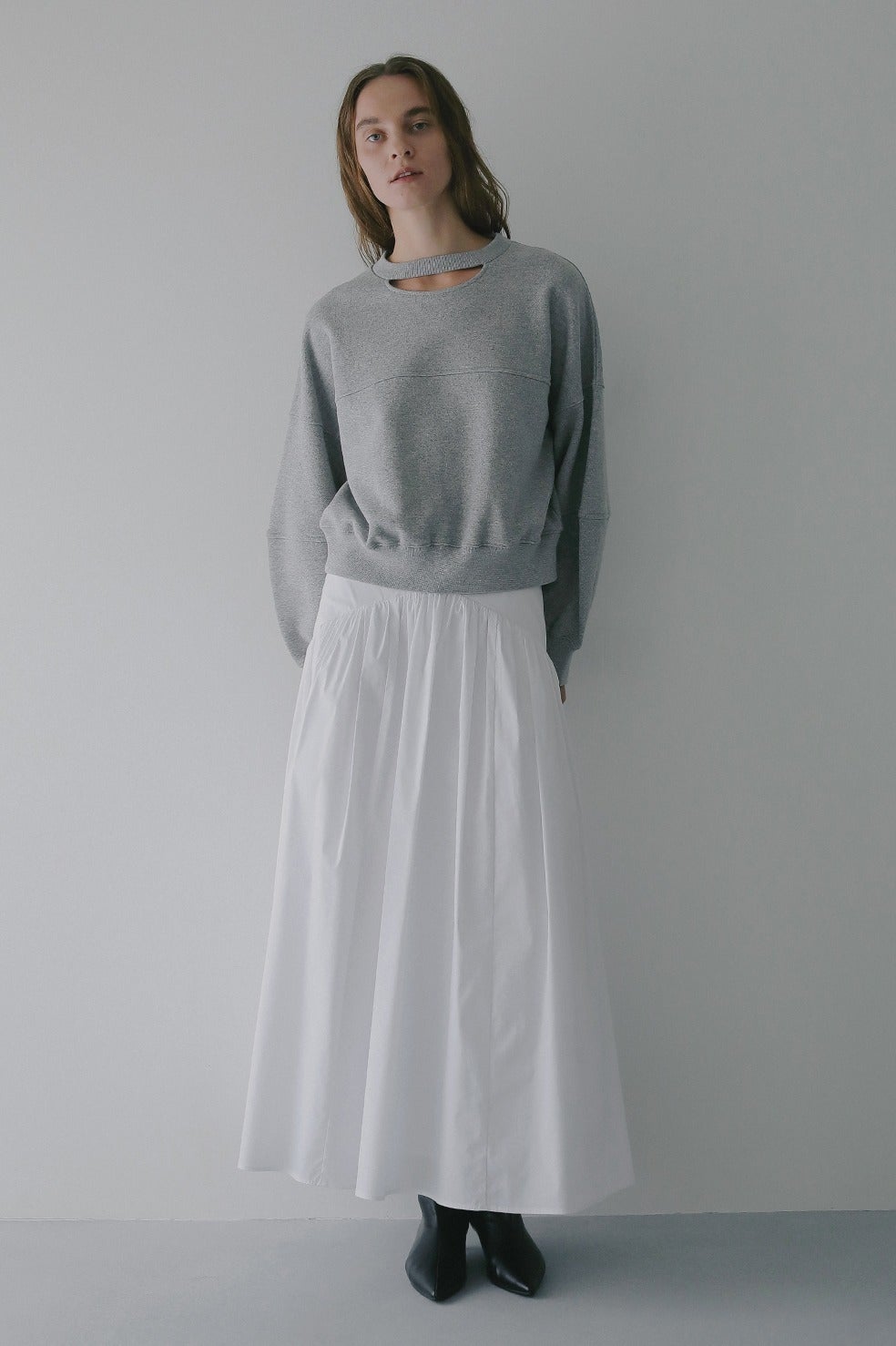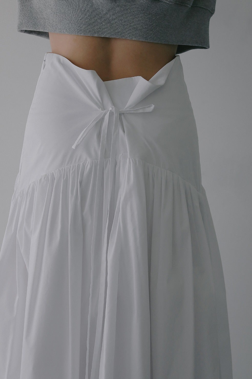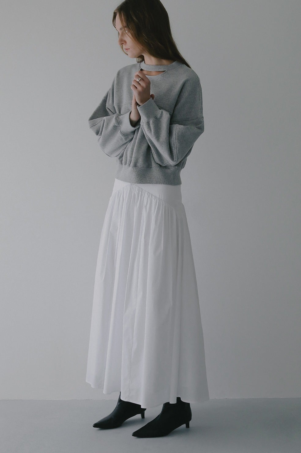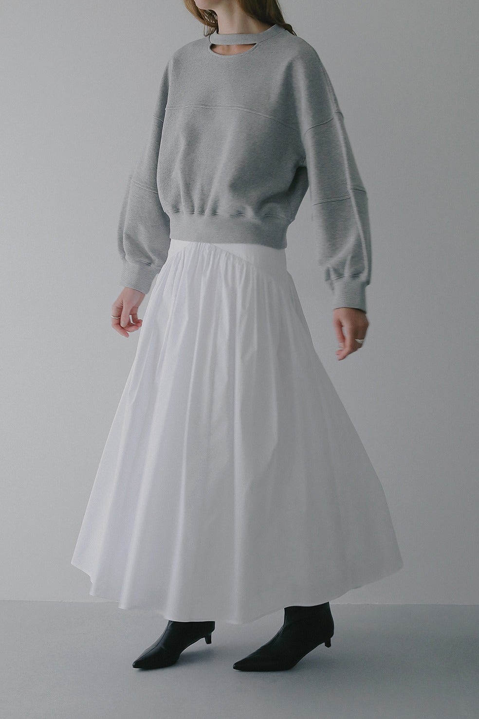 シェイプしたウエスト部分とボリューム感ある裾がメリハリあるシルエットのギャザー切り替えスカート。