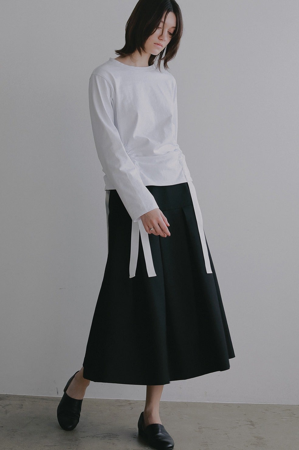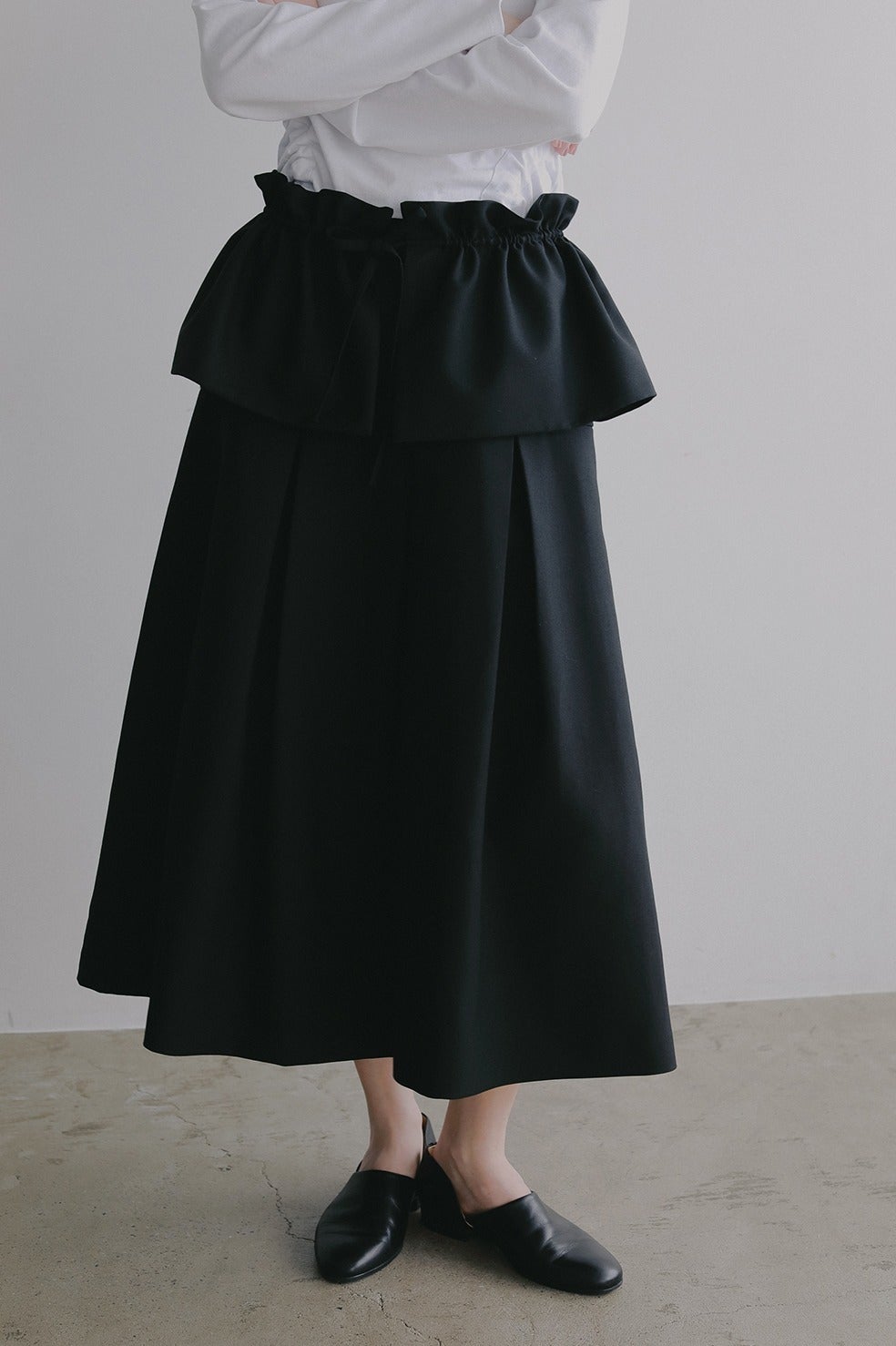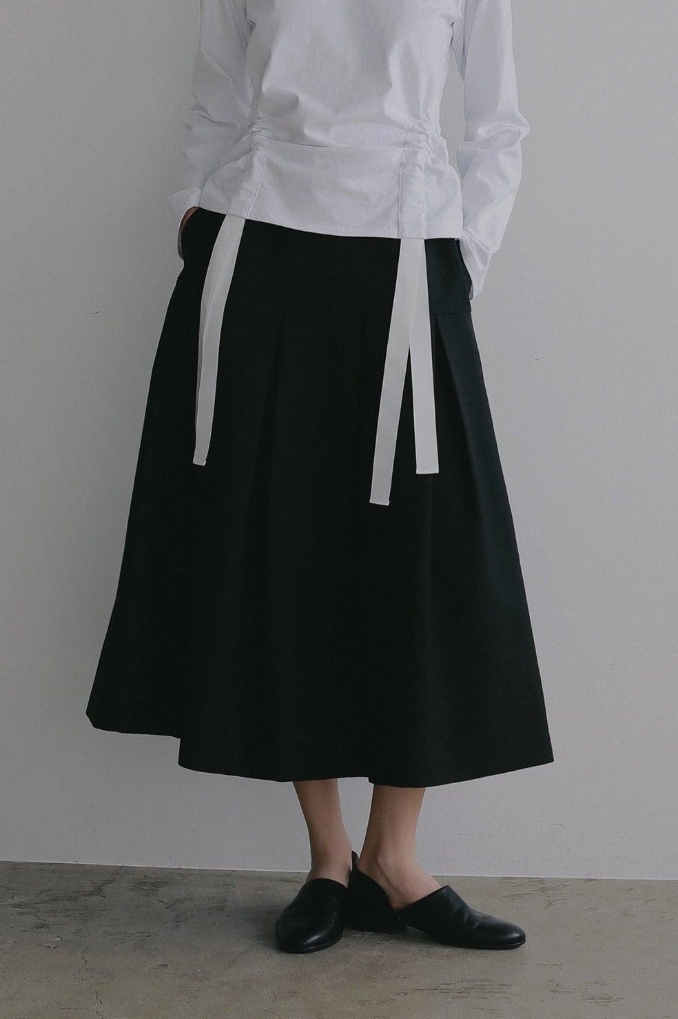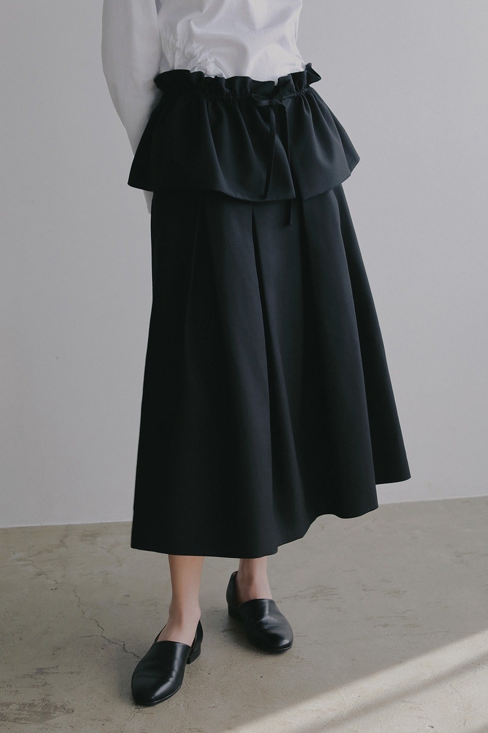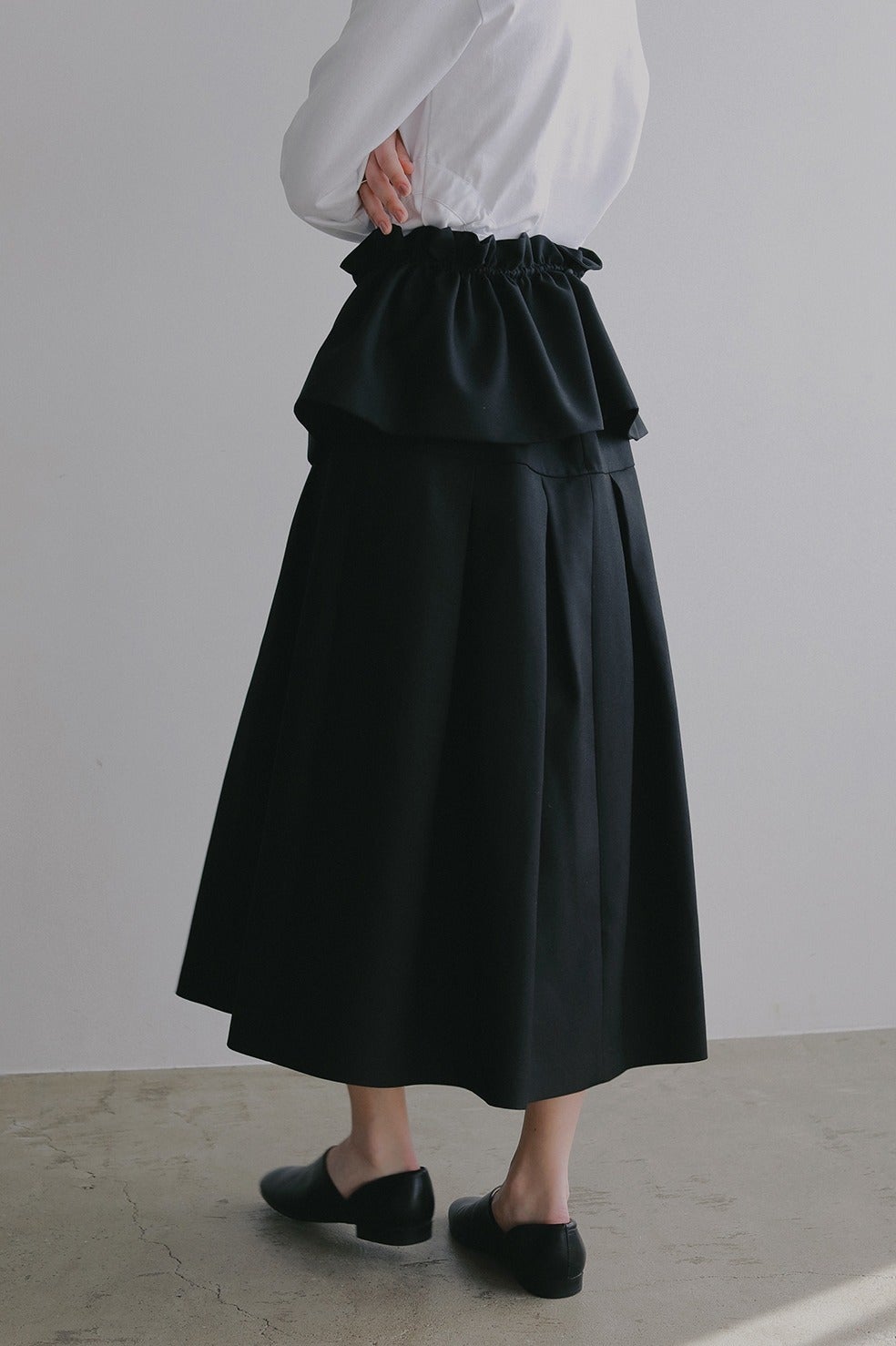 ウエストからヒップ上まではすっきりと、ヒップからボックスプリーツで立体的なシルエットになるよう切り替えとタックを入れています。(画像より切り替え位置が上に上がります)