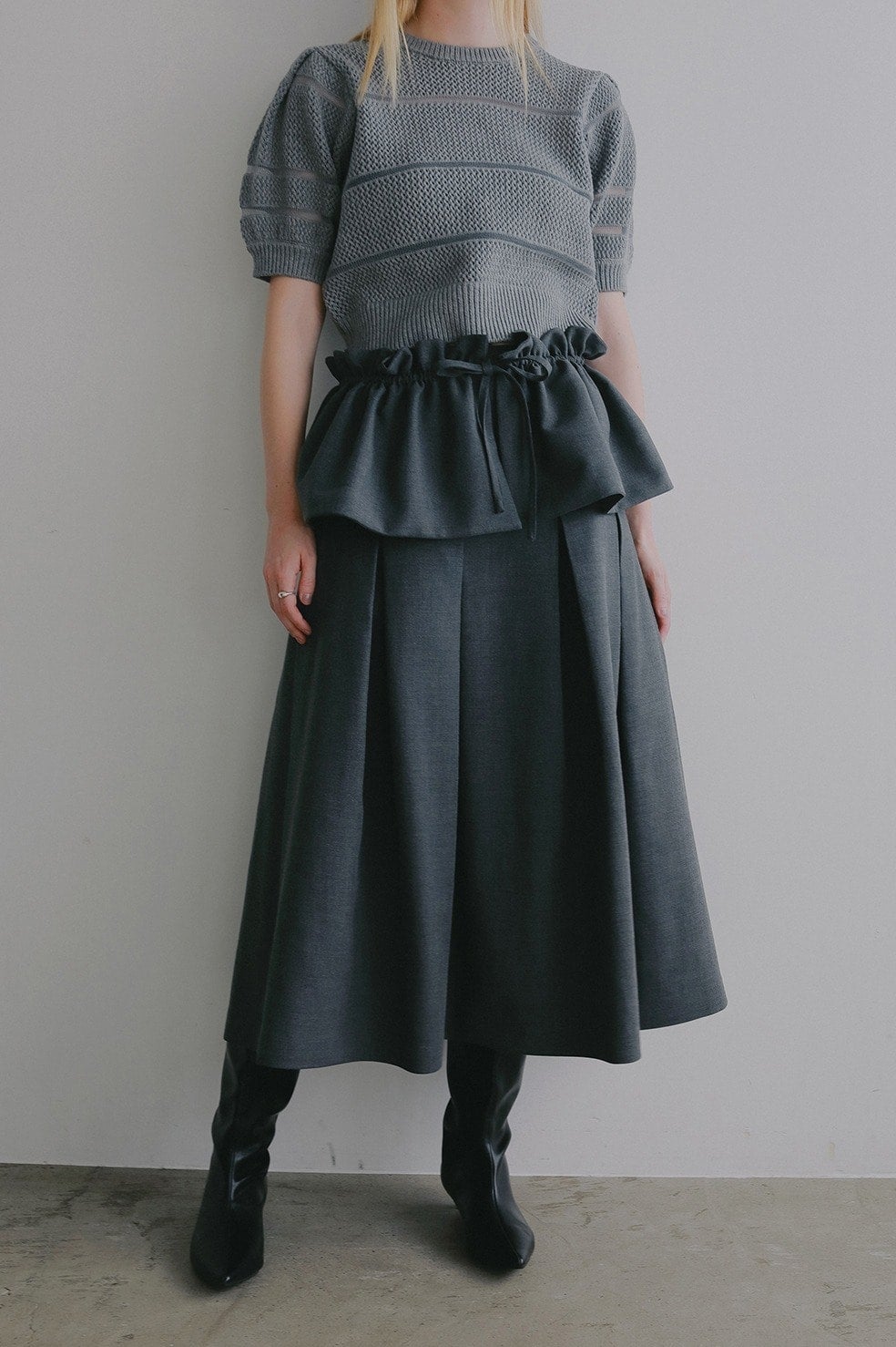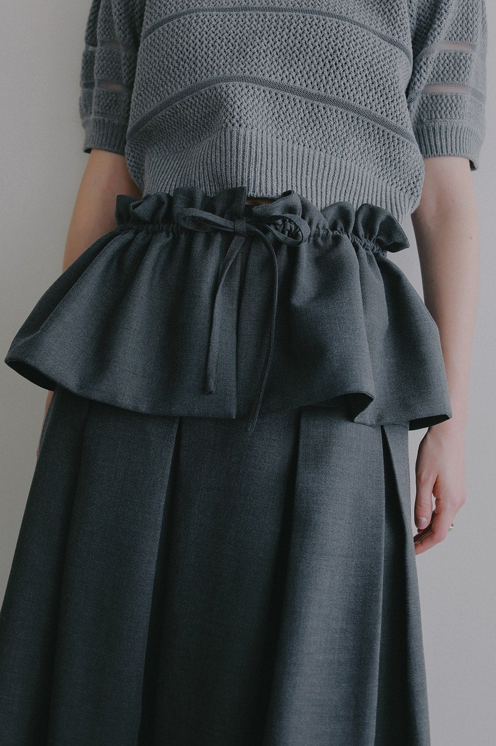 共生地のフリルは紐は調整可能でギャザーの分量や位置を変えたり、取り外しても使えるのでオケージョンシーンでも着回しできる1枚。