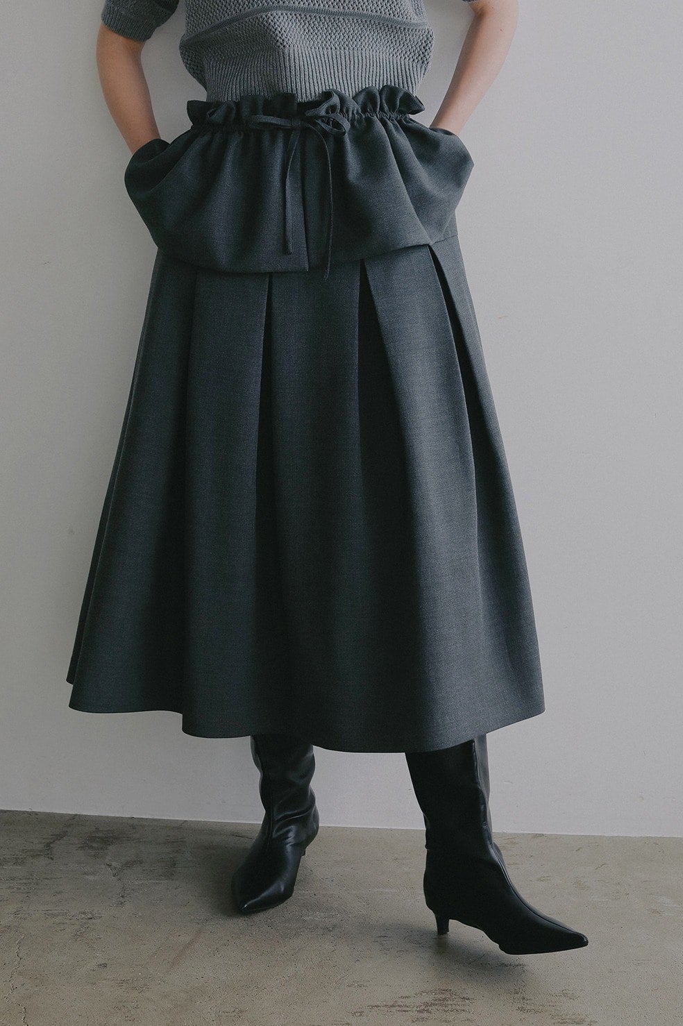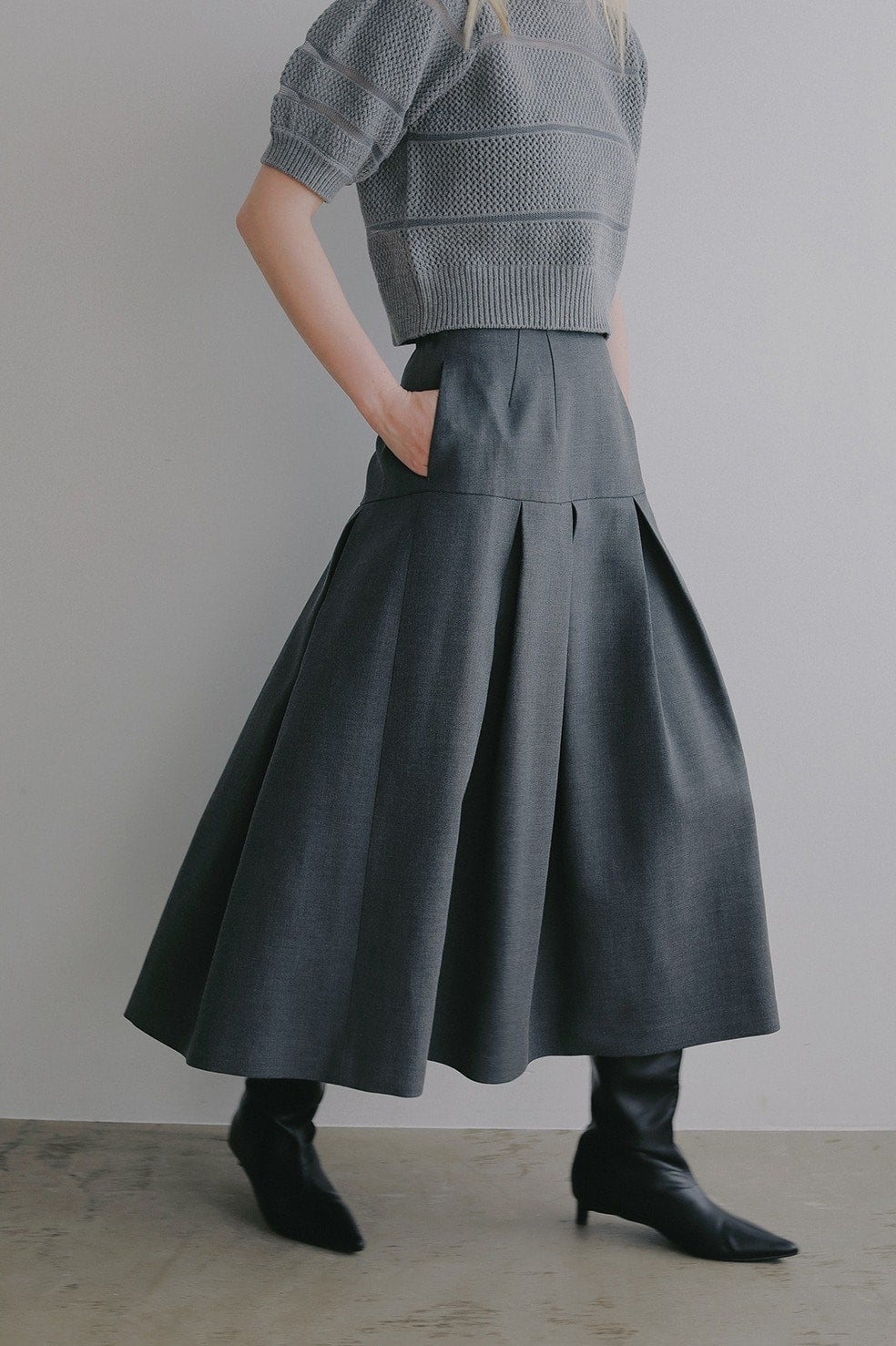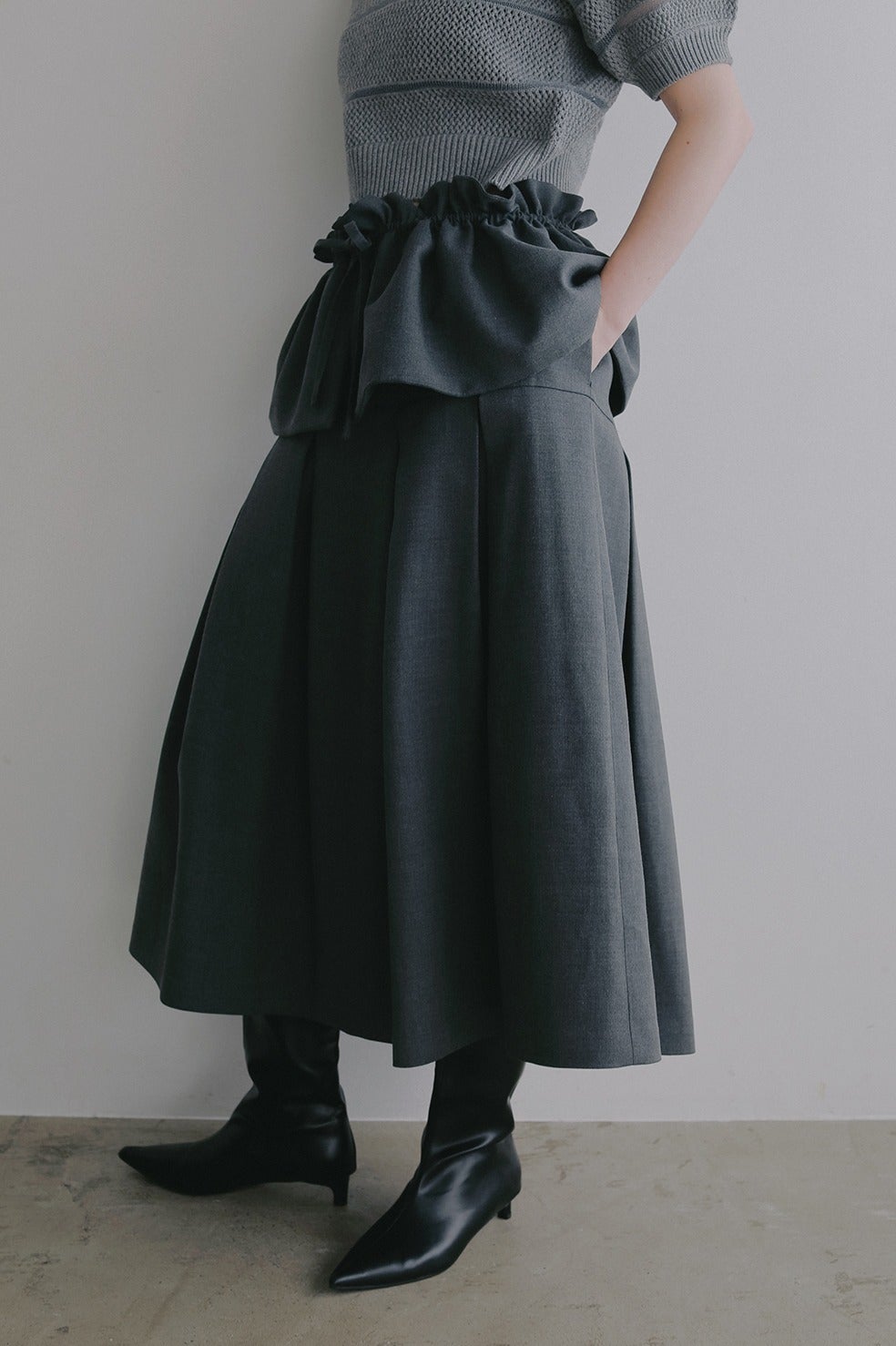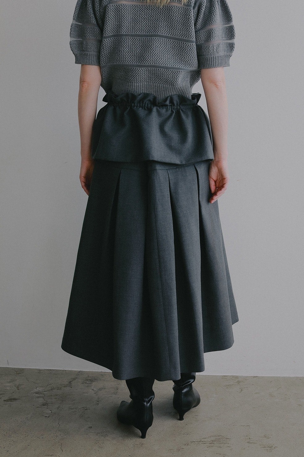 ウエストからヒップまではすっきりと、ヒップからボックスプリーツで立体的なシルエットになるよう切り替えとタックを入れています。