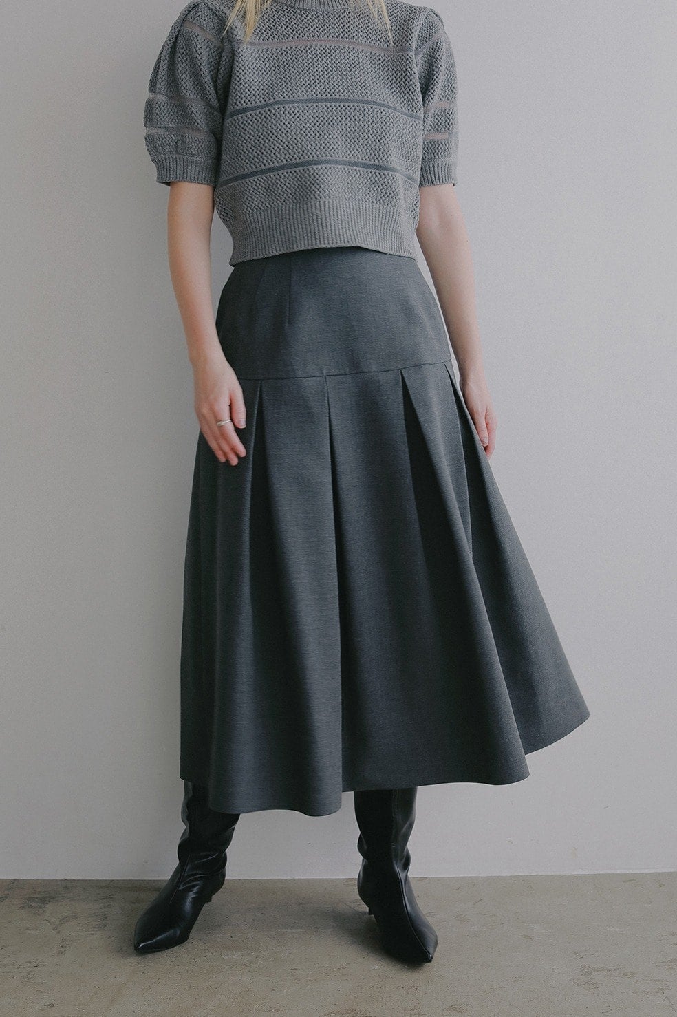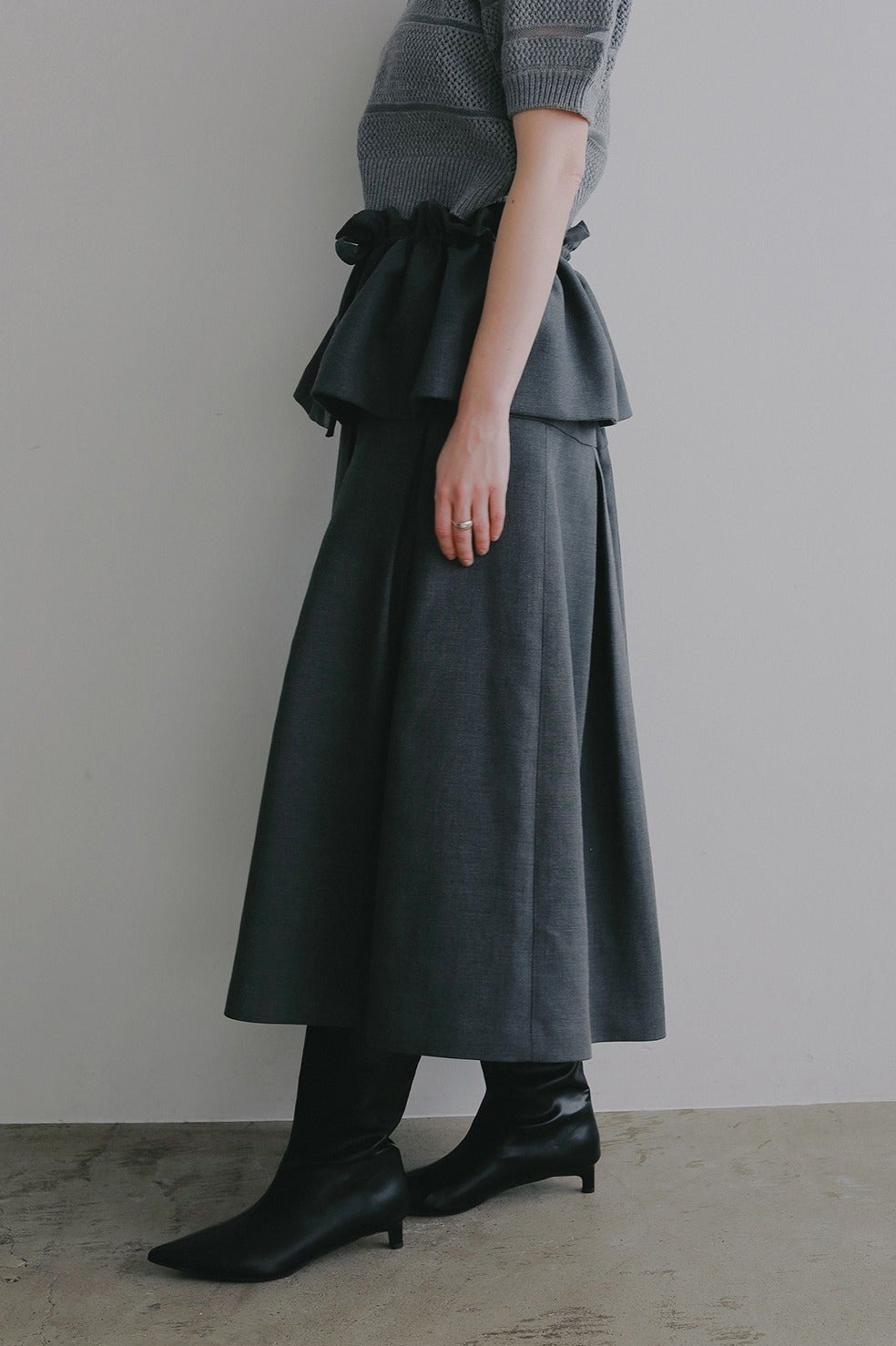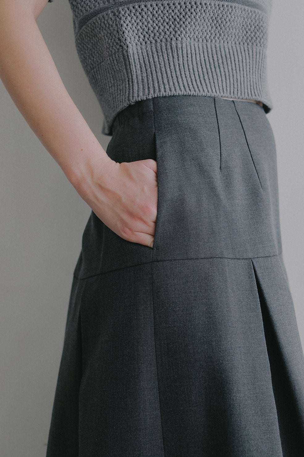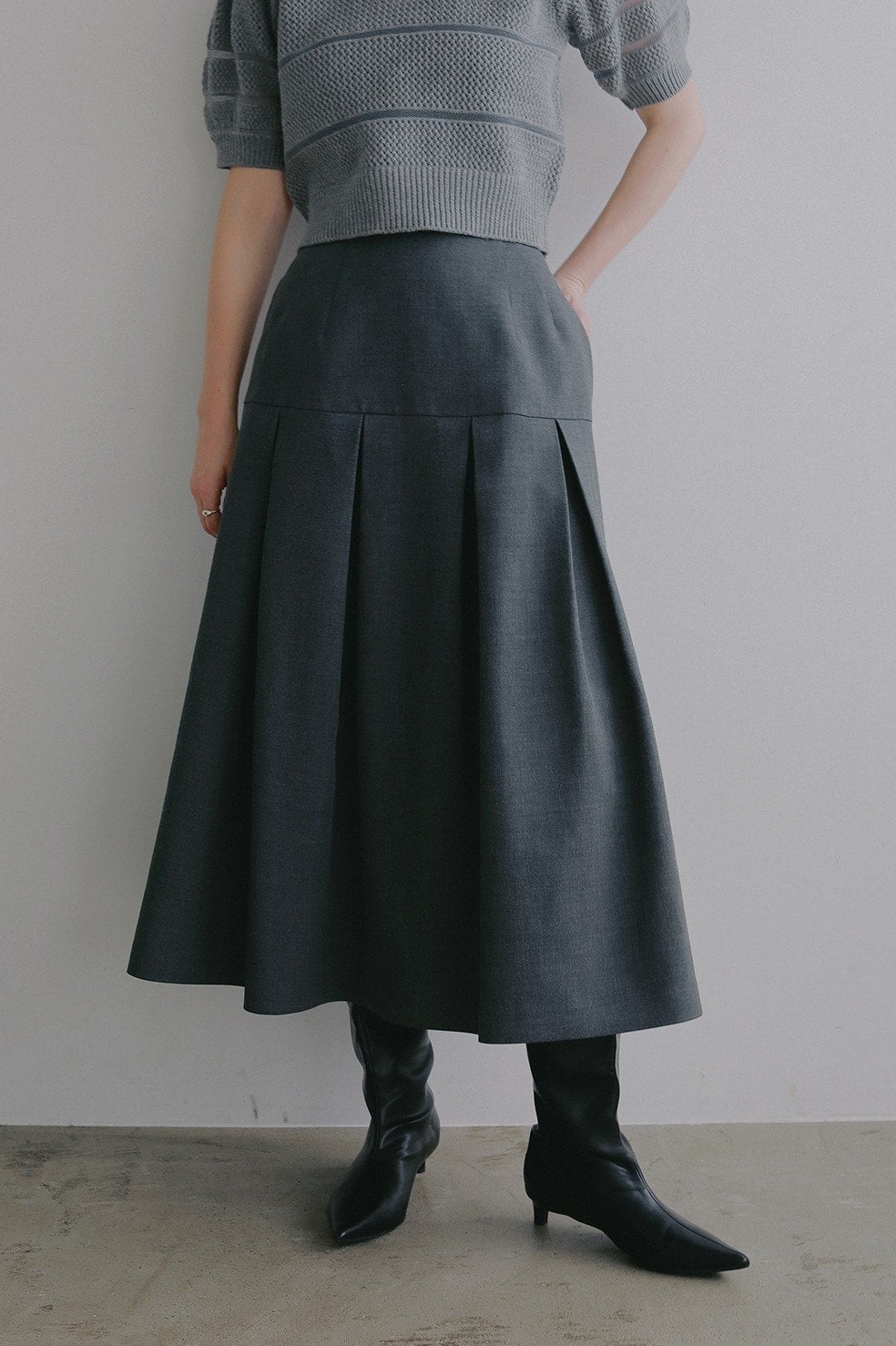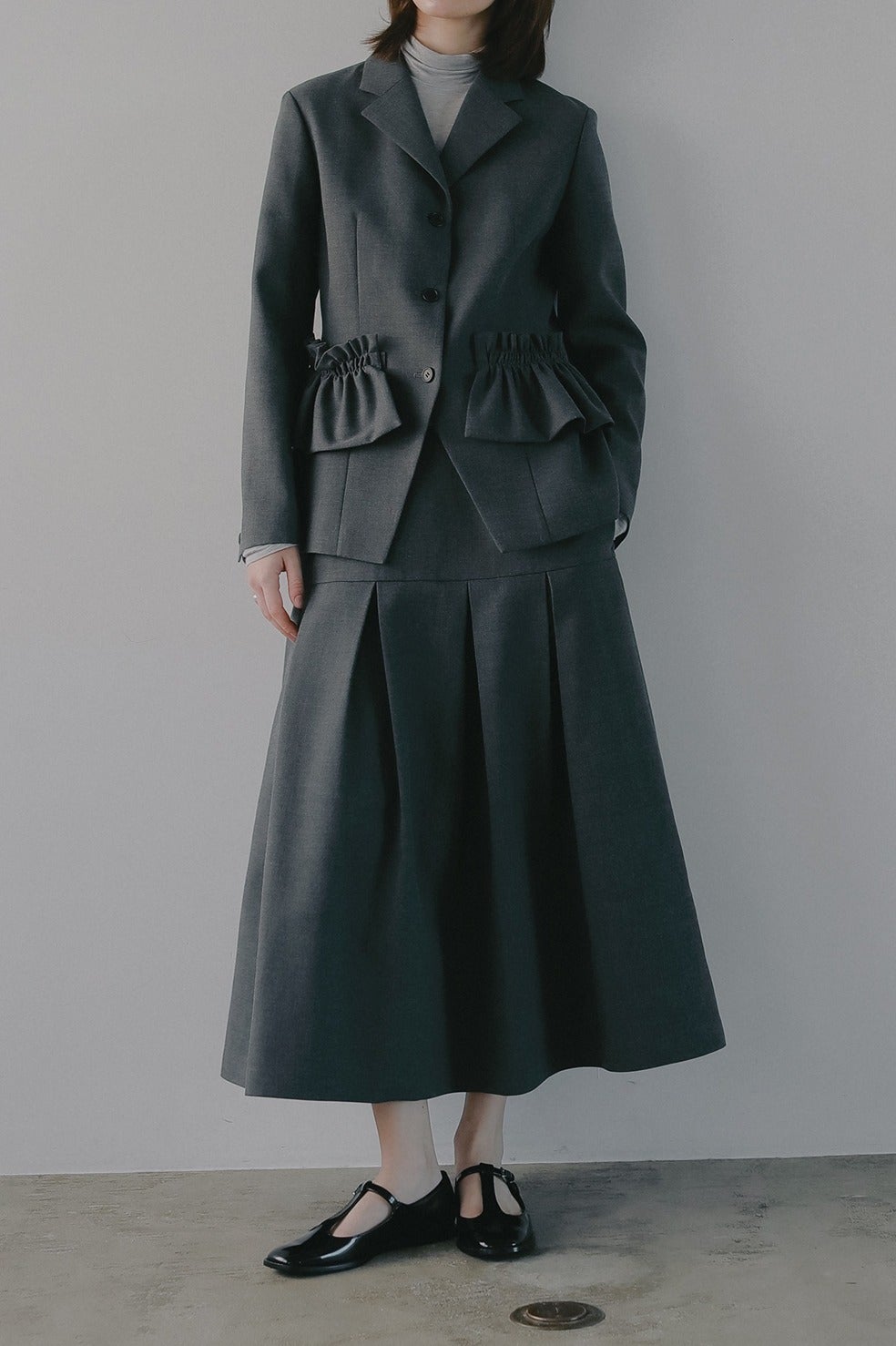 ウエストからヒップまではすっきりと、ヒップからボックスプリーツで立体的なシルエットになるよう切り替えとタックを入れています。