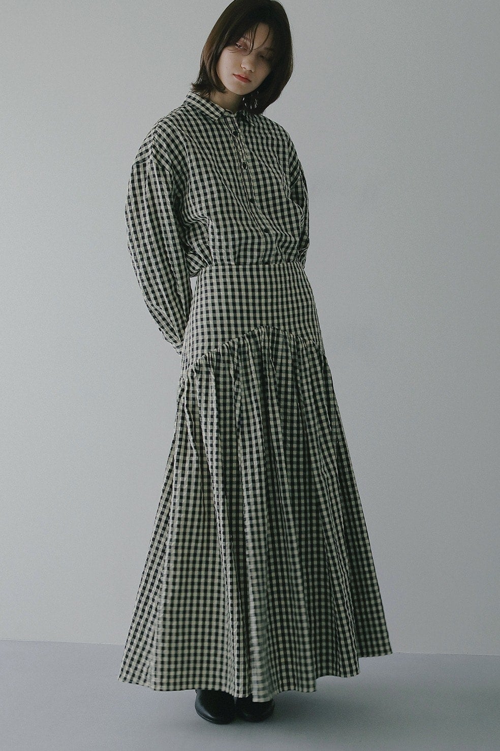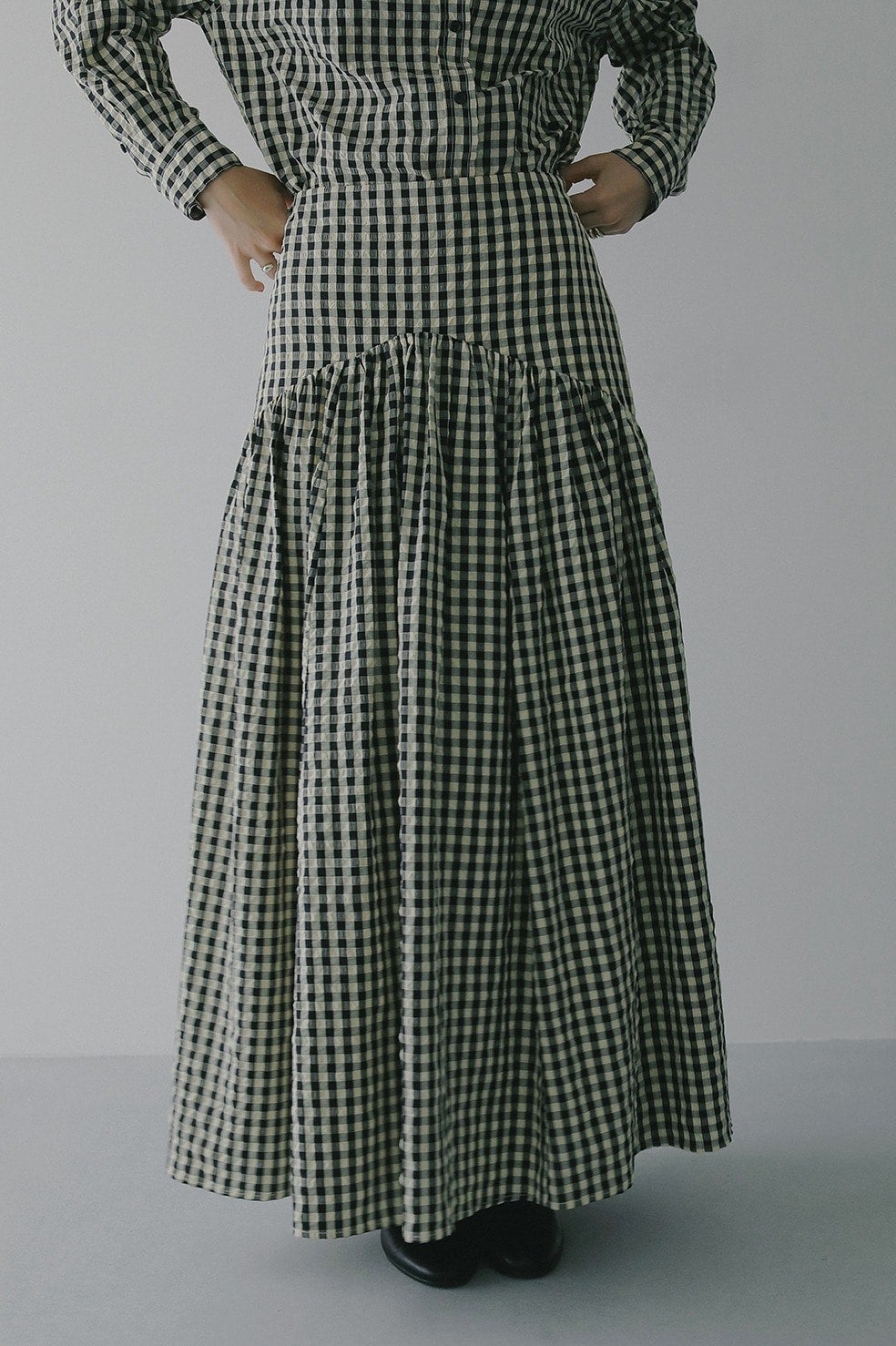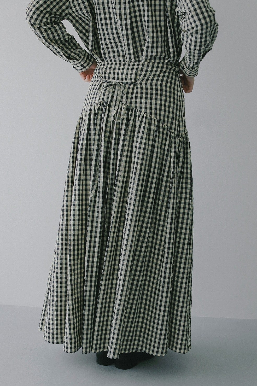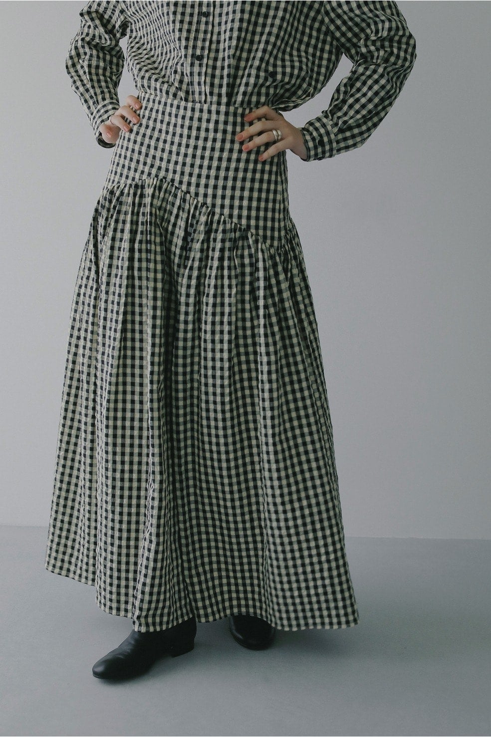 凹凸のある織り柄が表情豊かなギンガムチェック生地のギャザー切り替えスカート。