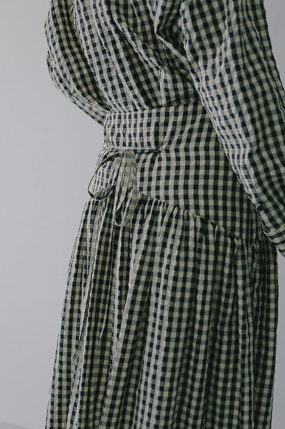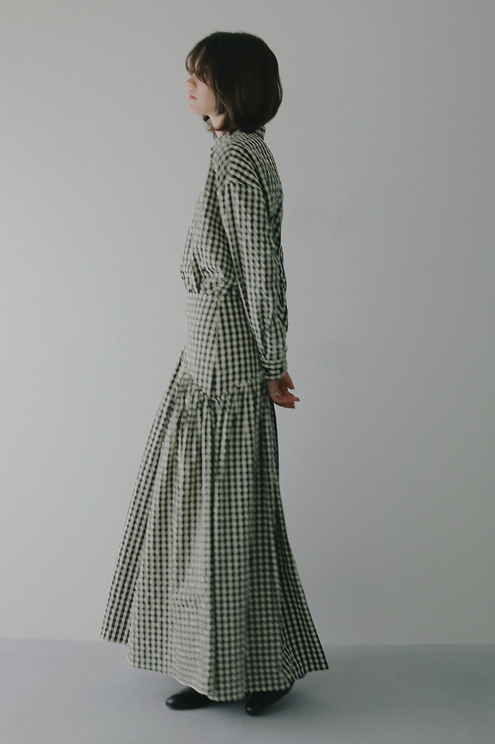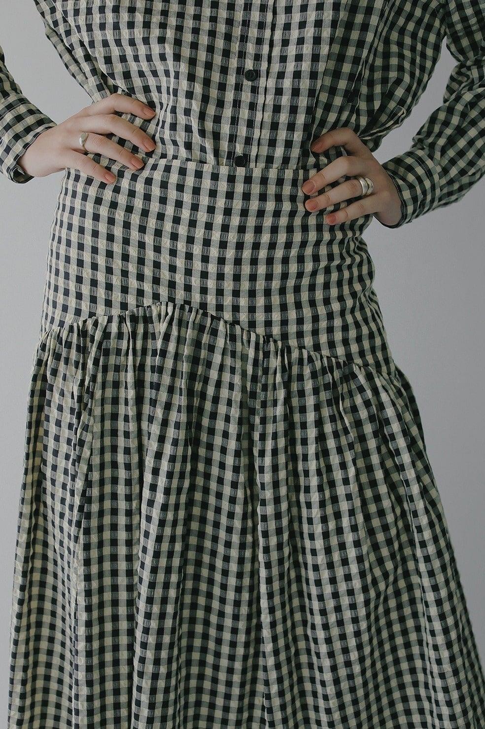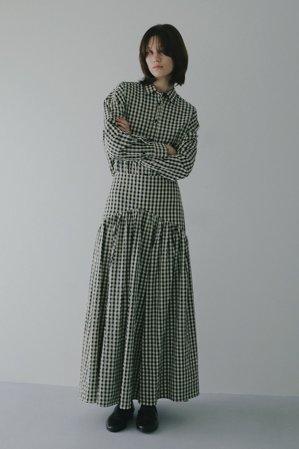 凹凸のある織り柄が表情豊かなギンガムチェック生地のギャザー切り替えスカート。