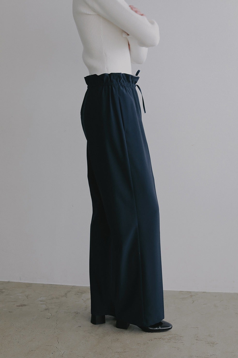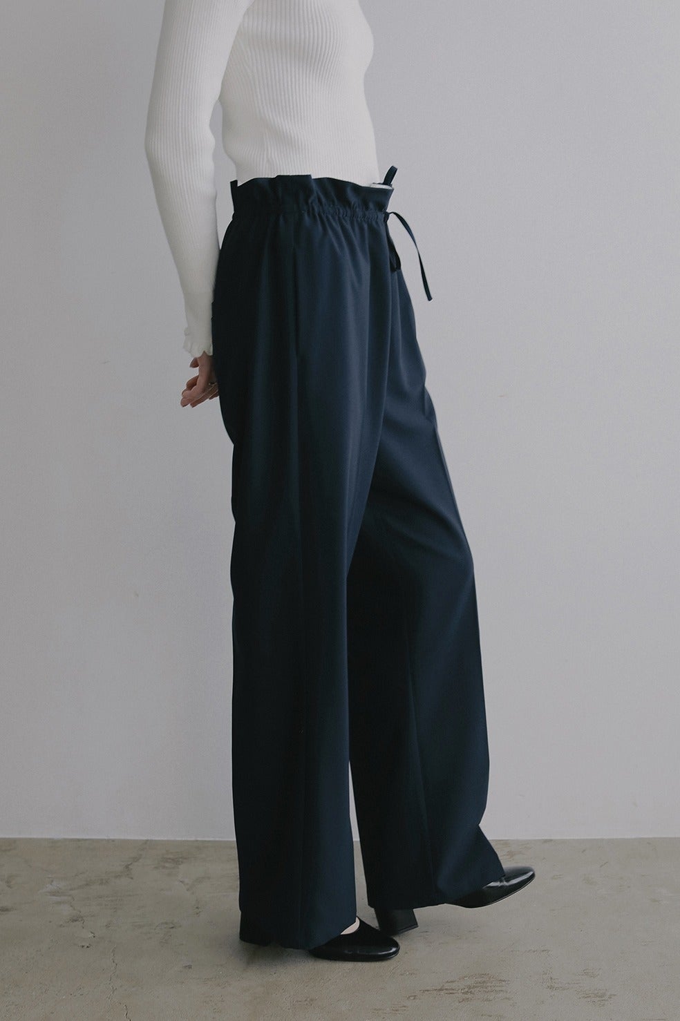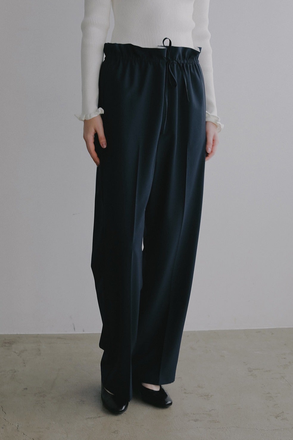 ウエストを絞って履くことでフリルのようなデザインになるストレートパンツ。