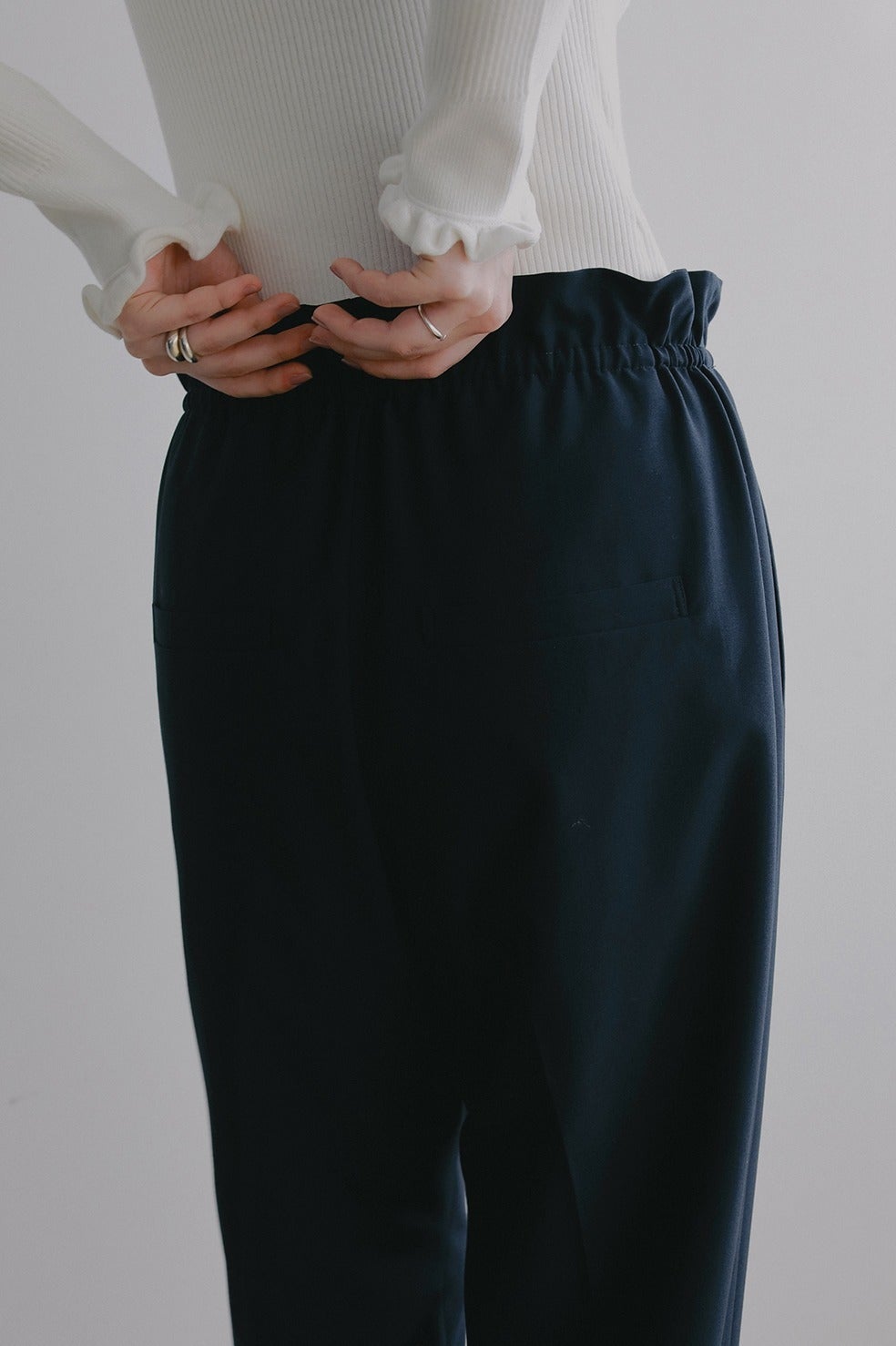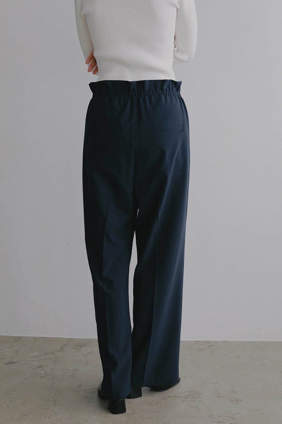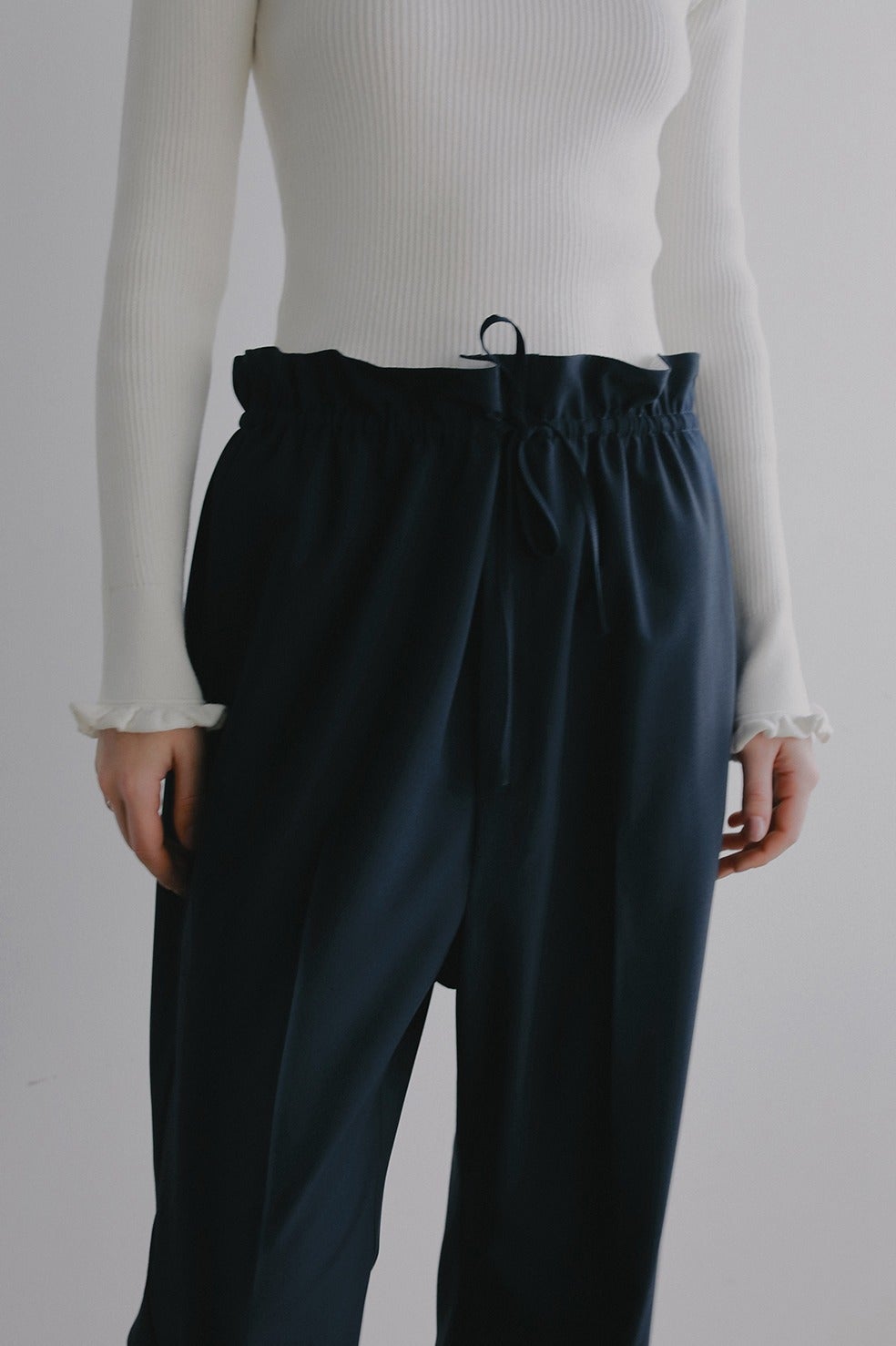 ウエストを絞って履くことでフリルのようなデザインになるストレートパンツ。
