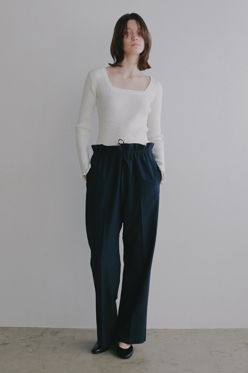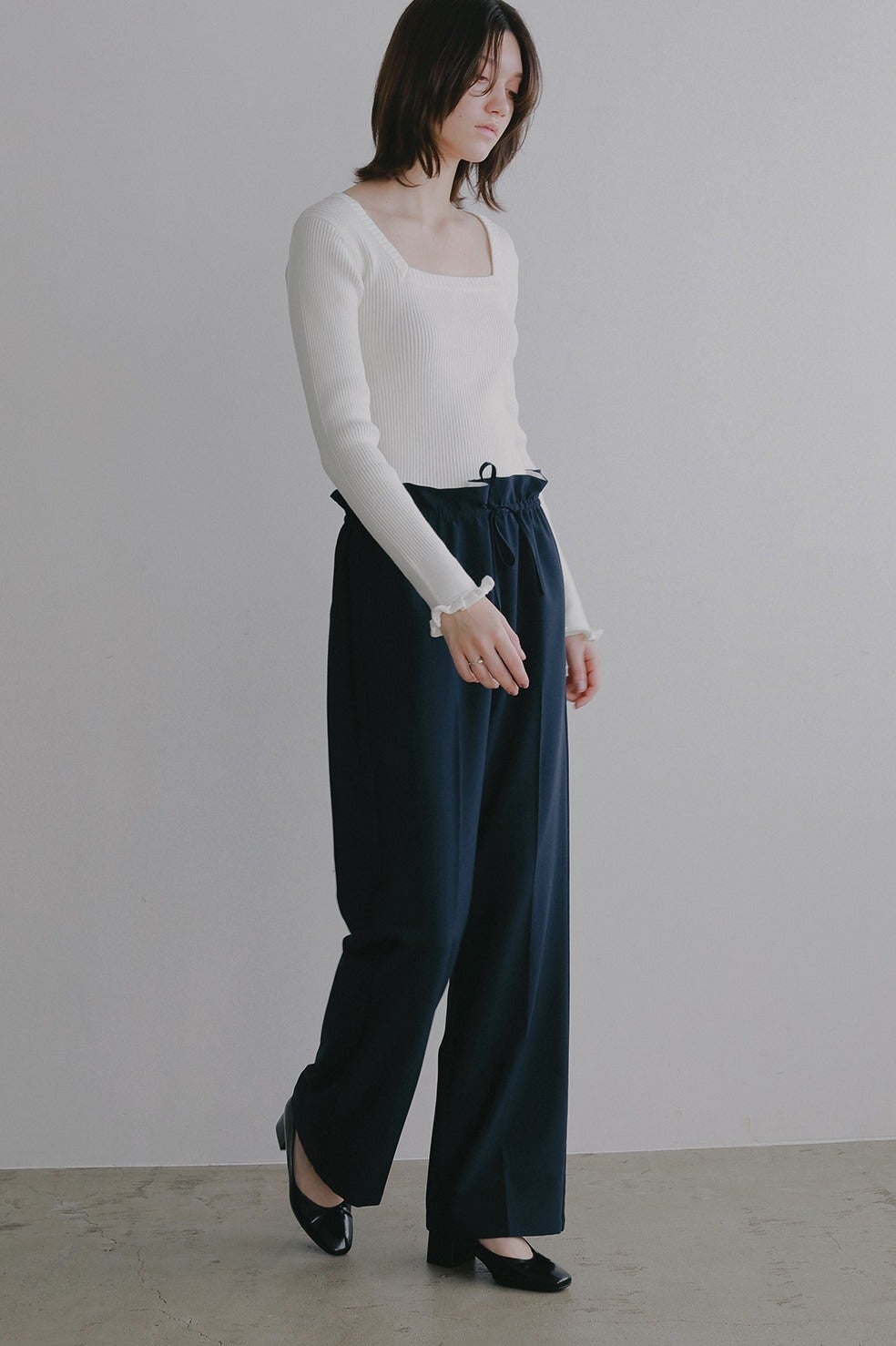 トップスのバランスに合わせて、ハイウエストからローウエストにも紐で調整してアレンジしていただけます。