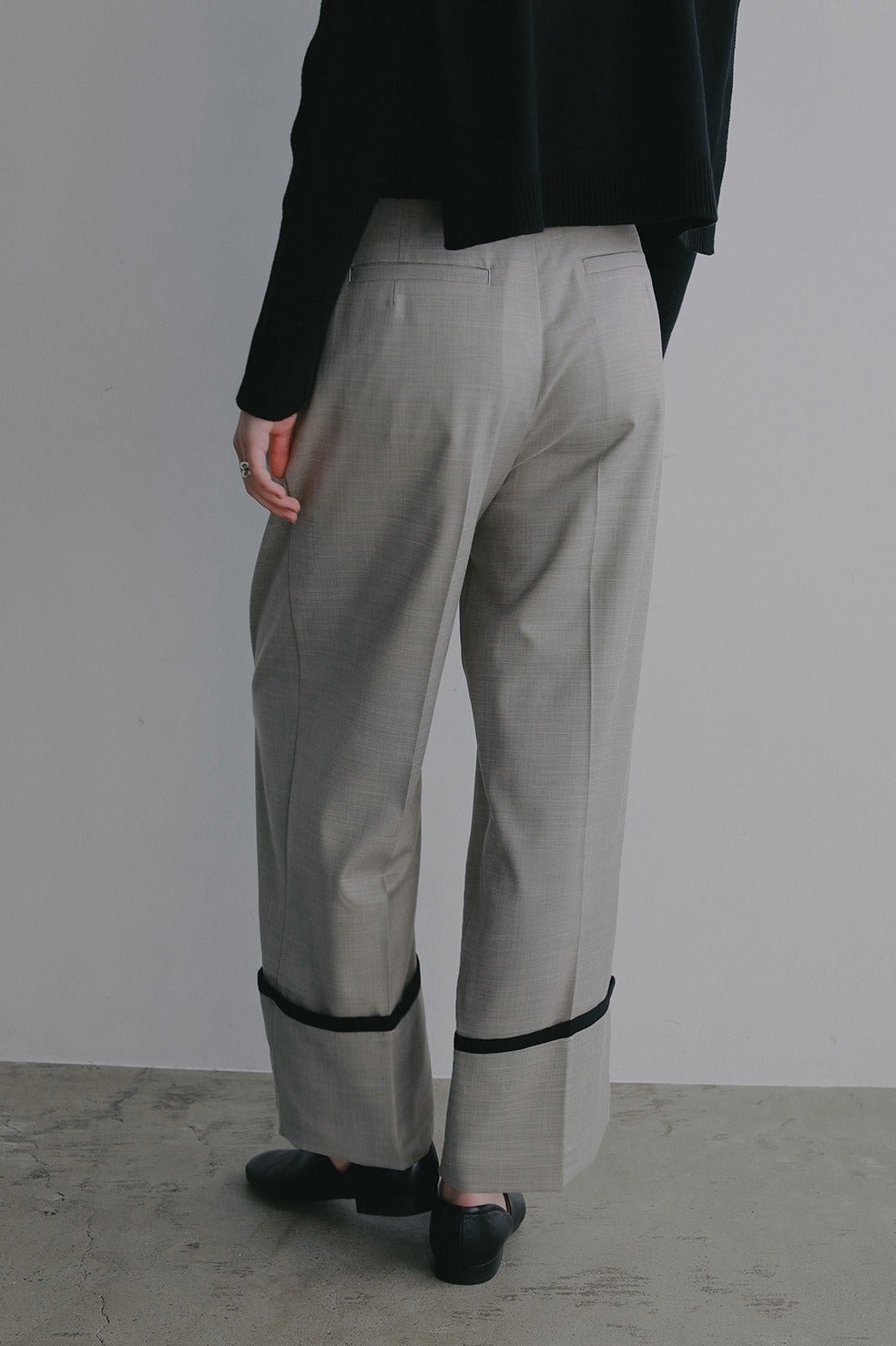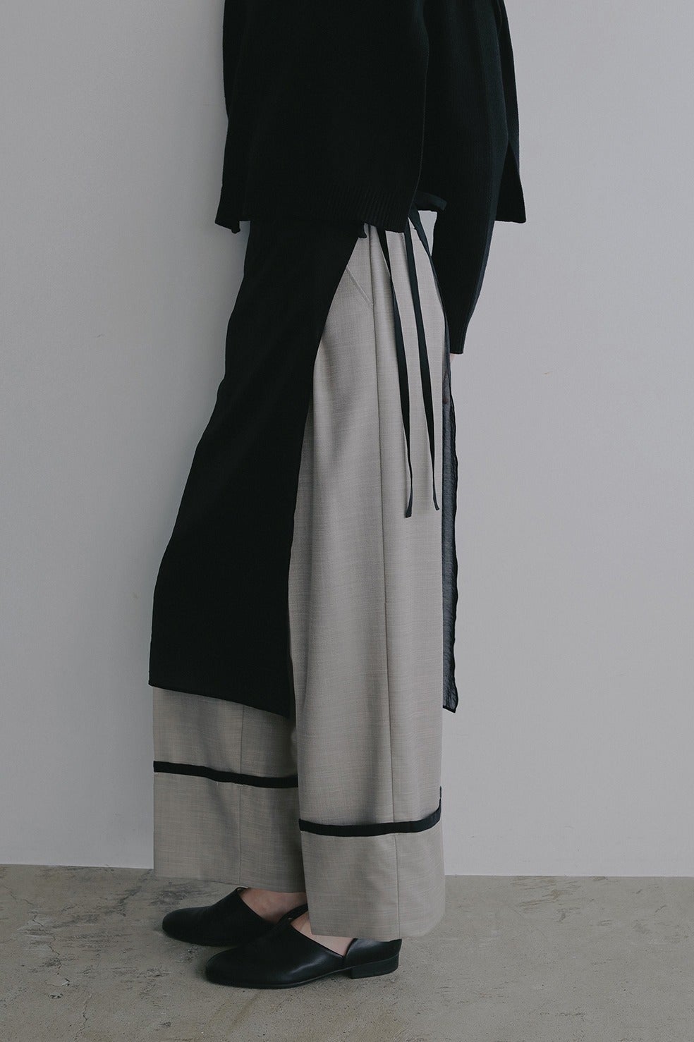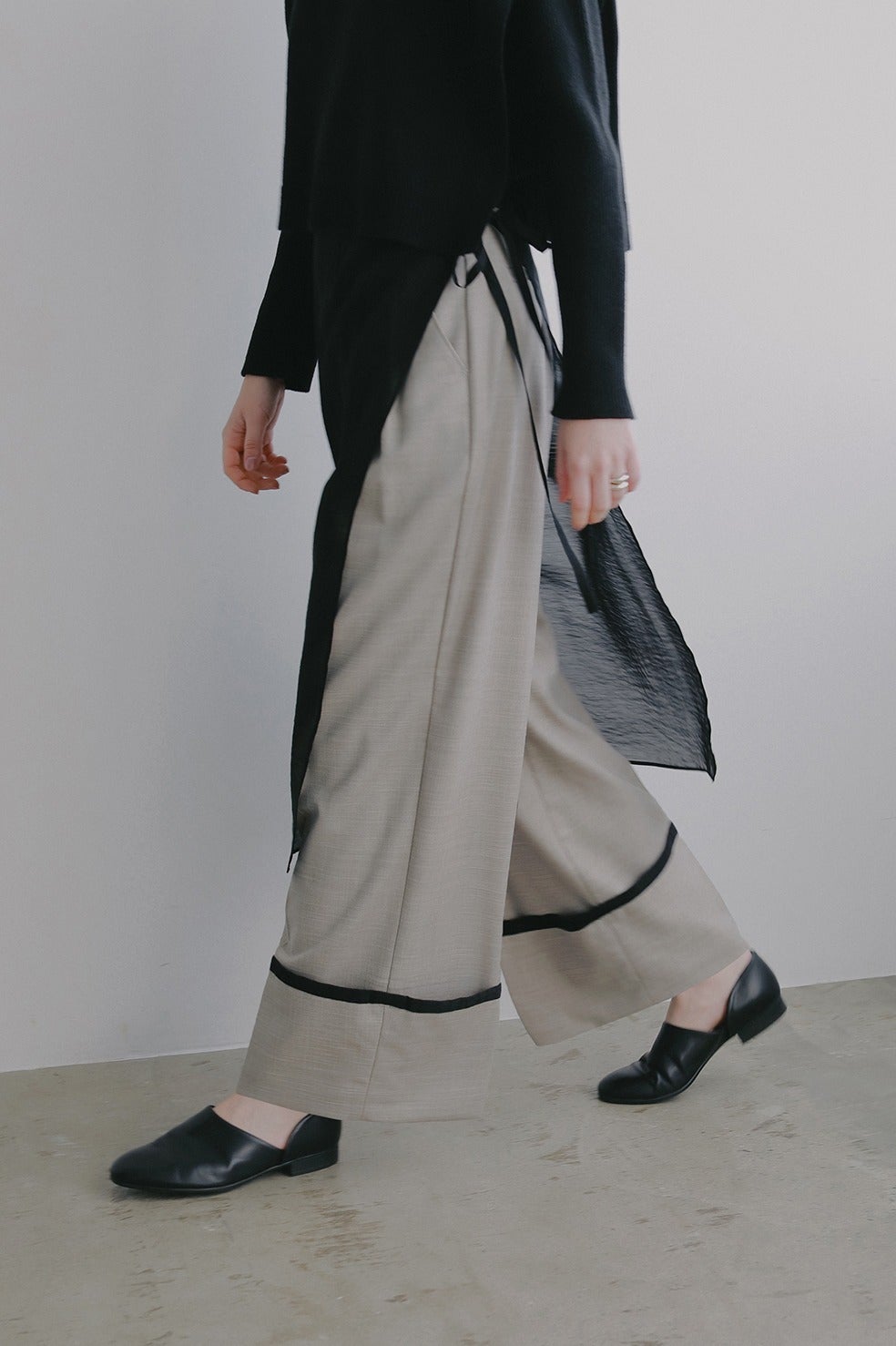 ワイドパンツは細めのベルト幅と裾に入れたパイピングデザインがポイント。