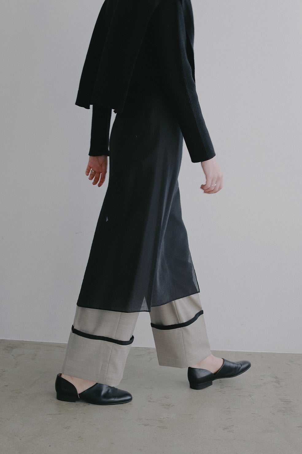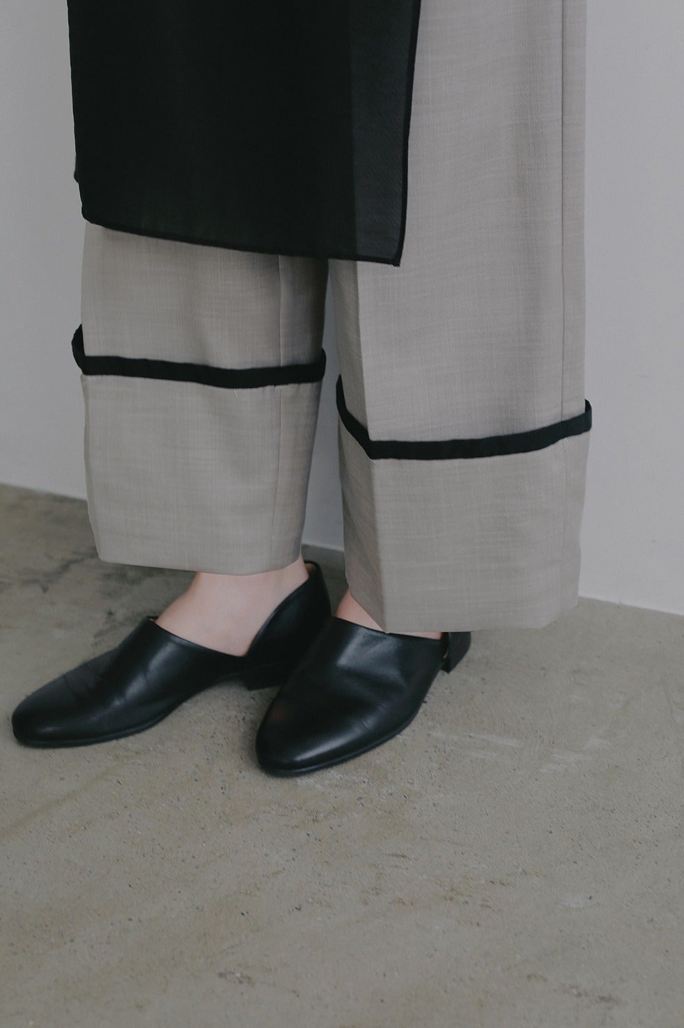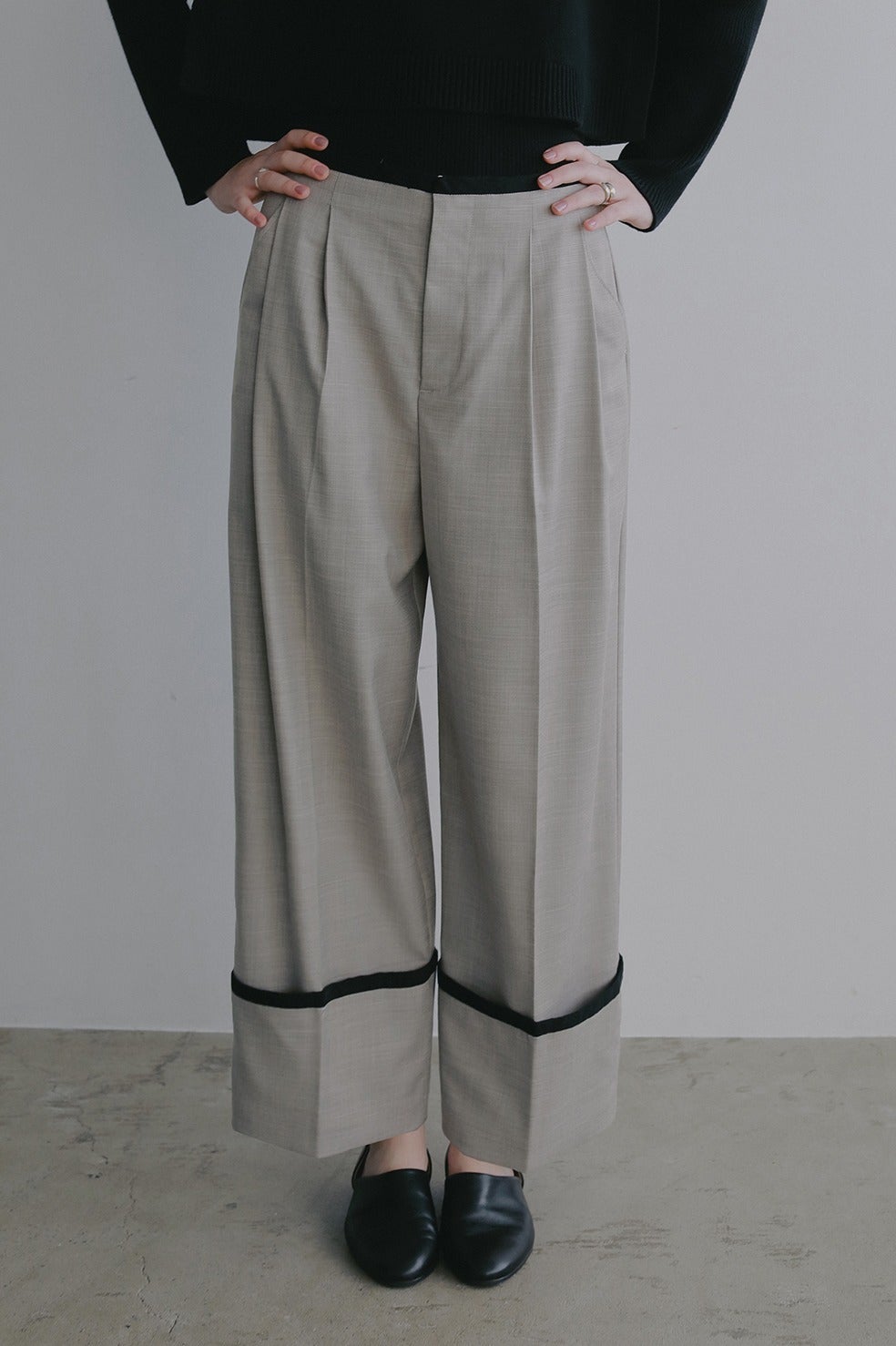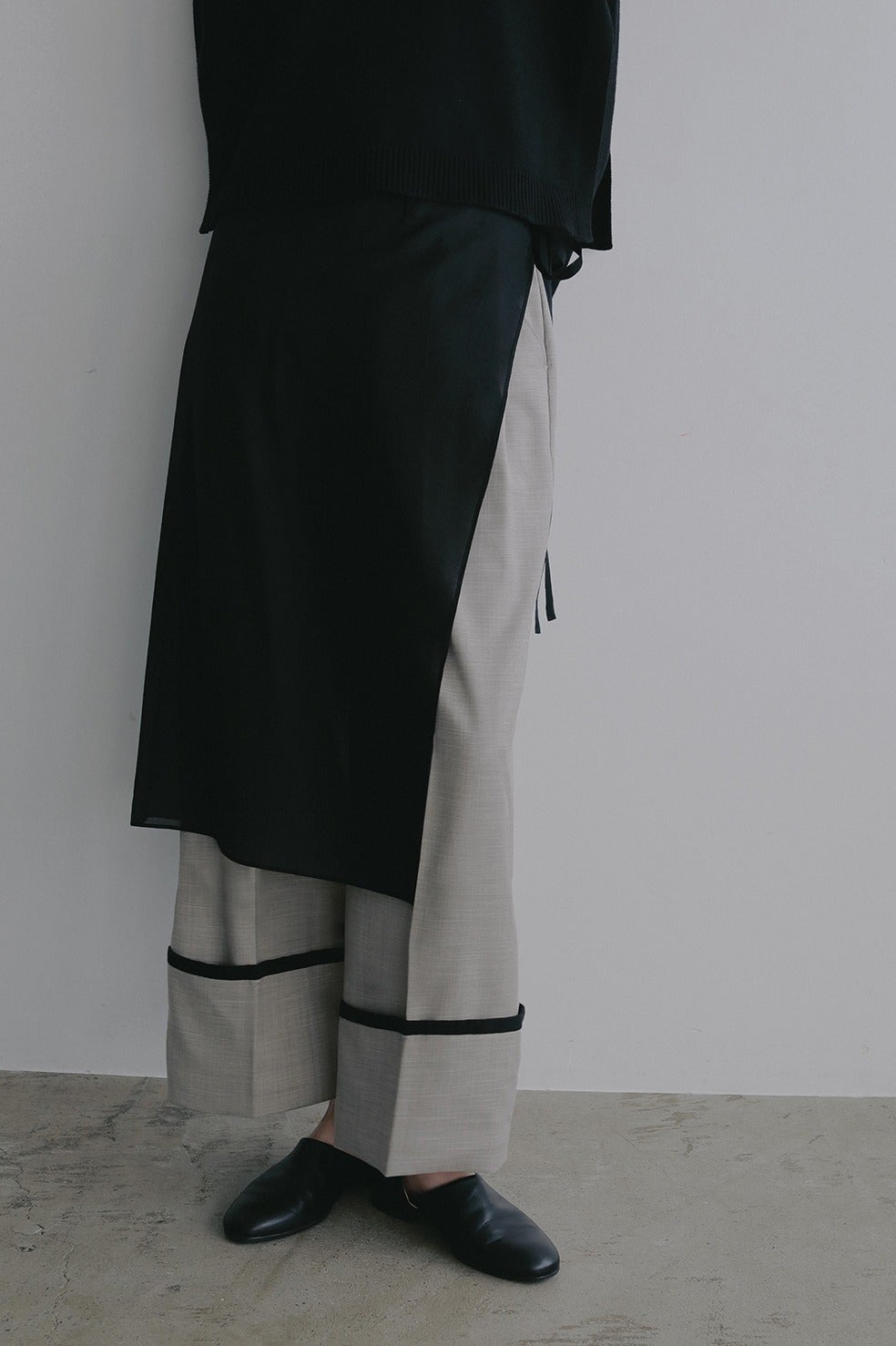 ワイドパンツは細めのベルト幅と裾に入れたパイピングデザインがポイント。