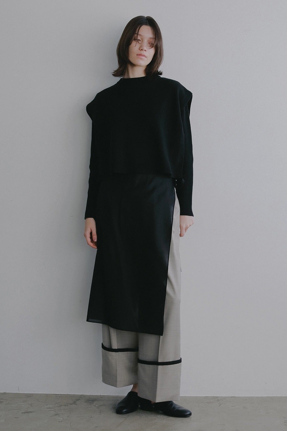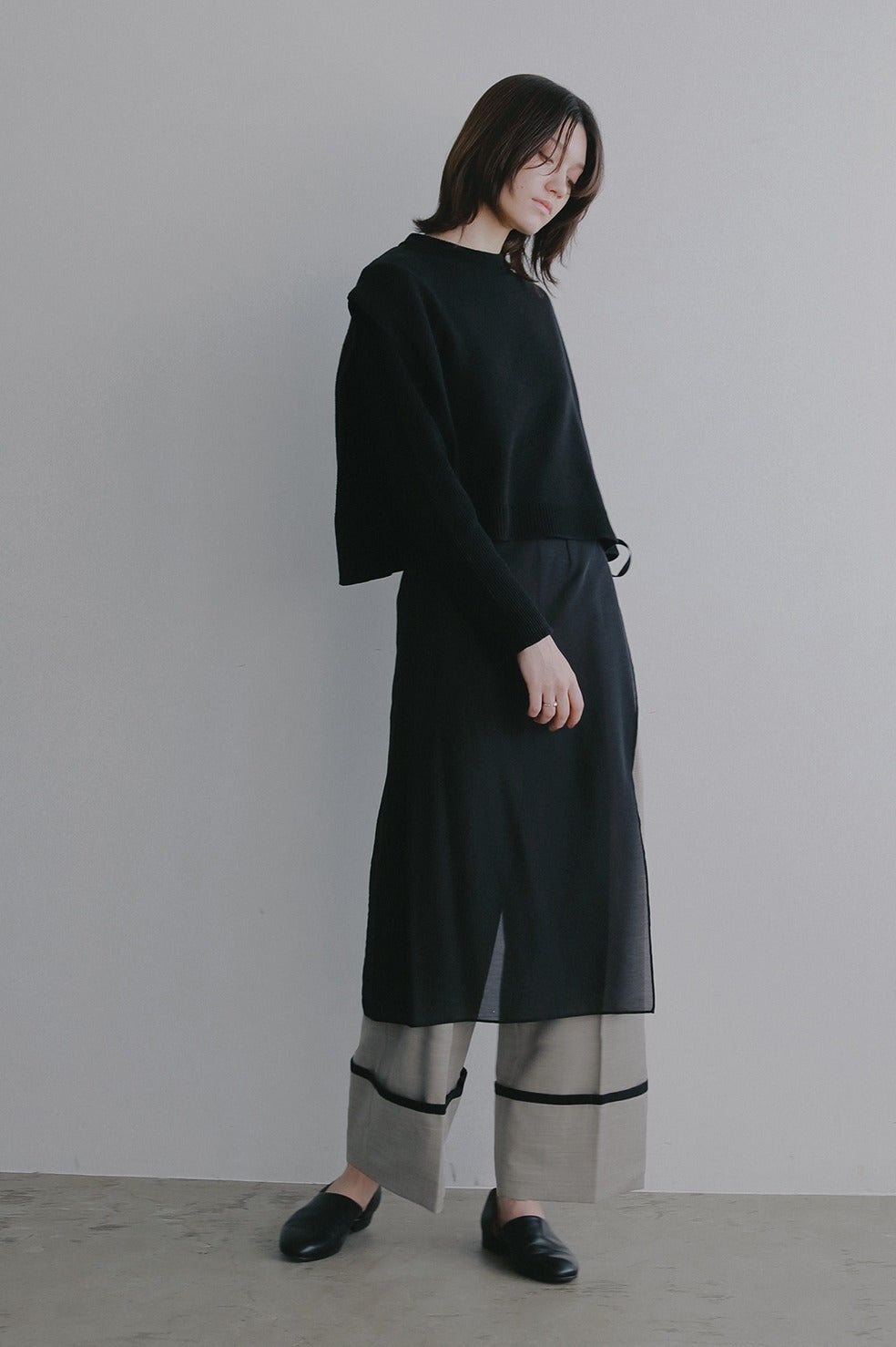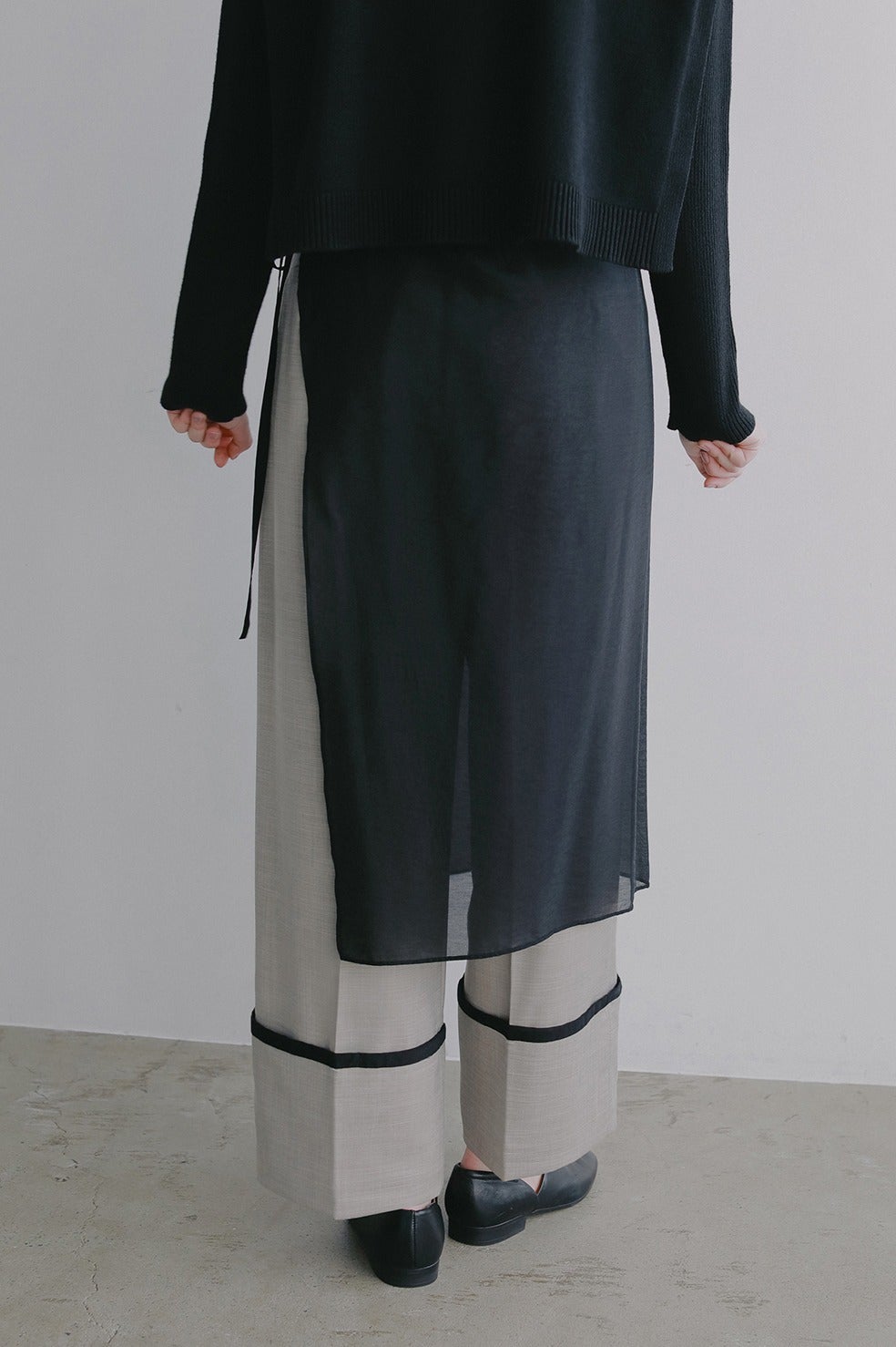 ハリのあるシアー素材のスカートは巻きスカートタイプなので、お手持ちのデニムやレギンス、スカートなどと合わせたり様々なレイヤードスタイルにお使いいただけます。