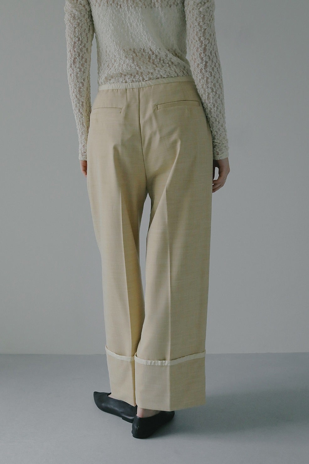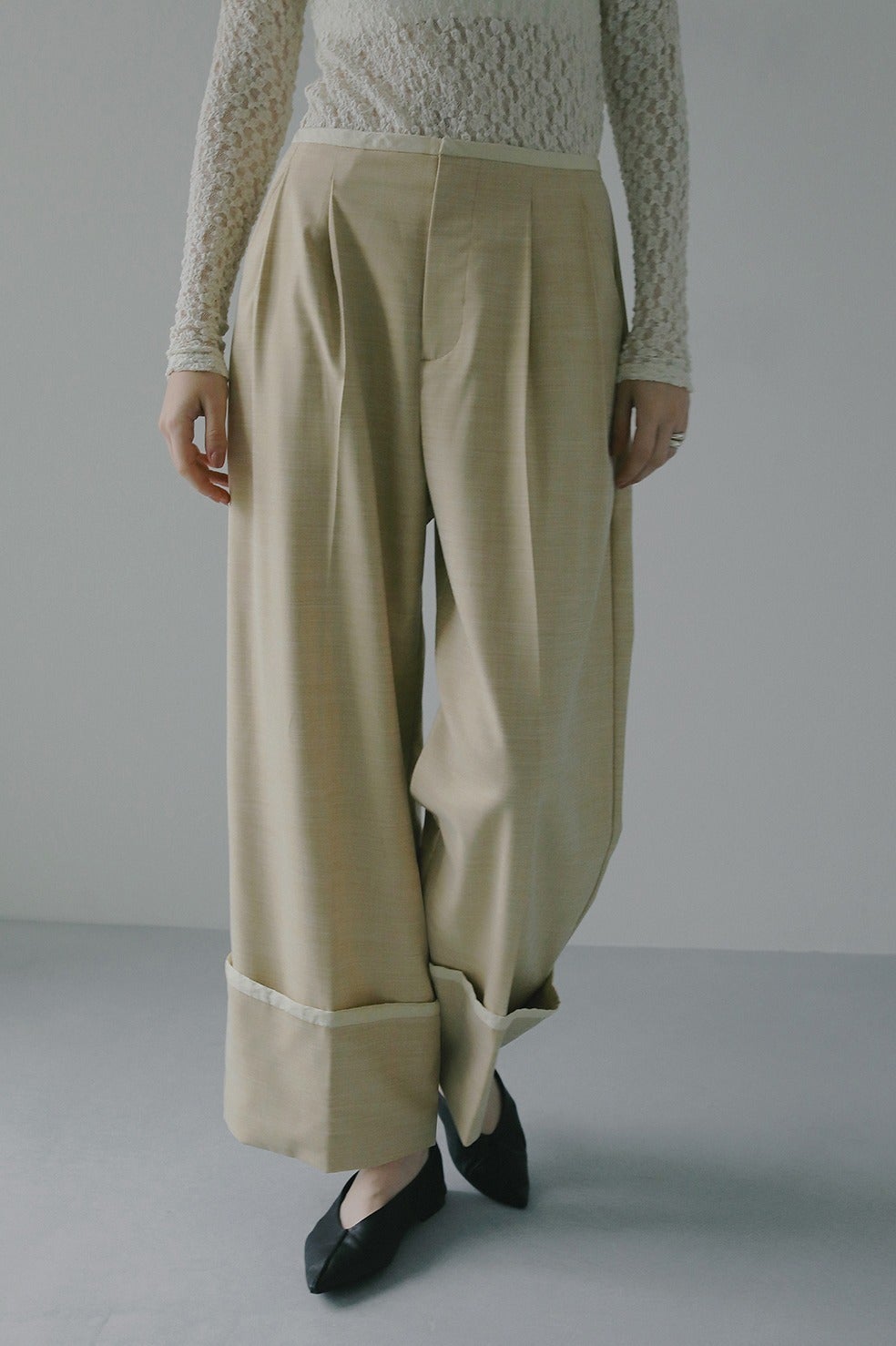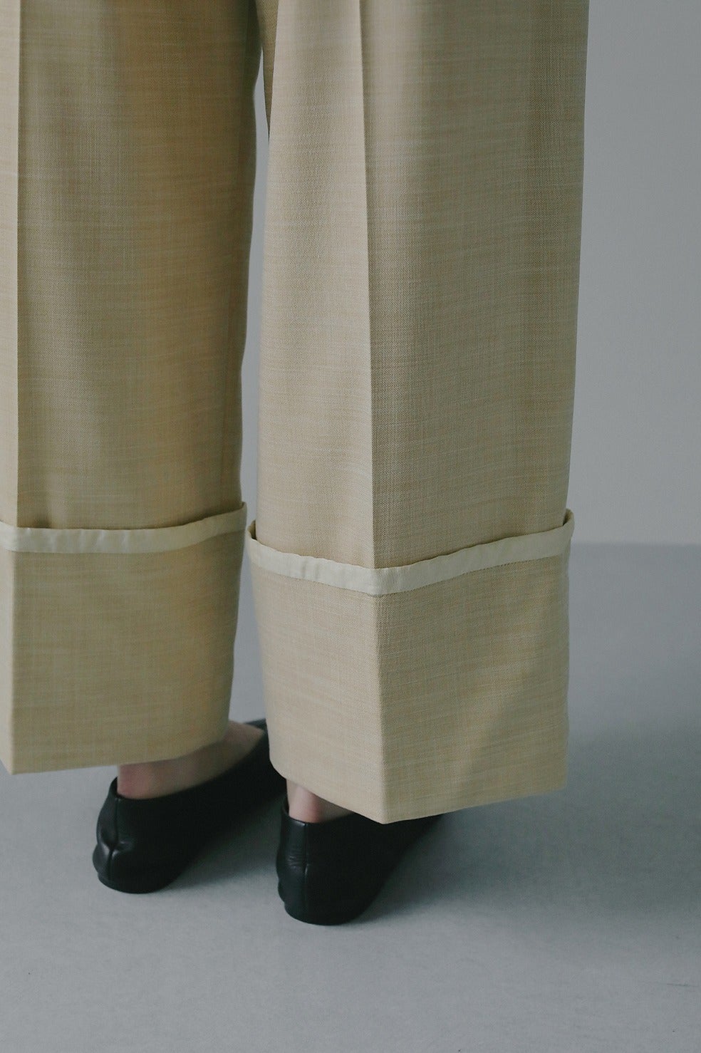 ワイドパンツは細めのベルト幅と裾に入れたパイピングデザインがポイント。