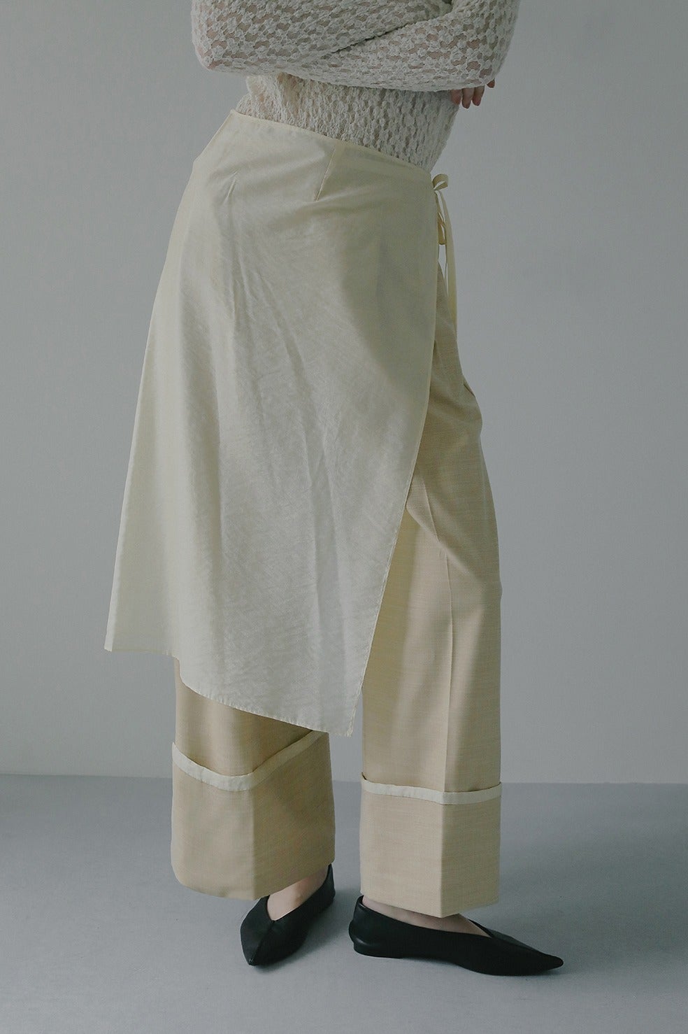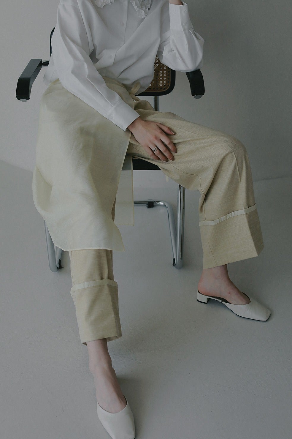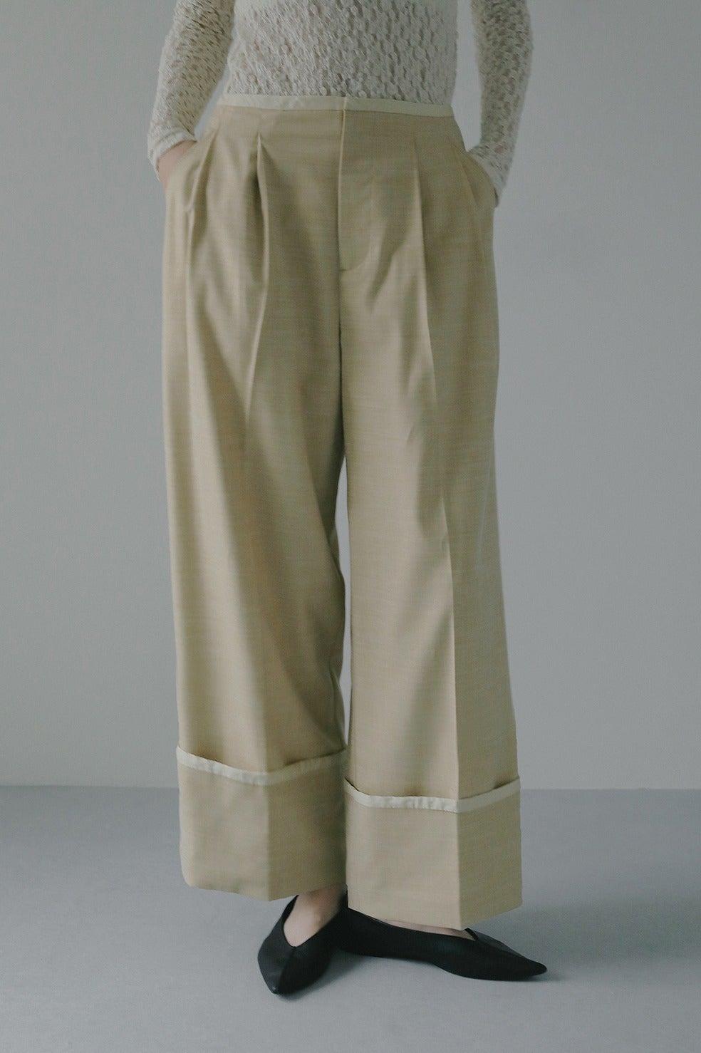 ワイドパンツは細めのベルト幅と裾に入れたパイピングデザインがポイント。