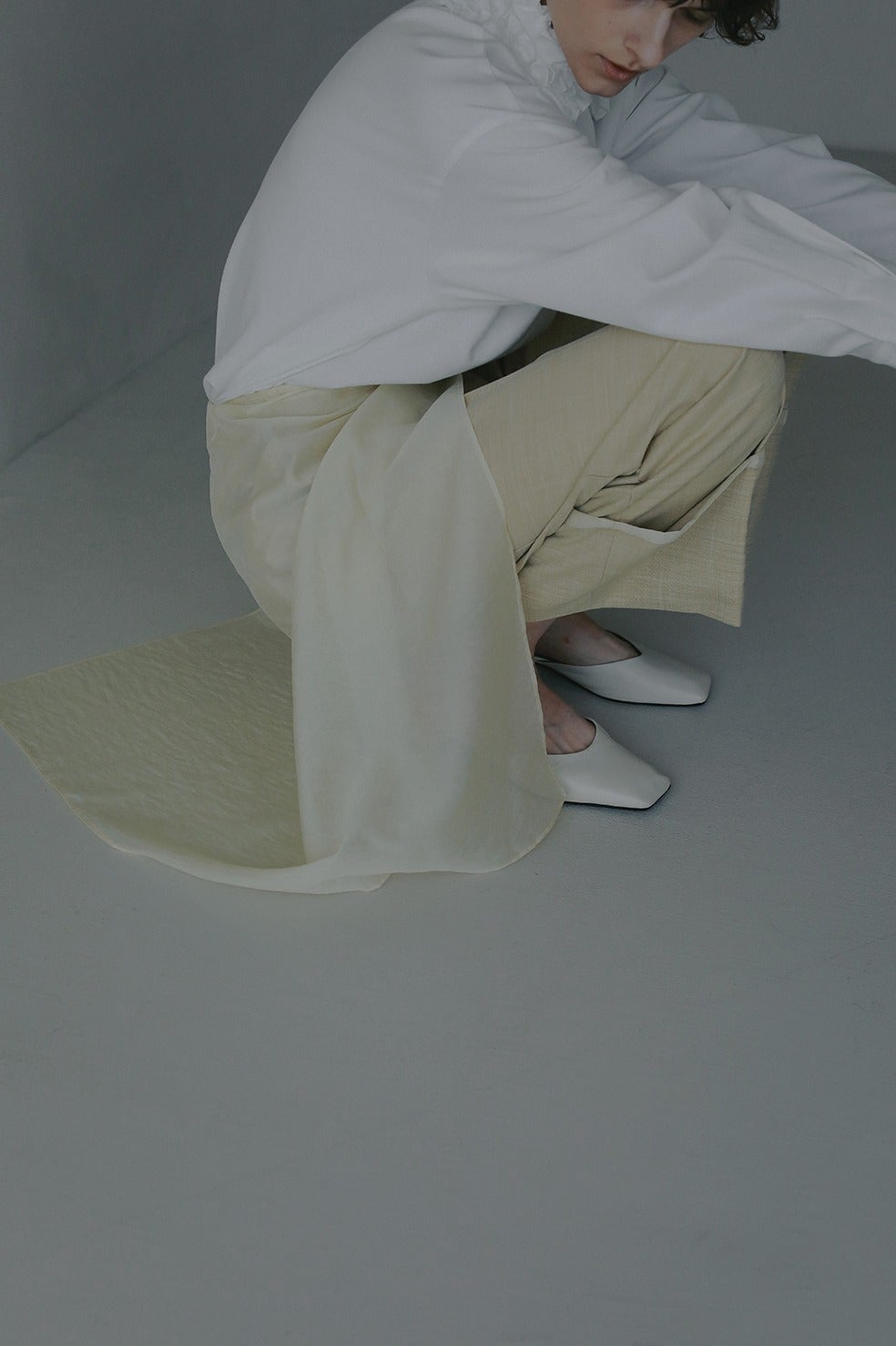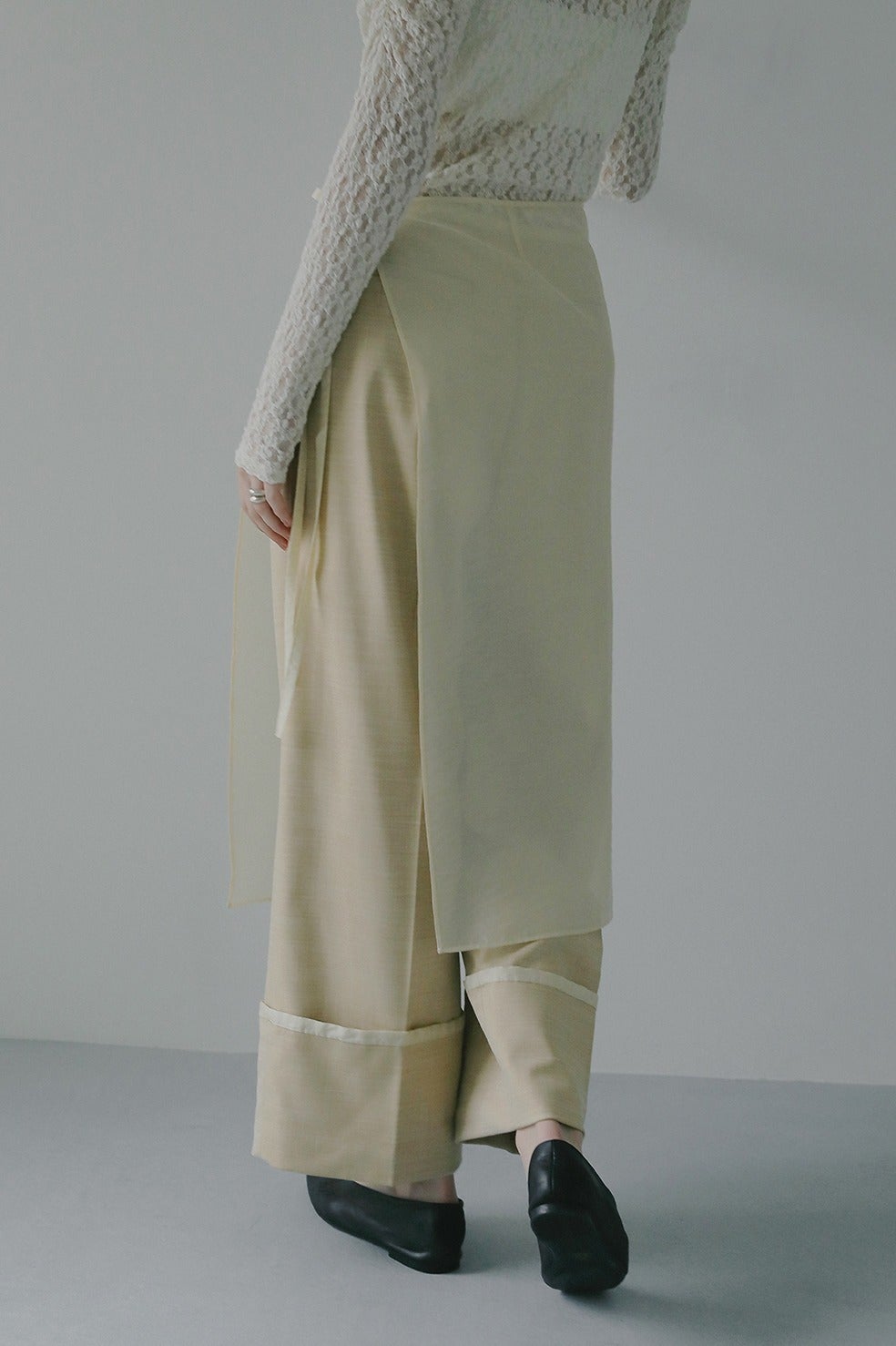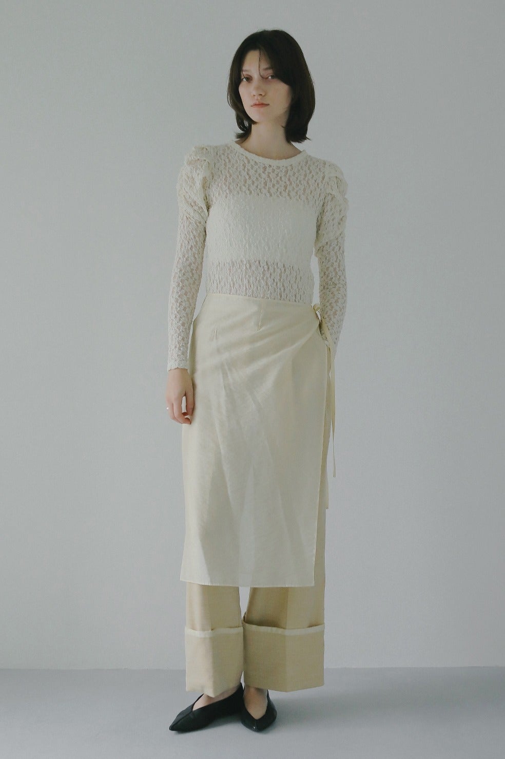 ハリのあるシアー素材のスカートは巻きスカートタイプなので、お手持ちのデニムやレギンス、スカートなどと合わせたり様々なレイヤードスタイルにお使いいただけます。