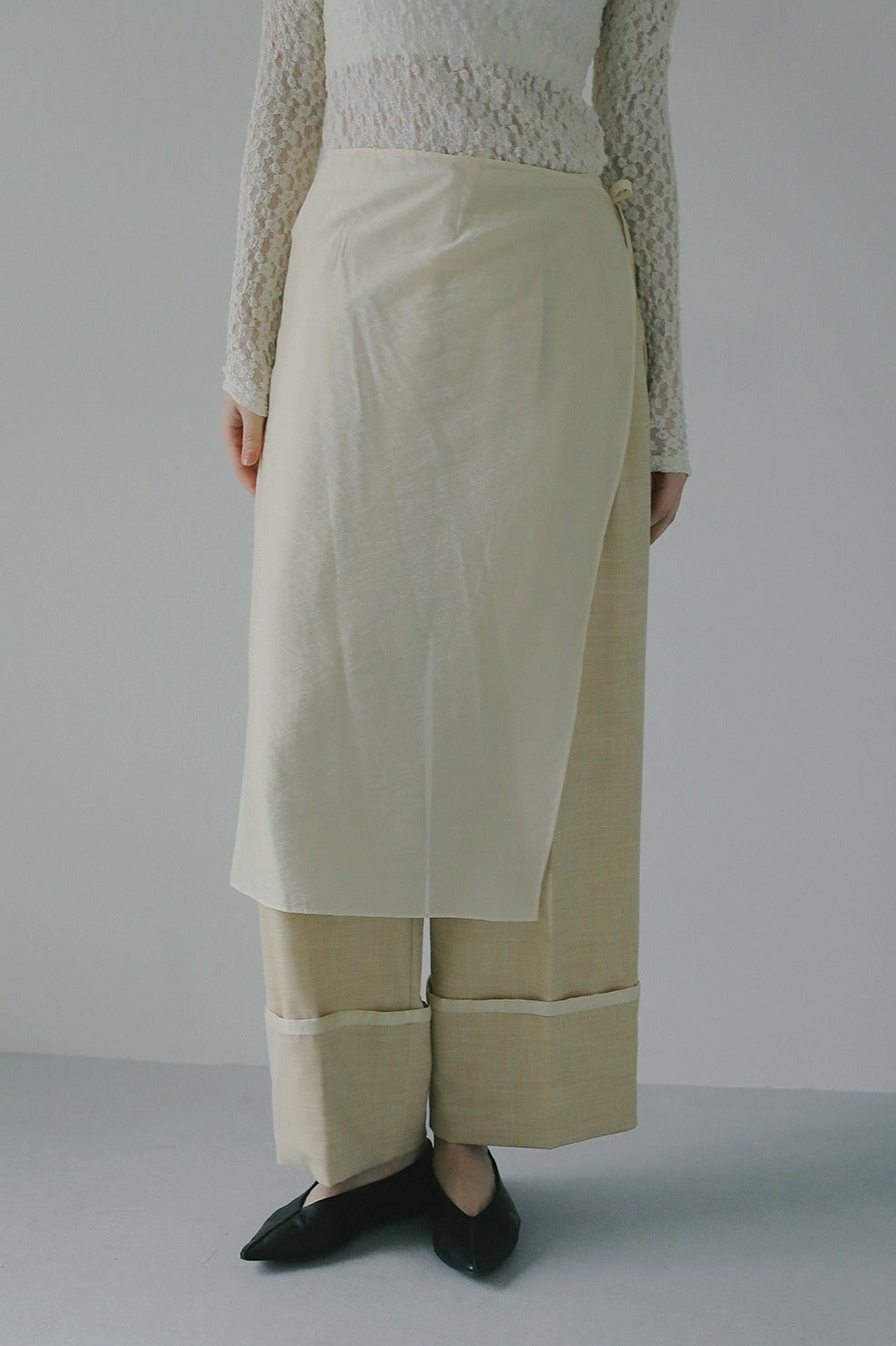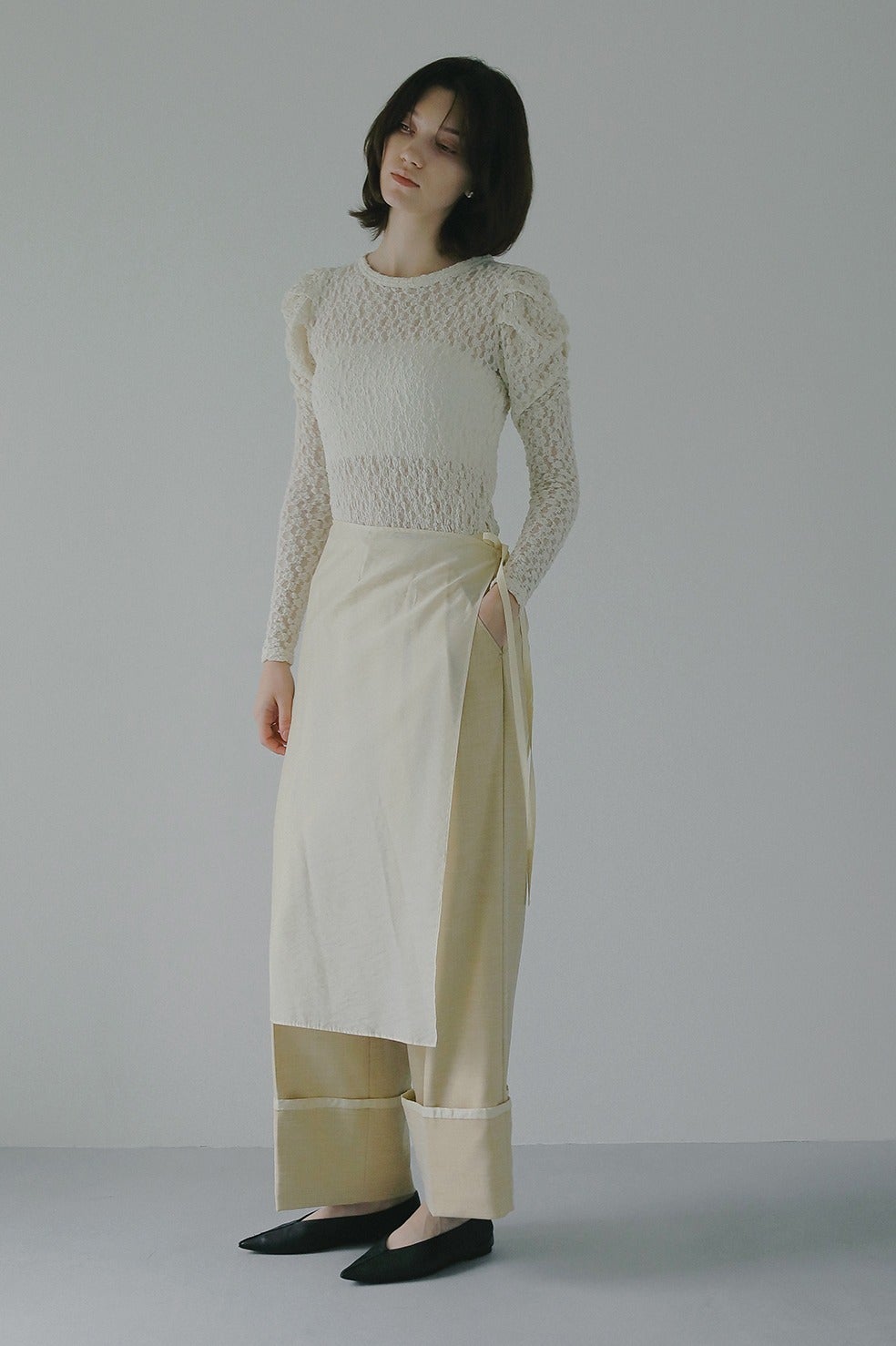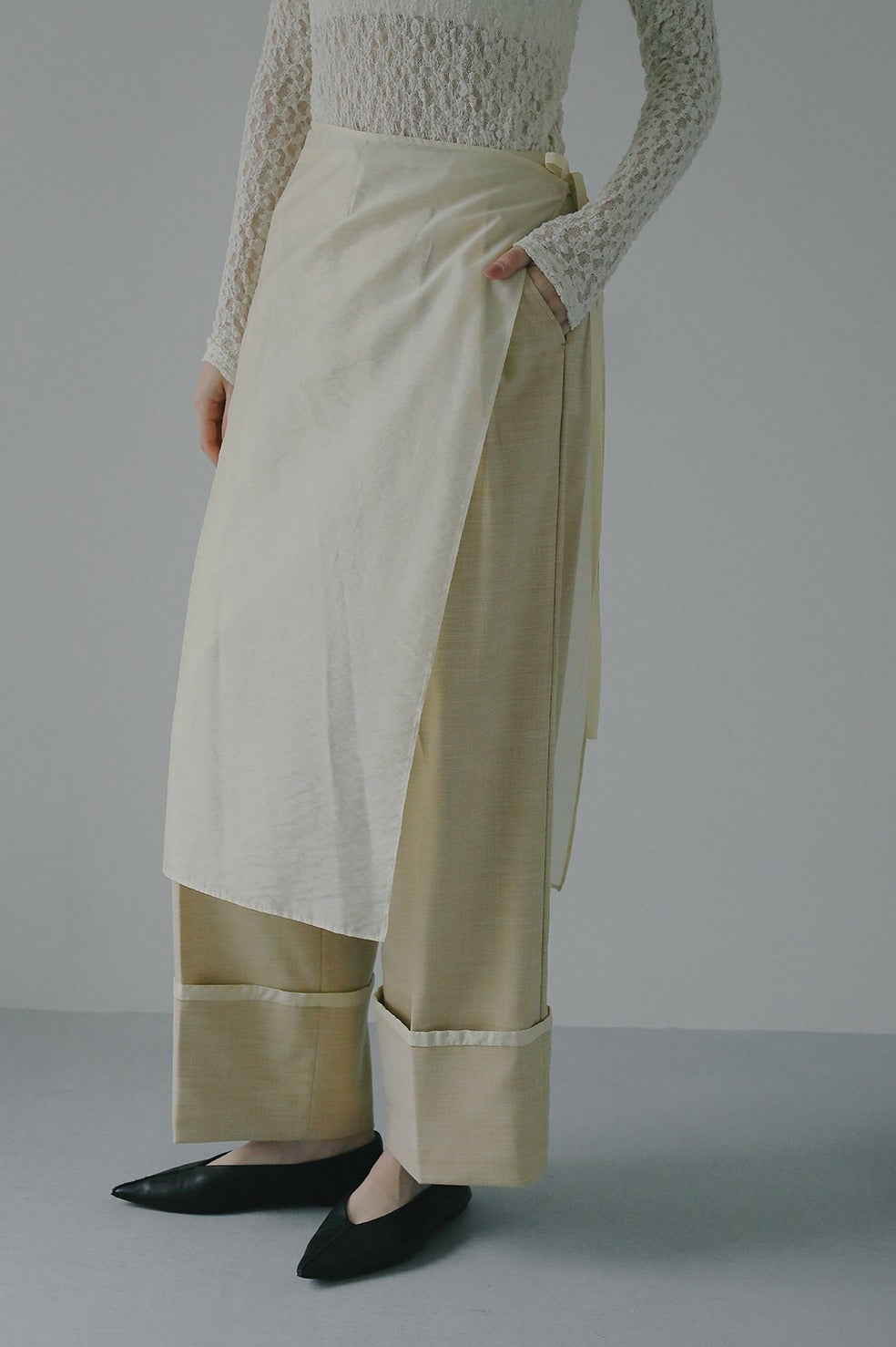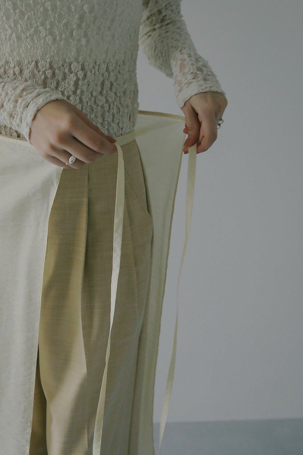 ハリのあるシアー素材のスカートは巻きスカートタイプなので、お手持ちのデニムやレギンス、スカートなどと合わせたり様々なレイヤードスタイルにお使いいただけます。