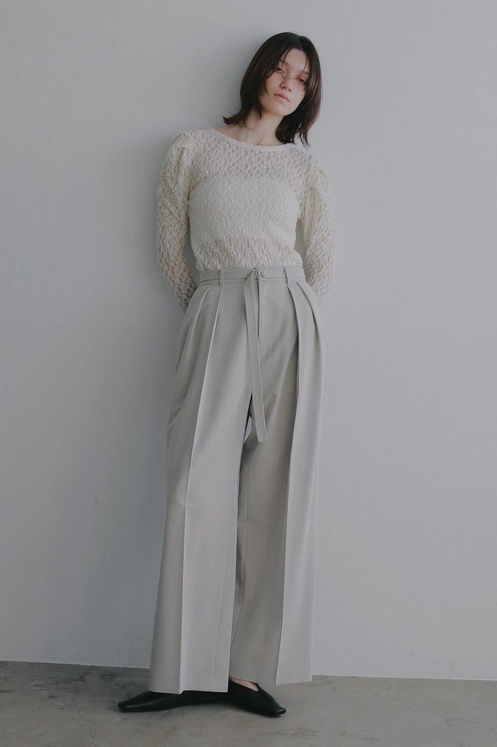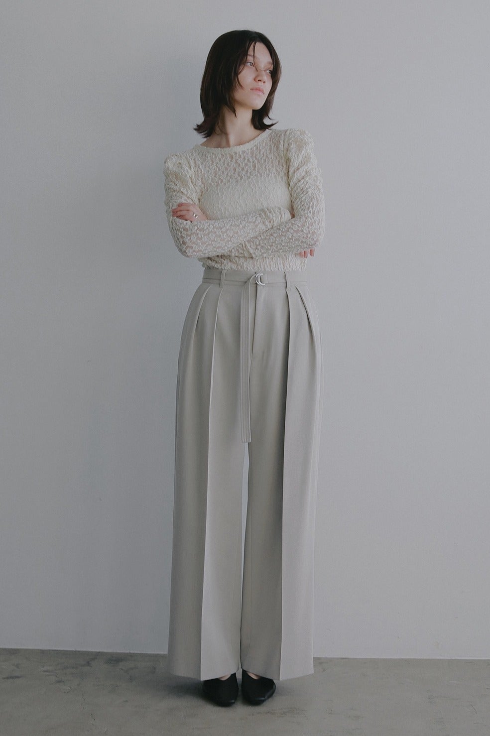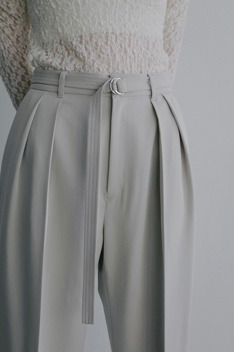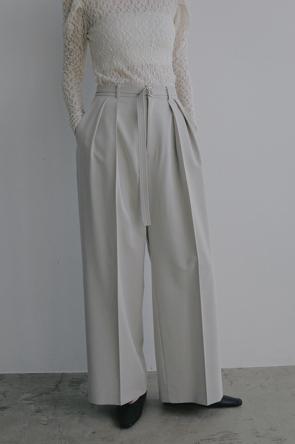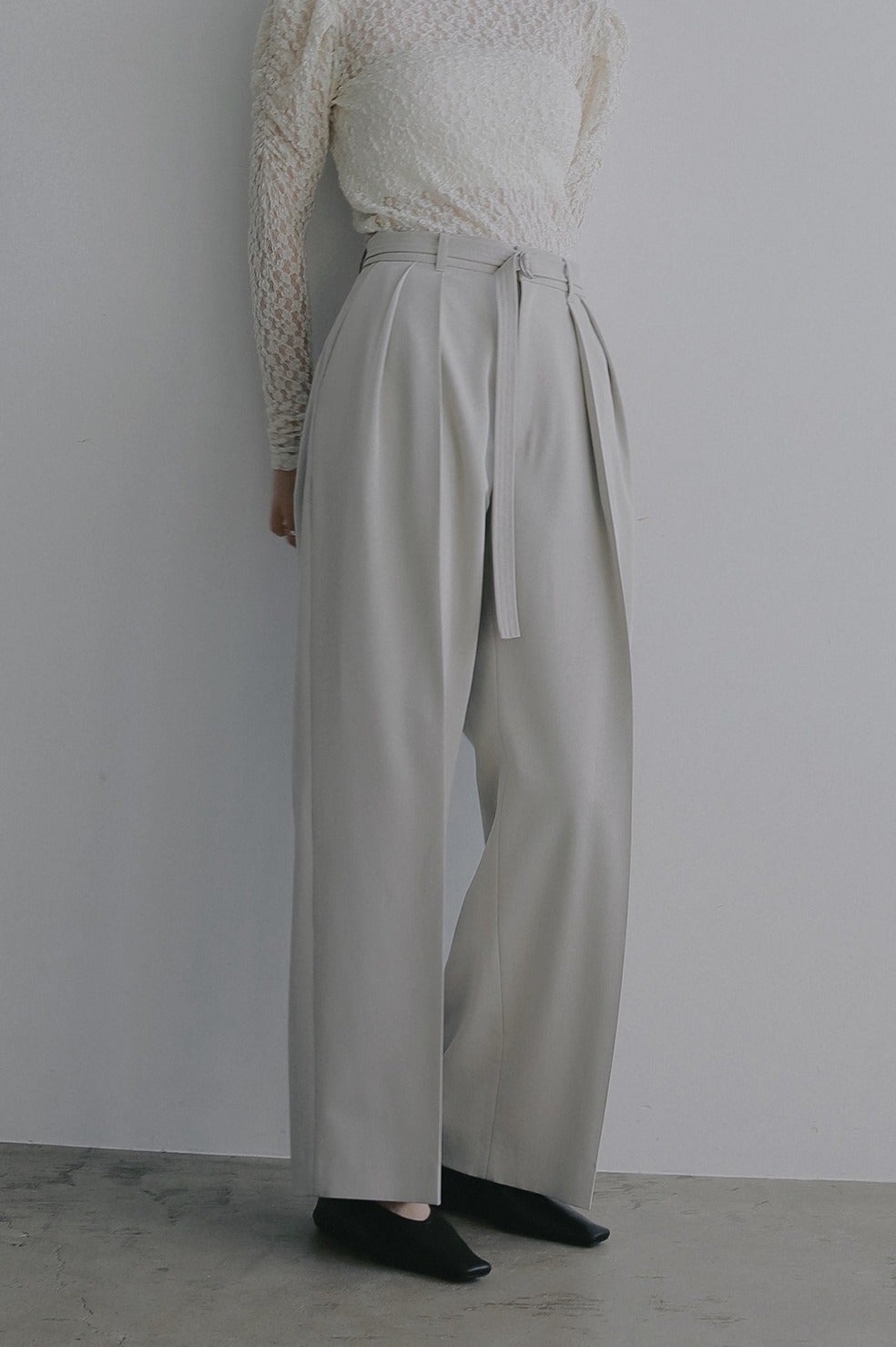共布ベルト付きでウエストをしっかりマークできる、ツータックデザインのワイドパンツ。