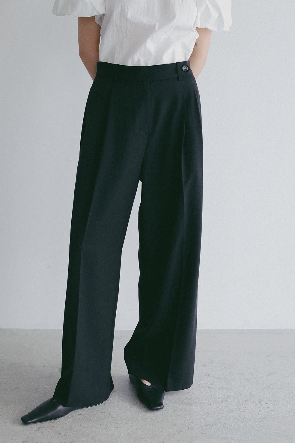 シルエットにこだわったローウエストの2タックワイドパンツ。