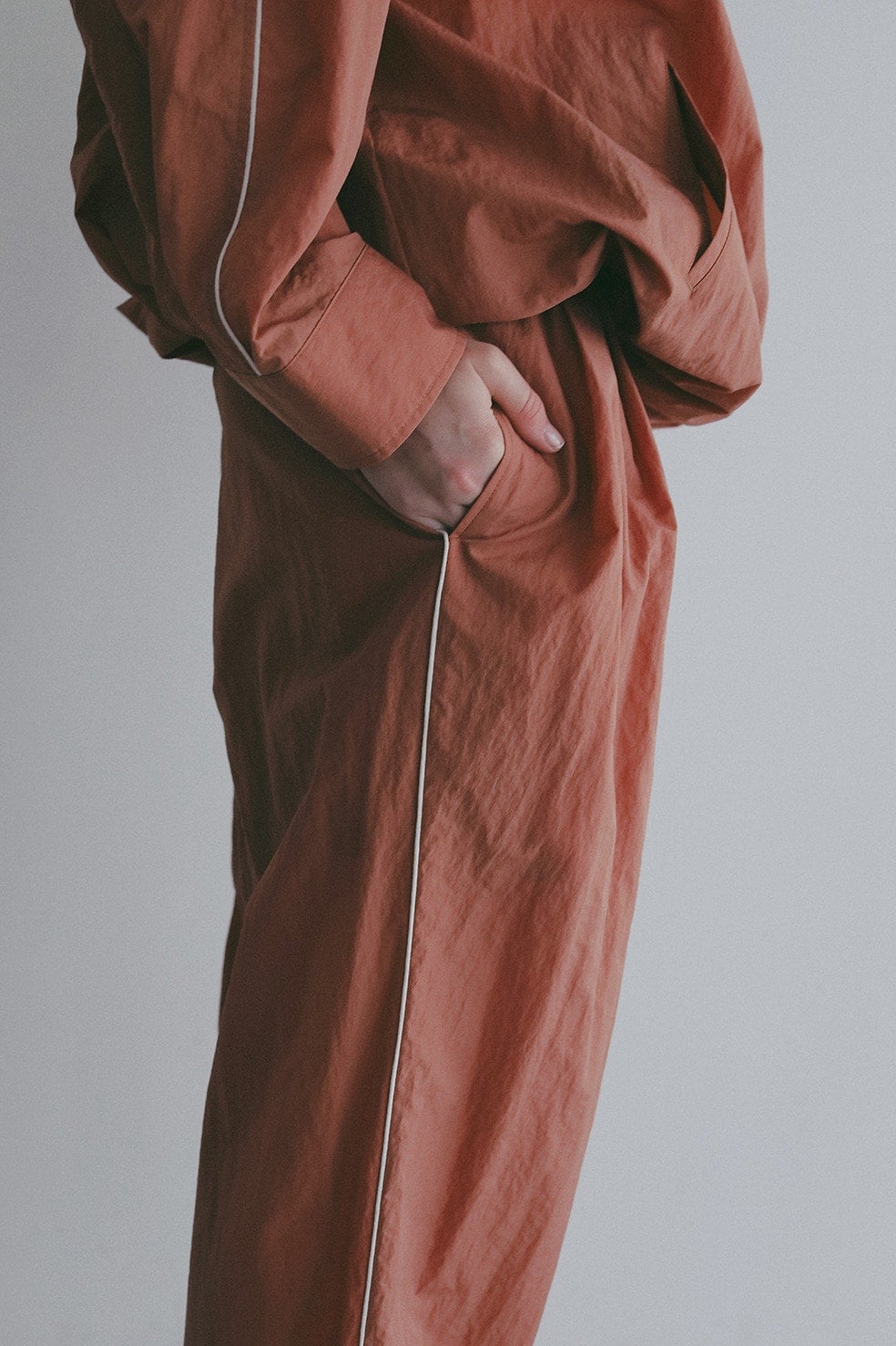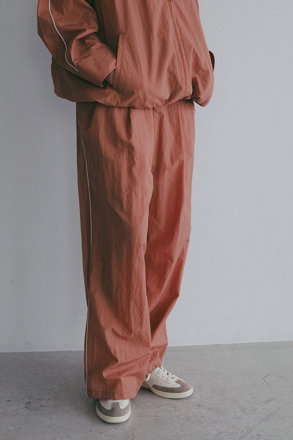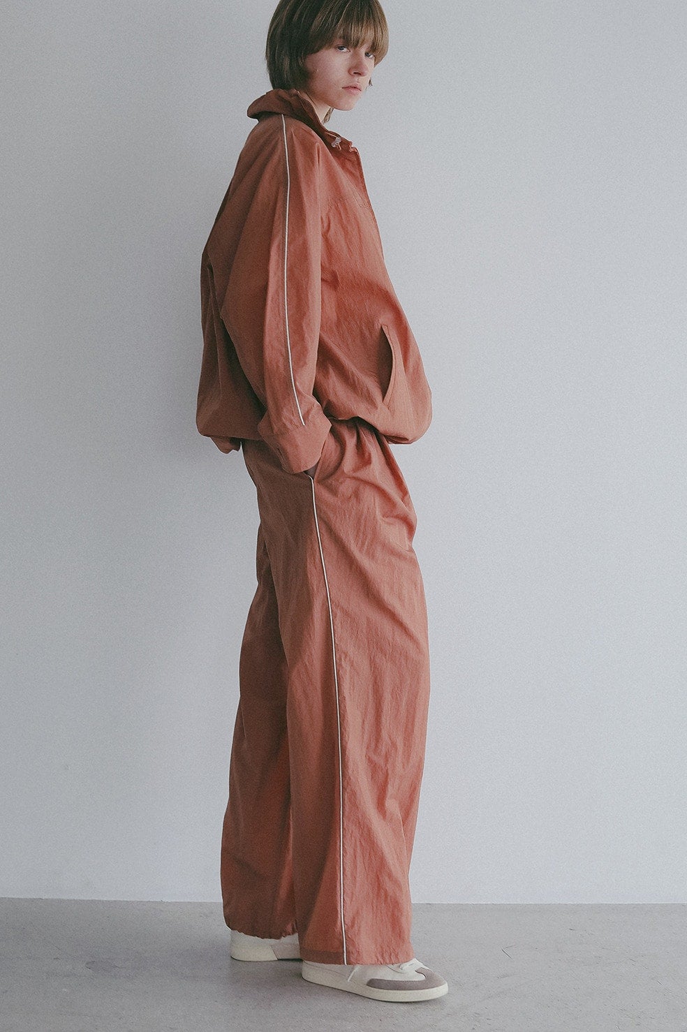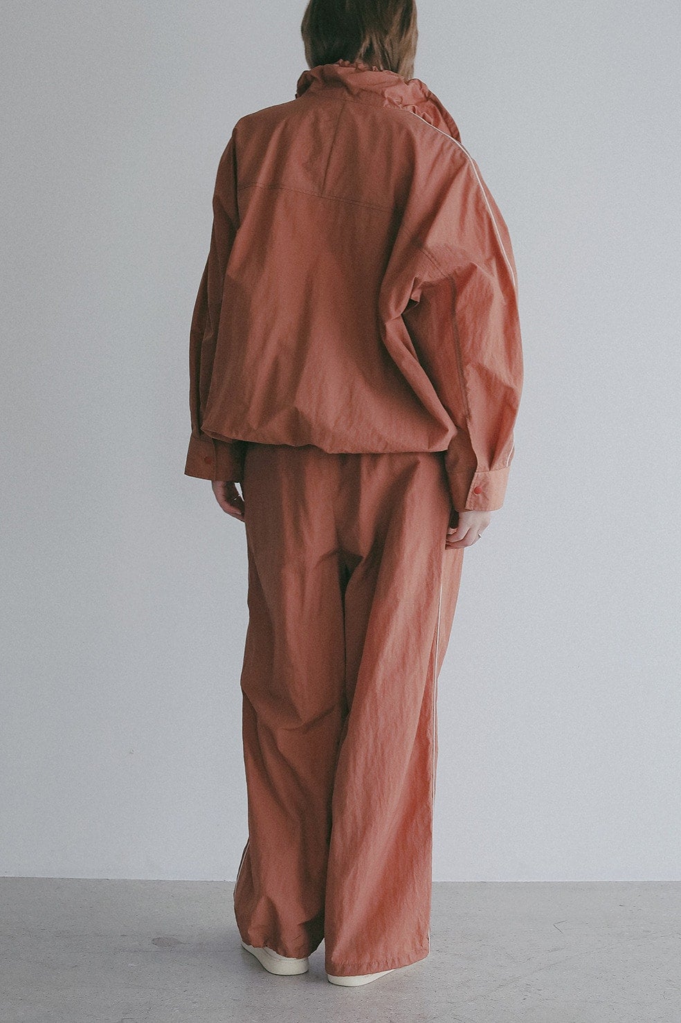 独特のシボ感と軽やかなハリが印象的な薄手のナイロンタフタを使用したワイドパンツ。