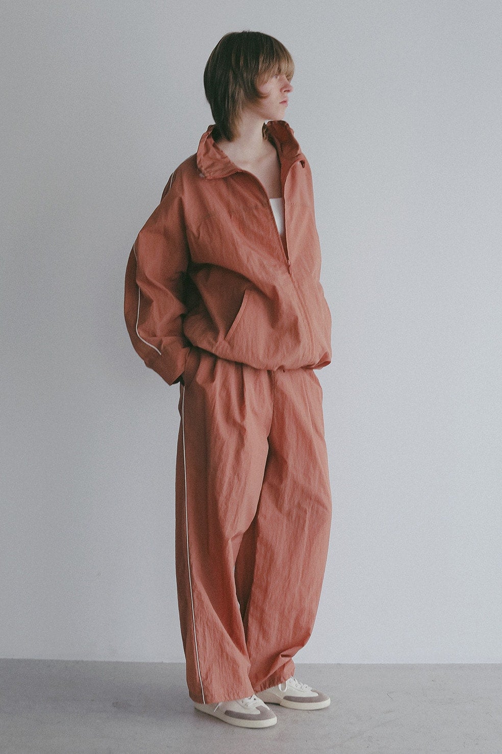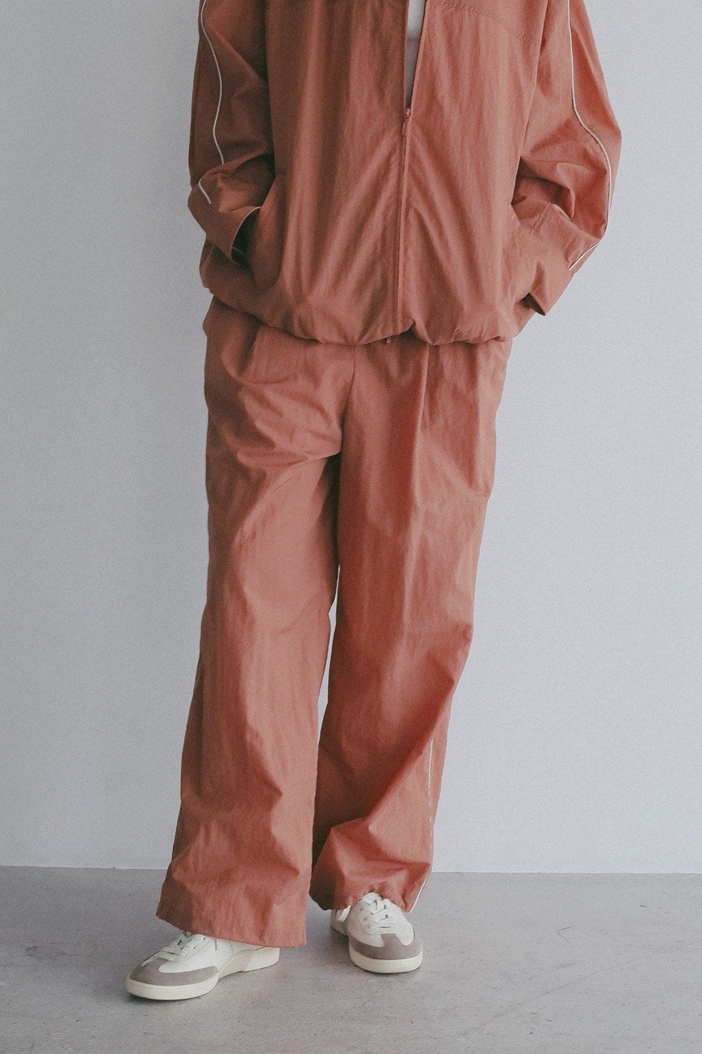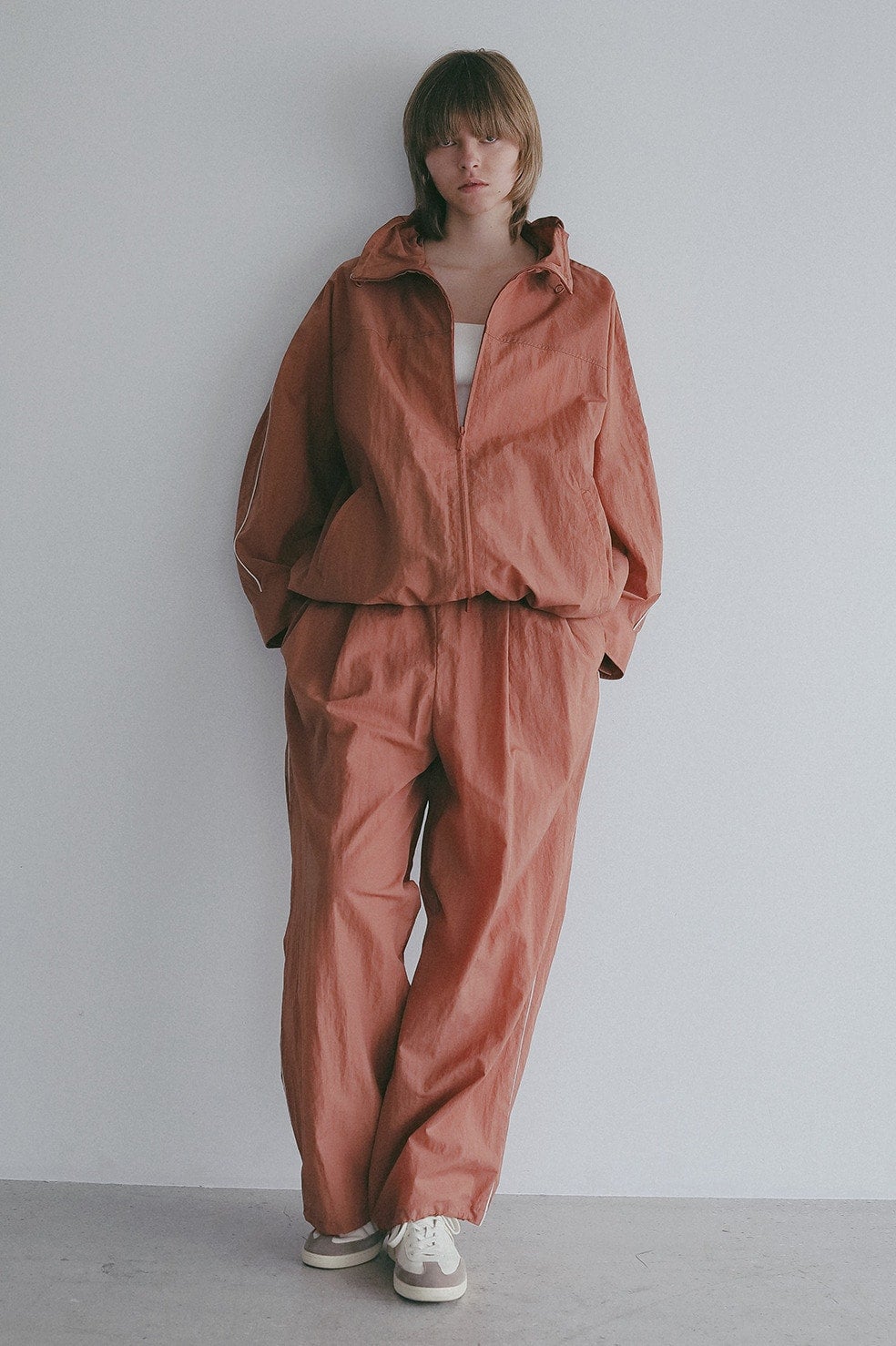 同素材のブルゾンとのセットアップもおすすめです。