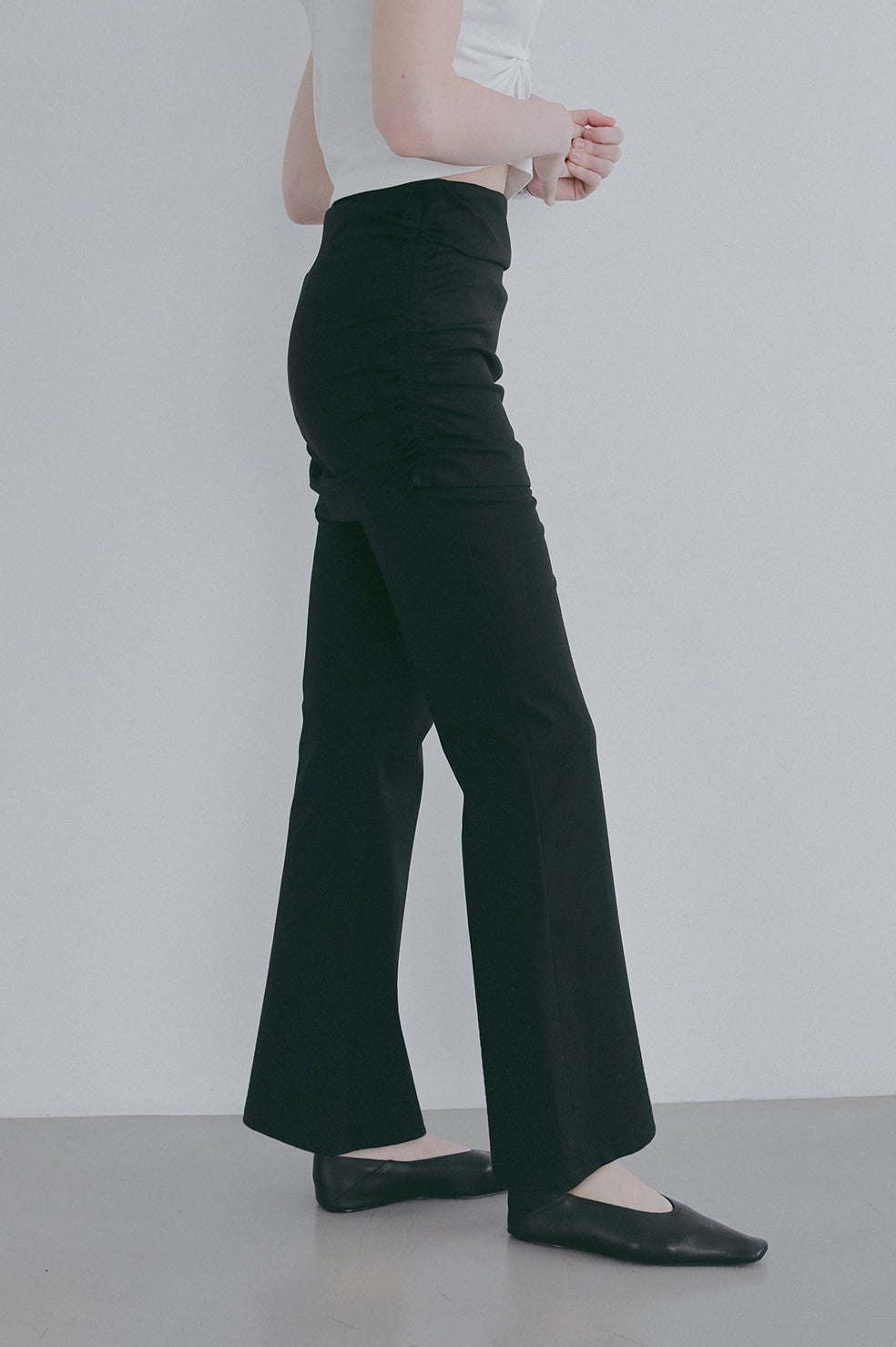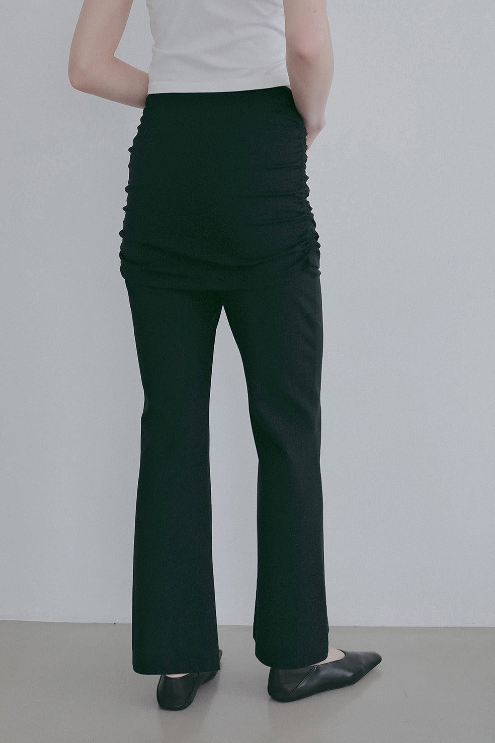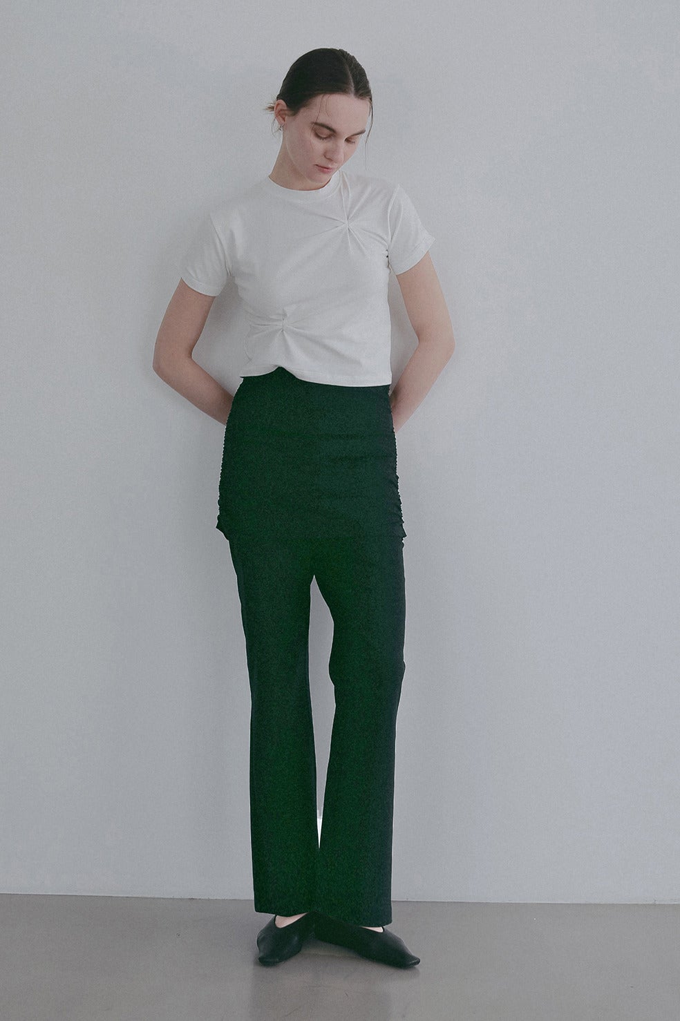 スカートはサイドにギャザーを入れ、タイトながらもヒップまわりをカバーしてくれるデザイン。