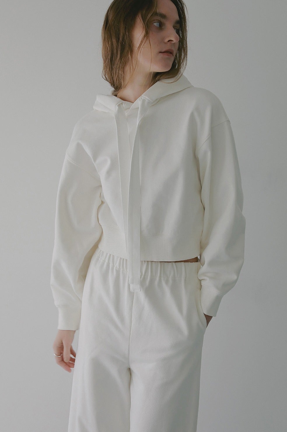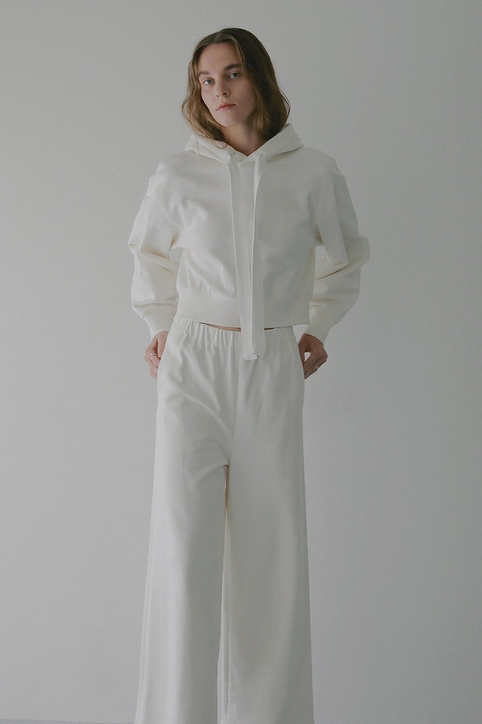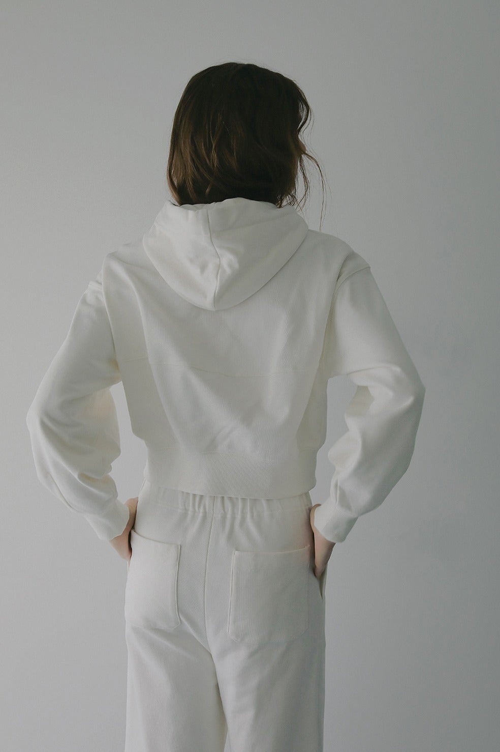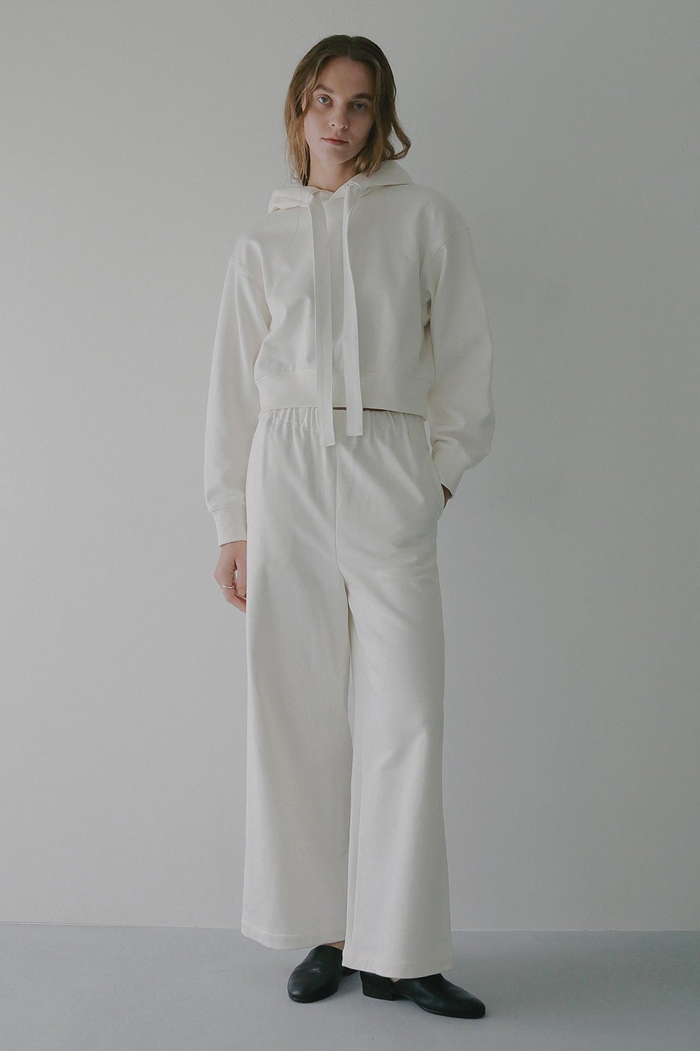 フーディースウェットとパンツのセットアップ。